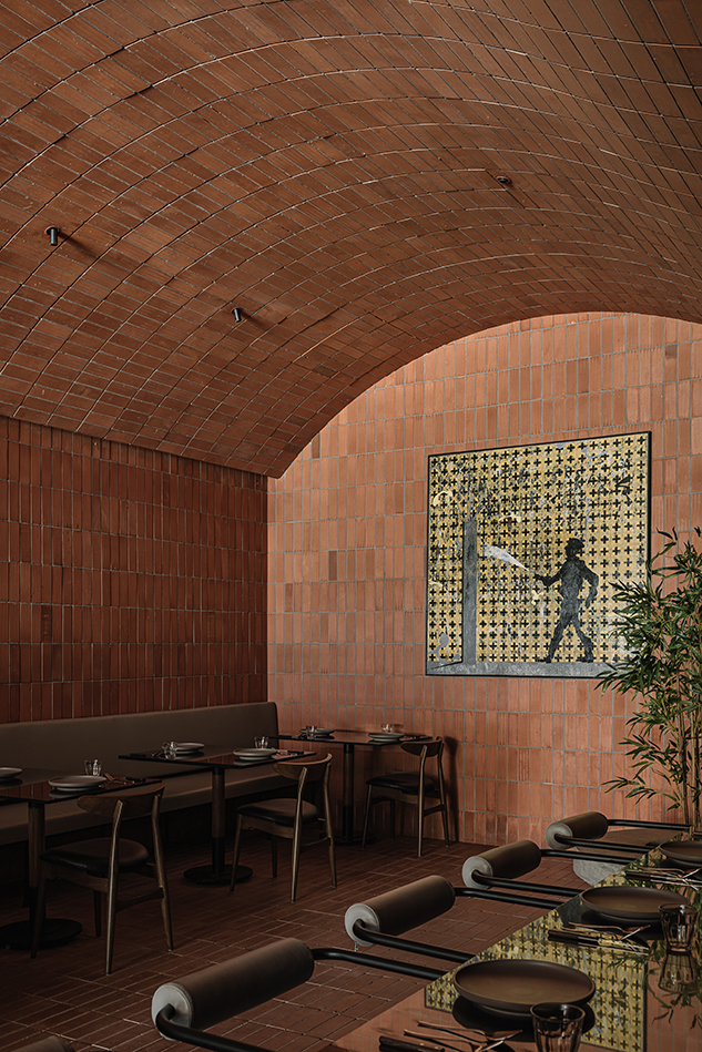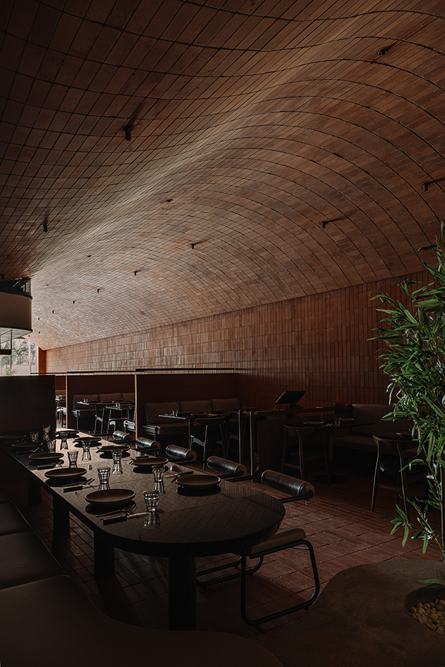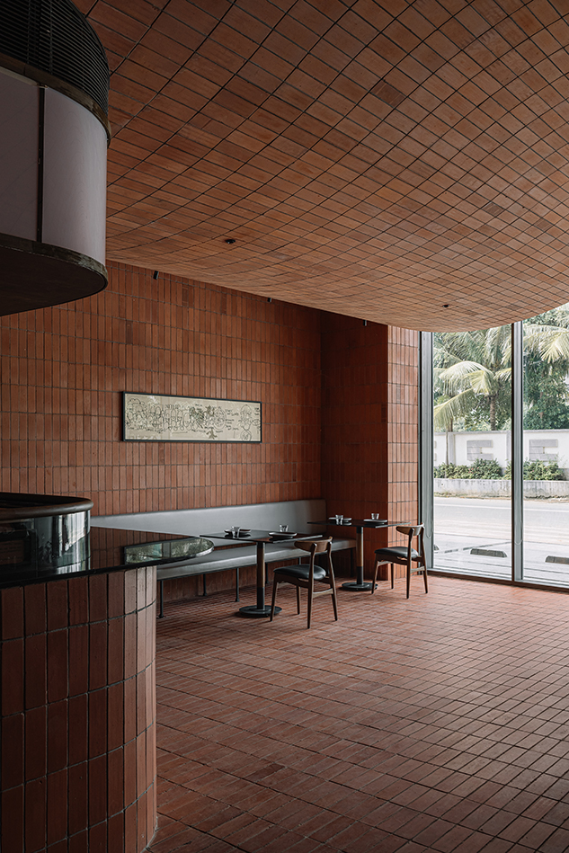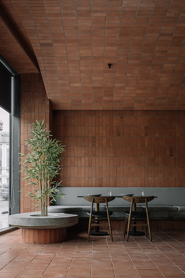 디자인의 핵심을 이루는 적갈색과 그을린 주황색 벽돌 마감재는 따뜻함을 발산하며, 손님들을 소박하면서도 세련된 분위기로 감싼다. 넓은 면적에 정성스럽게 배열된 벽돌은 시각적인 흥미뿐 아니라 촉각적인 요소도 더한다. 내부 가구는 이러한 분위기를 자연스럽고 단순한 미감으로 보완한다. 깨끗한 선과 자연스러운 마감의 테이블과 의자는 벽돌의 흙빛 색조와 조화를 이루며, 기능적이면서도 심미적인 디자인으로 전체 건축 언어와 경쟁하지 않고 어우러진다. 가구는 편안함과 동선을 고려해 배치되어, 손님들이 자연스럽게 머물 수 있는 공간을 완성한다.