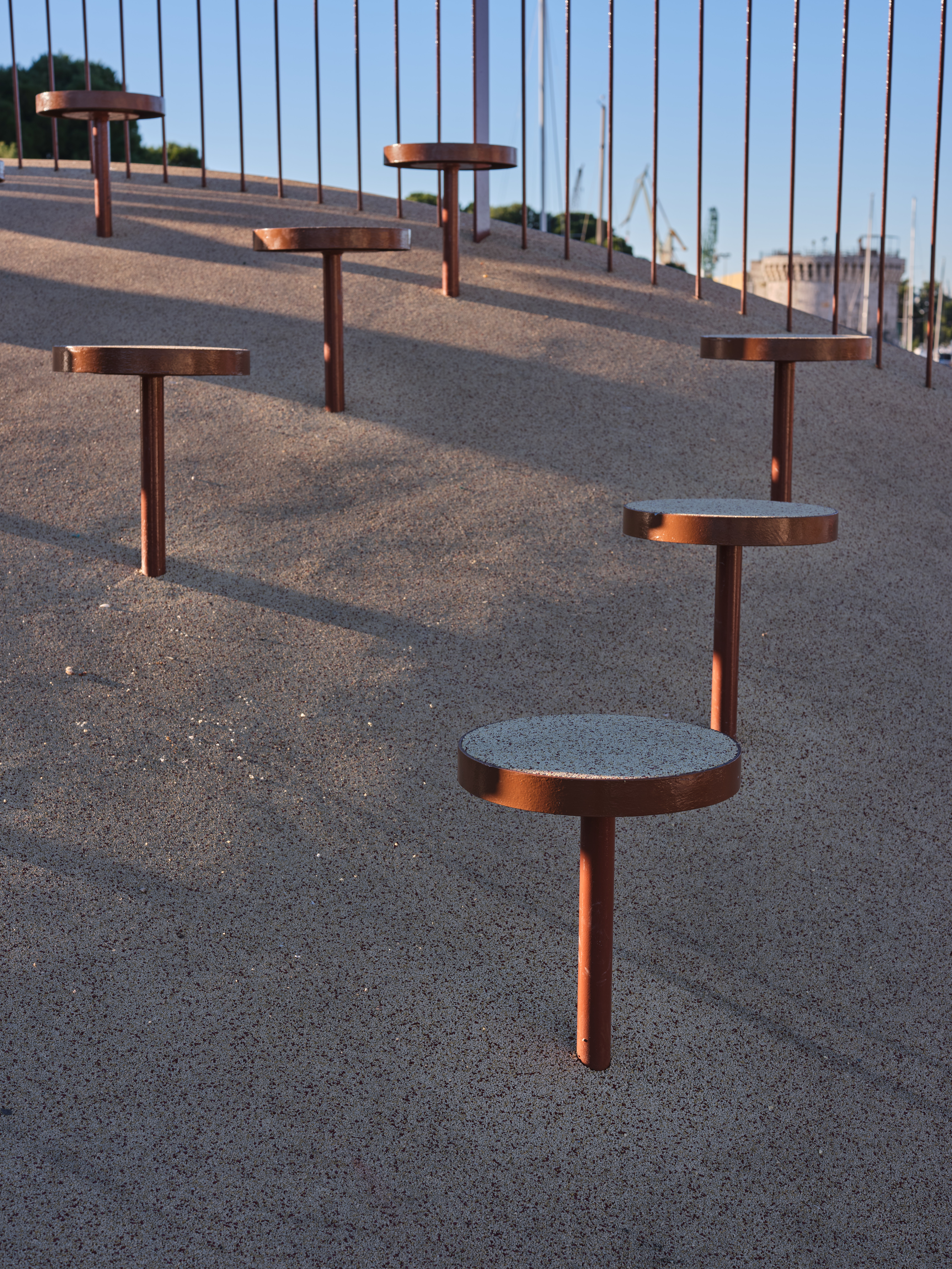 북쪽 경사면에는 좌석 공간이 배치되어 자발적인 모임과 휴식을 유도한다. 포르틴 공원을 마주보는 면에는 네트 형태의 천공 구조가 적용되어 앉거나 기대거나 놀이할 수 있는 공간을 제공하며, 상하부 공간 사이의 시각적 연속성과 개방감을 형성한다.
