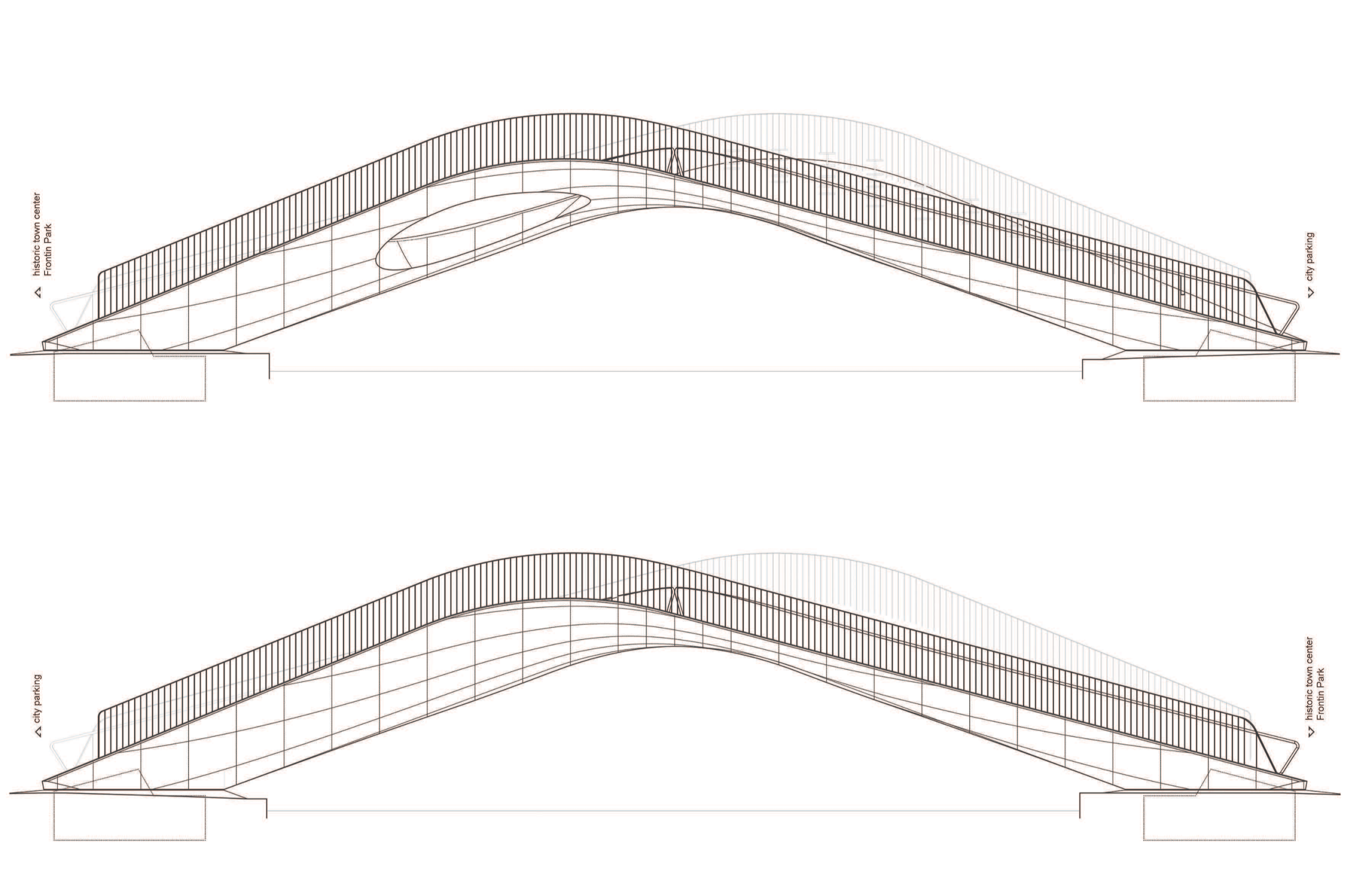 교량은 가변 단면의 비대칭 쌍곡면 형태의 강재 셸 구조로 설계되었다. 이로 인해 시각적으로 가볍고 섬세한 실루엣이 형성되며, 주변 경관을 방해하기보다는 한층 풍부하게 만든다. 교량의 가장 높은 지점은 도시의 역사적 스카이라인을 가리지 않으면서도 현대성을 부여하는 ‘보이지 않는 경계선’ 역할을 한다.