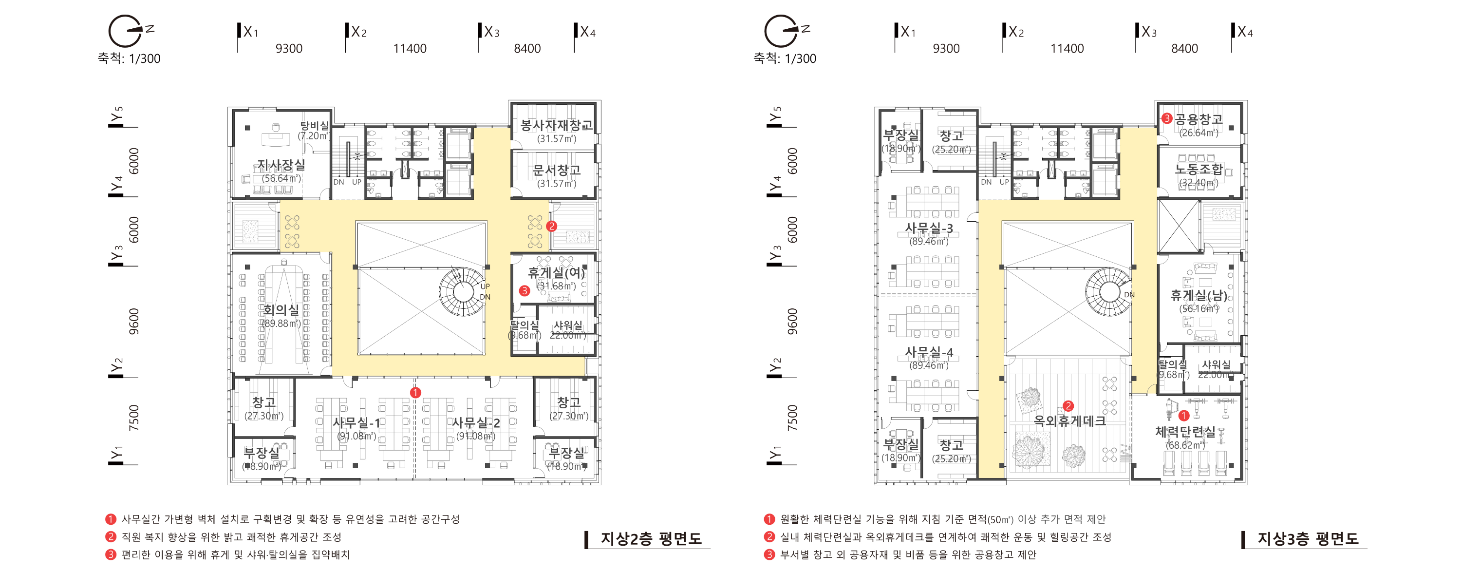 2층은 기능에 따라 사무영역과 휴게 및 편의 영역을 구분하여 조닝하여 효율적인 업무가 가능한 동선을 계획했다. 모든 실은 중정을 바라볼 수 있는 순환형 복도를 따라 배치되어 막힘없는 동선을 조성하였고, 중정공간에 조성된 녹지와 중심공간까지 끌어들인 자연광을 통해 밝고 쾌적한 내부환경을 만들어주었다. 채광을 고려하여 사무영역은 동향-남향에 이르는 공간으로 계획하고, 편의 및 코어를 서향-북향으로 위치시켜 순환동선을 통한 연결은 가능하지만 영역별 조닝을 통해 사무영역과 휴게영역을 구분하였다. 지사장실과 회의실은 인접배치하여 업무효율을 높여주었고, 사무실은 집약배치하여 부서별 필요에 따라 유연한 사용이 가능한 가변공간으로 계획하여 공간의 활용성을 높였다. 3층은 체력단련실의 폴딩도어를 통해 쉽게 접근 가능한 옥외공간을 통해 직원들이 편히 휴식할 수 있는 공간을 계획했다.