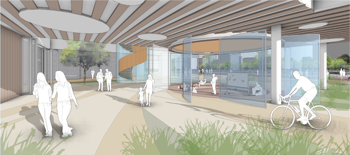 1층은 주민들과의 교류를 고려한 개방시설과 에너지 허브로 조성된 중정을 통해 다양한 형태로 연계될 수 있는 커뮤니티 공간으로 계획하였다. 전기안전에 관한 교육 및 홍보와 강연이 가능하고, 시민들이 찾아와 휴식하는 공간으로써 자연스럽게 시민들 의식속에 전기안전에 대한 인식이 각인되었으면 했다. 원형으로 계획된 커먼서클공간은 외부공간과 함께 부드러운 유선형의 길을 따라 중정을 가로지르는 동선을 형성하고, 스윙도어를 개방하여 내외부의 경계가 허물어진 공간감을 경험할 수 있도록 했다.
