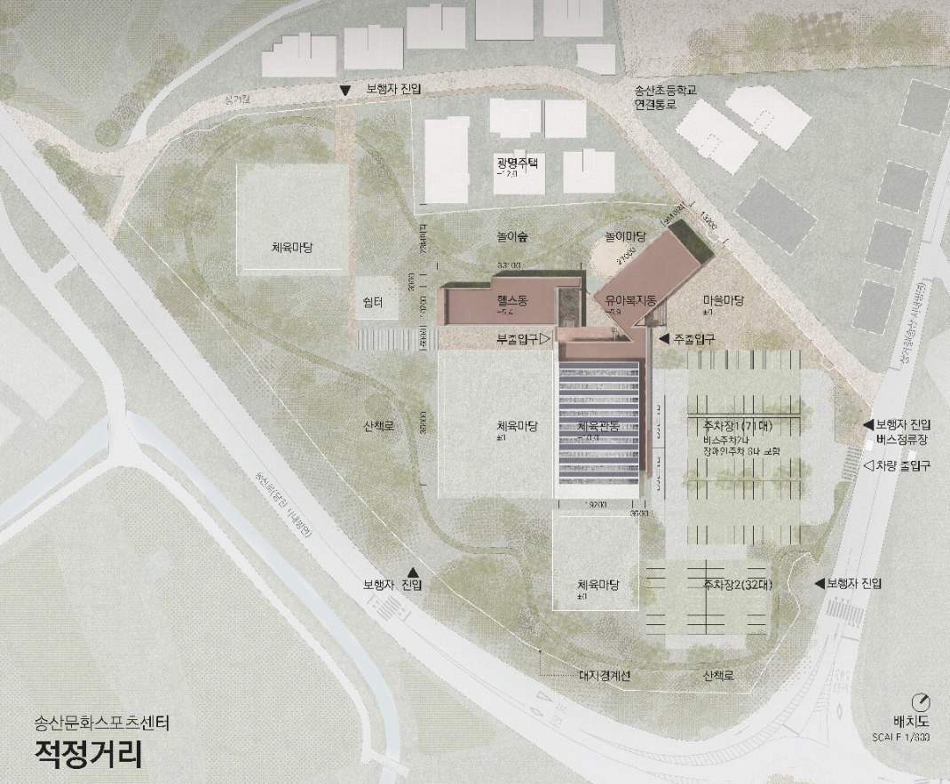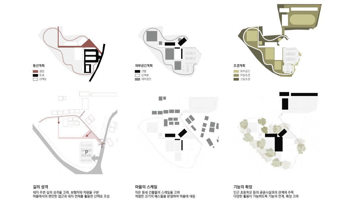 운영에 따라 다양한 공간으로 분절 될 수 있고 이용자의 선택에 따라 달라질 수 있는 동선을 두었다. 곳곳에 적극적으로 캐노피를 두어, 외부와 내부가 원활히 연계될 수 있도록 고려했다. 거대한 대지의 장점을 살려 땅 전체를 순환하는 산책로를 제안하며, 이 산책로는 외부 활동공간들과 닿아있다. 수목의 밀도를 조절하여 도로와는 적절히 차단되고, 내부를 향해 열려있는 쾌적한 마을 공원을 조성하고자 한다.