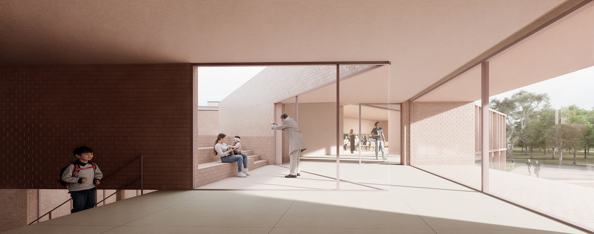 세 개의 매스가 만나는 곳의 중정은 엇갈린 시선의 교차를 통해 새로운 공간적 경험을 제공한다. 유아, 청소년, 성인 등 다양한 사용자의 특성에 맞춰 계획한 내부공간들은 야외 놀이터, 마을마당, 외부 활동공간 등과 연계된다.