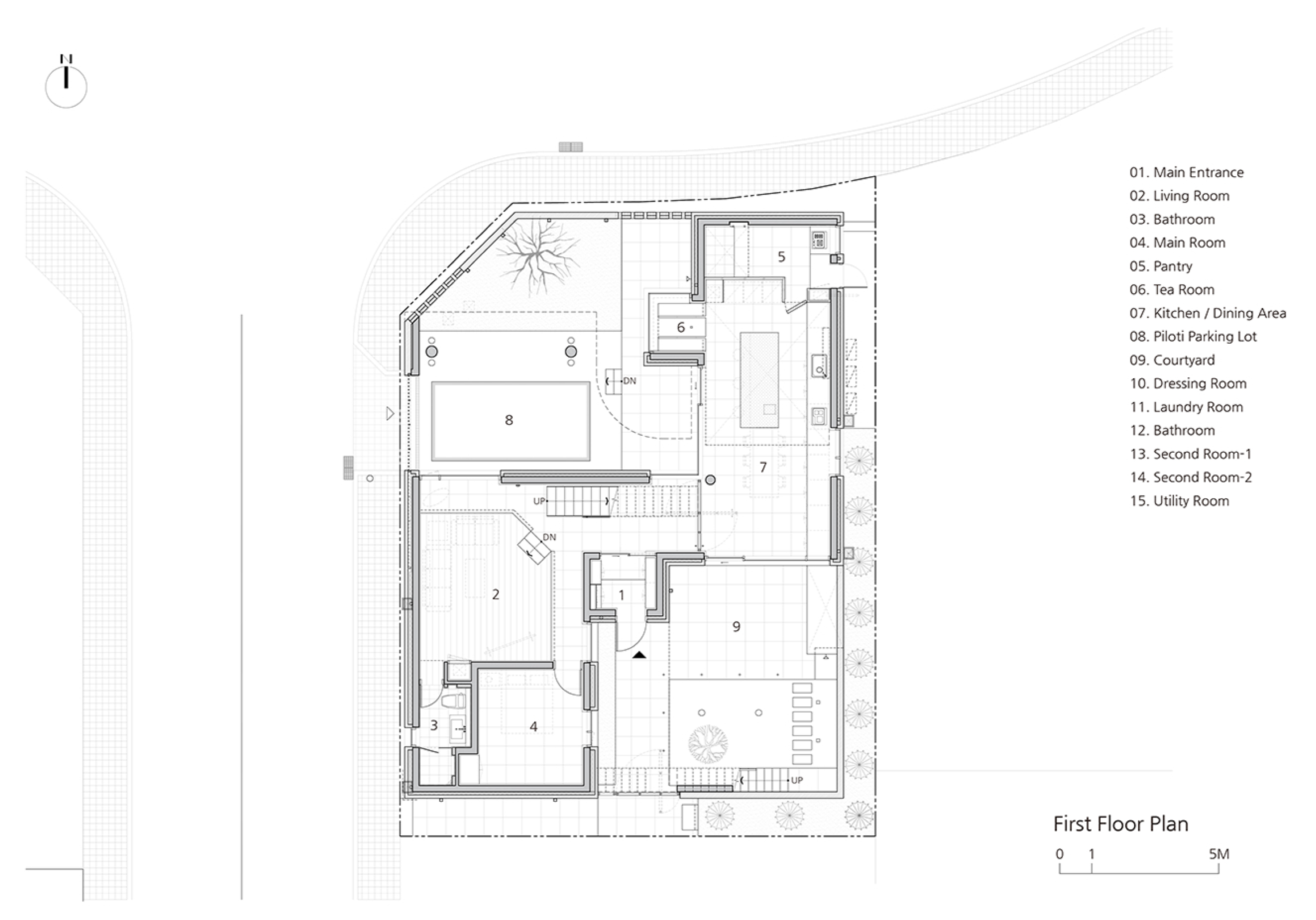 2층 곡면 벽의 천창은 부드러운 자연광을 유입하여 실내 조경을 비추고 태양의 궤적에 따라 움직이는 그림자가 벽에 새겨지며 시간의 흐름을 담아낸다. 이 집은 현관 중심의 출입 통제, 공간들의 기능 고착화, 하부구조에 의존하는 상부구조 등과 같이 종래 여러 집에서 나타나는 전형성에 대한 비판적 시각을 담고 있다. 그로 인해 위계가 관습으로부터 멀어지고 자유롭고 수평적인 문화를 존중하는 가족 구성원에게 어울리는 거주환경을 만들어 내고자 하였다.
