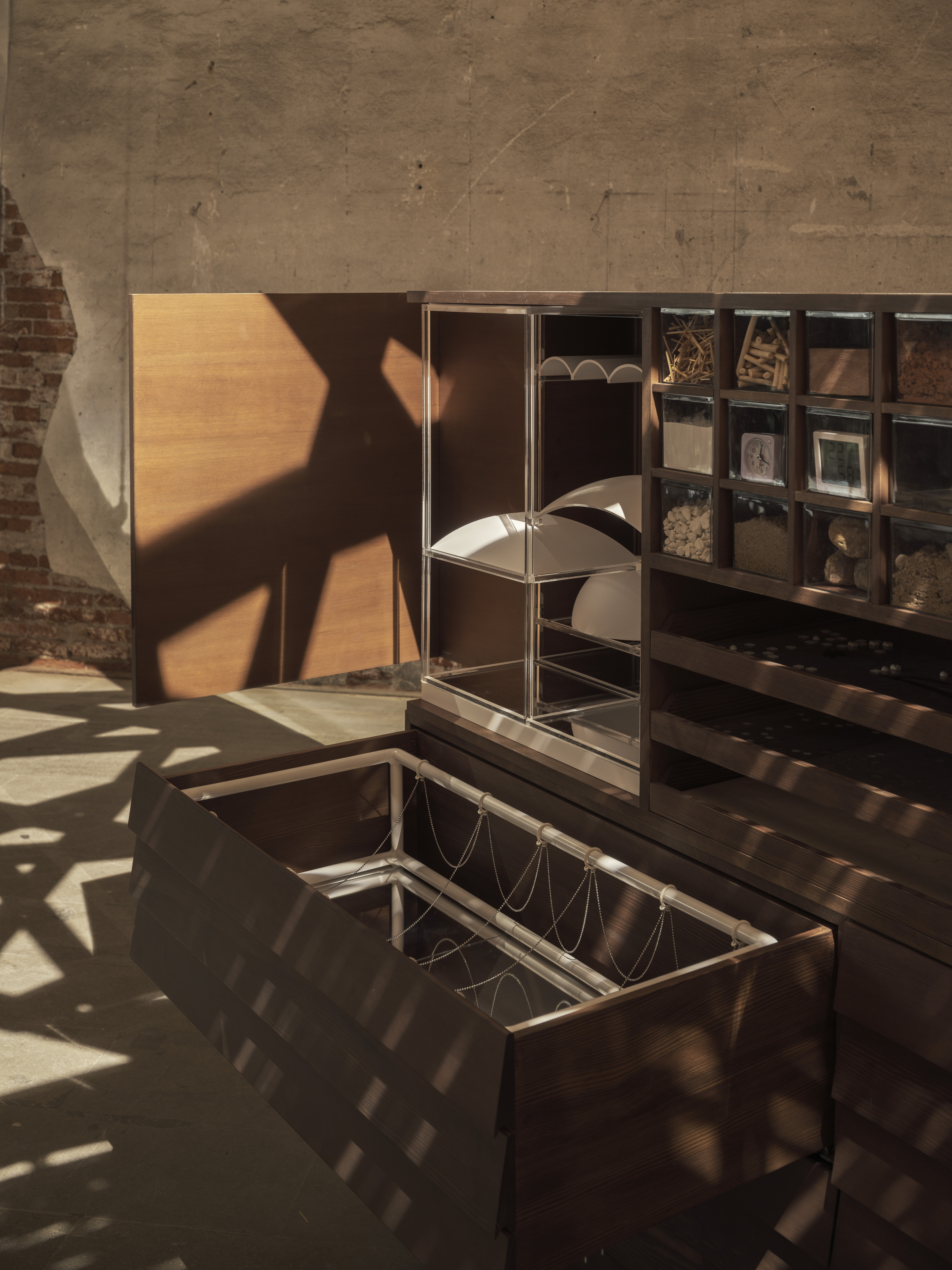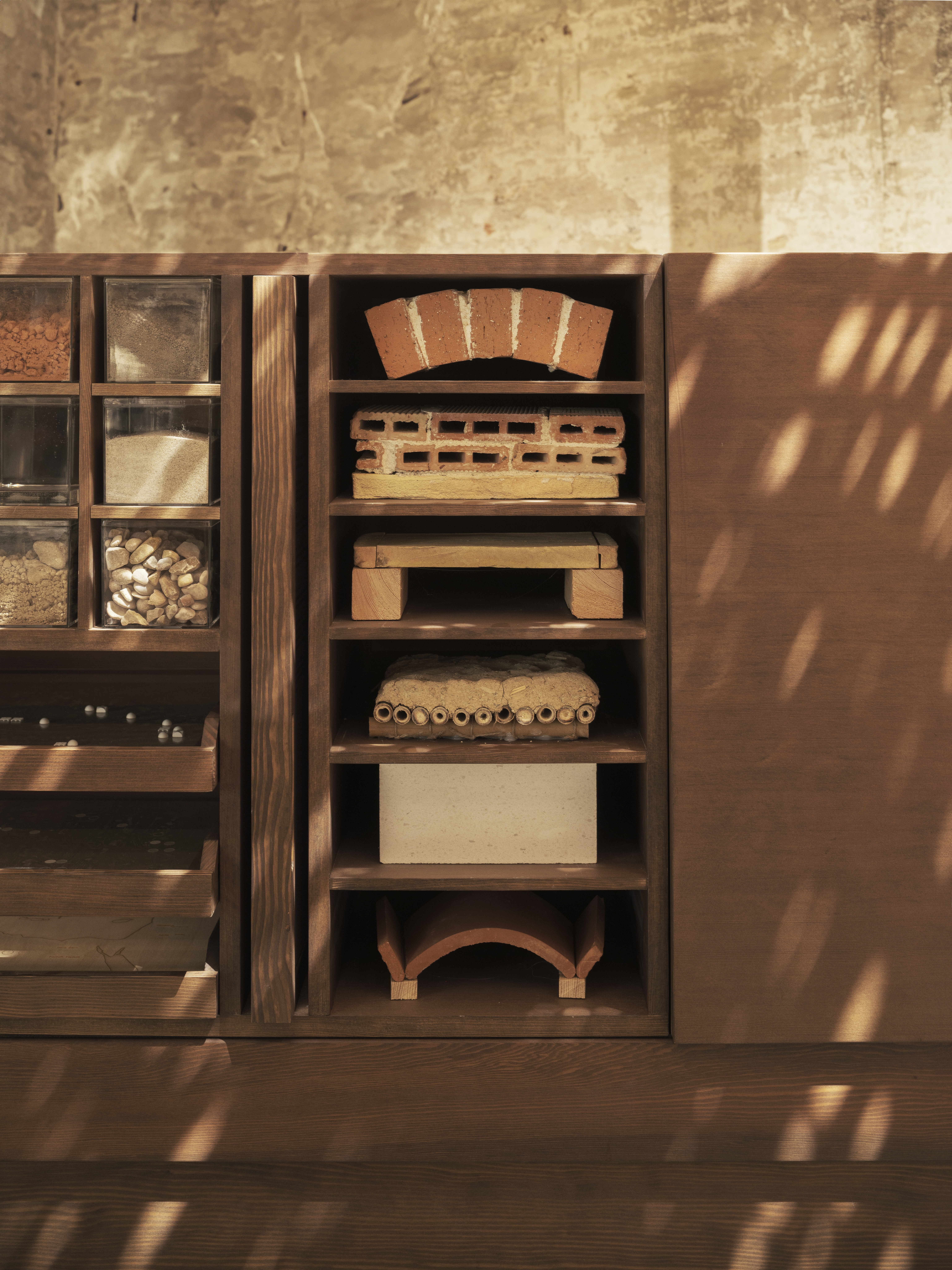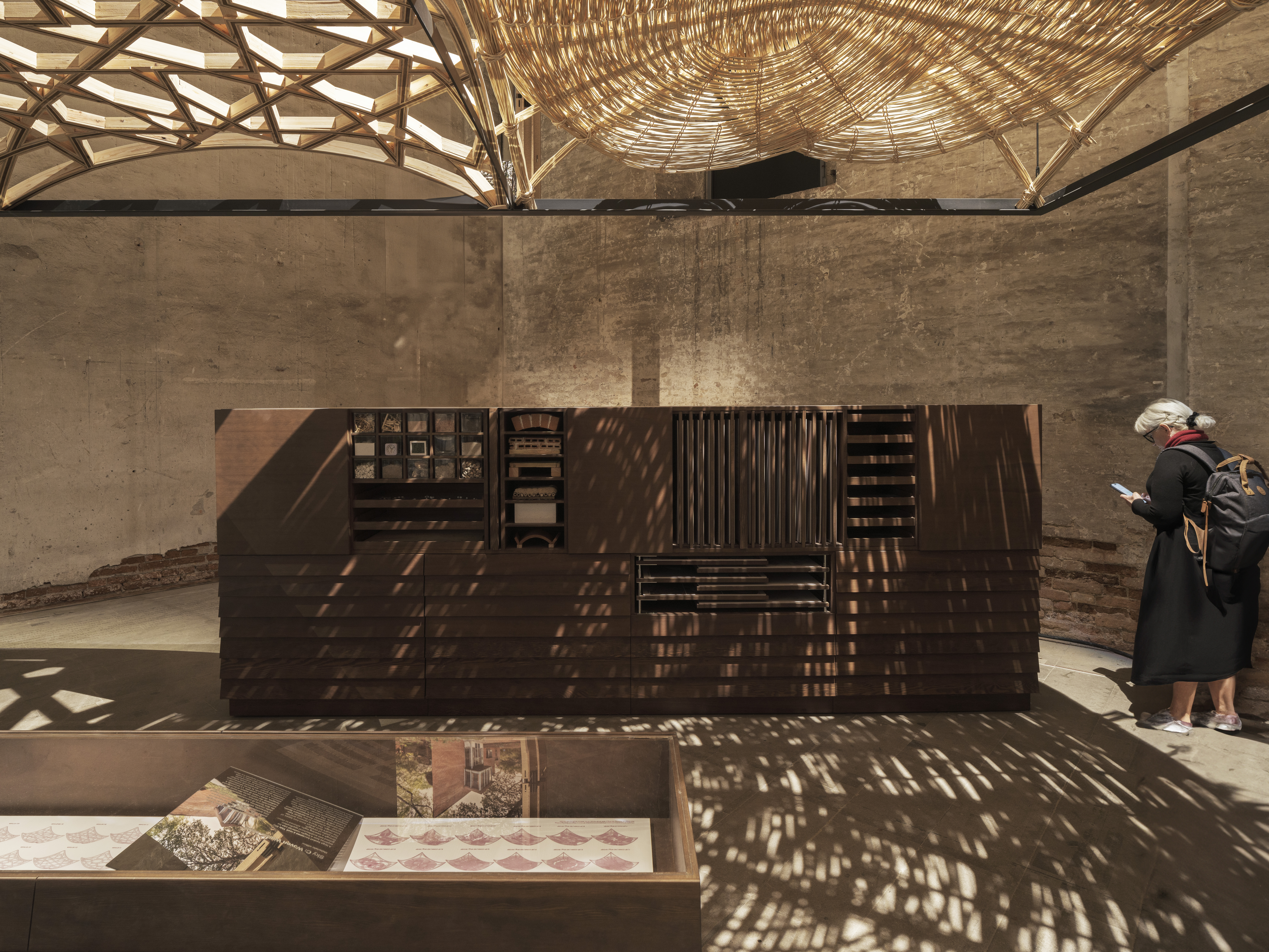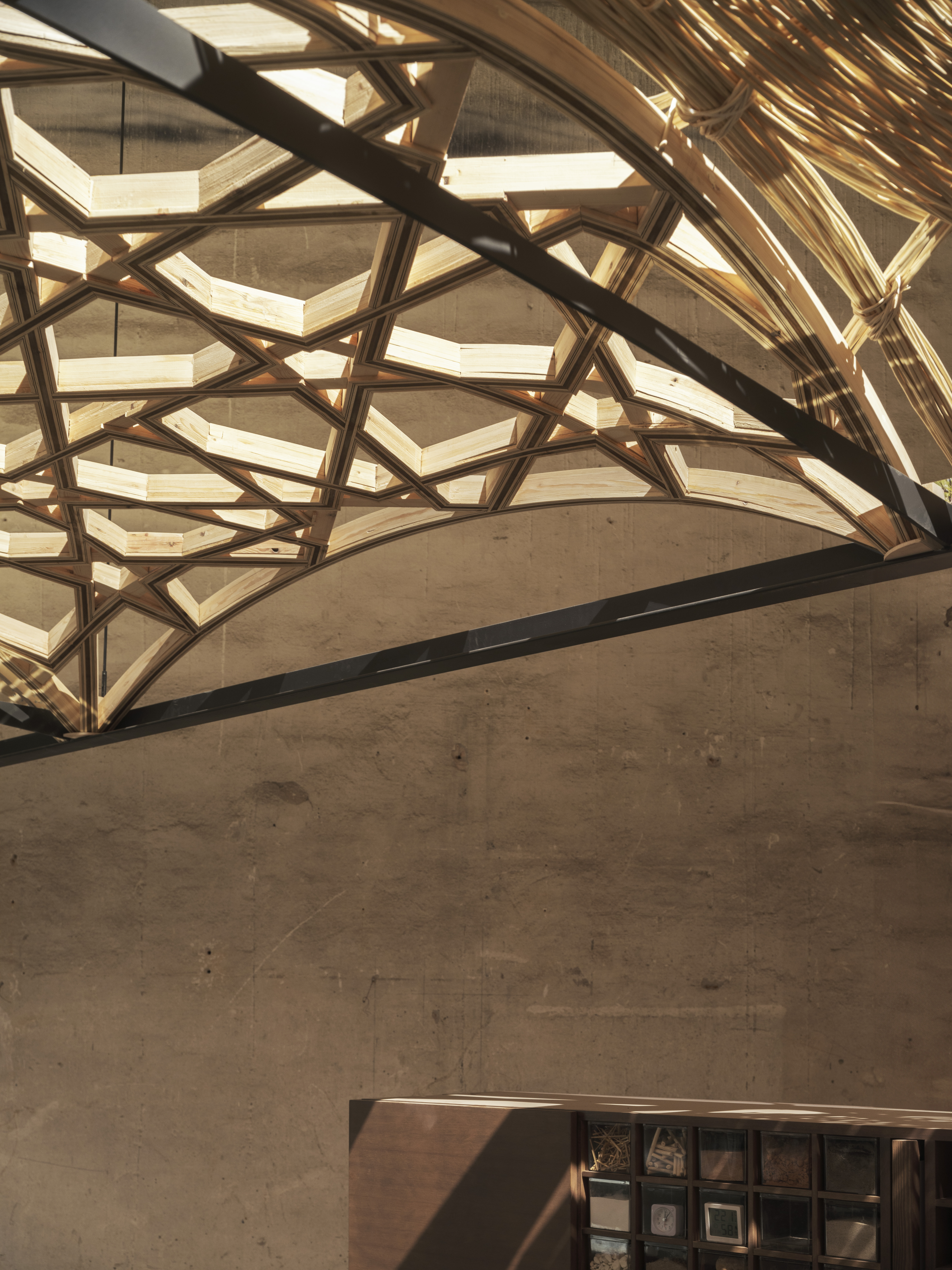 아케이드 아래 ‘Alternative Skies 아카이브’는 두 개의 평행 캐비닛으로 구성되어 관찰과 학습을 유도한다. IE 건축디자인대학 d-Lab과 함께 개발되었으며, 건축학 학사 과정 학생들과 웨삼 알 아살리가 공동 설립한 IWLab이 참여했다. 이 아카이브는 이집트의 흙비둘기탑부터 시리아의 코벨 돔까지 다양한 전통 지붕 기법을 소개하며, 장소 기반 기술의 창의성과 효율성을 보여준다. 이는 지역 지식과 현대적 혁신이 만나 지속가능한 건축을 형성할 수 있음을 시사한다.
