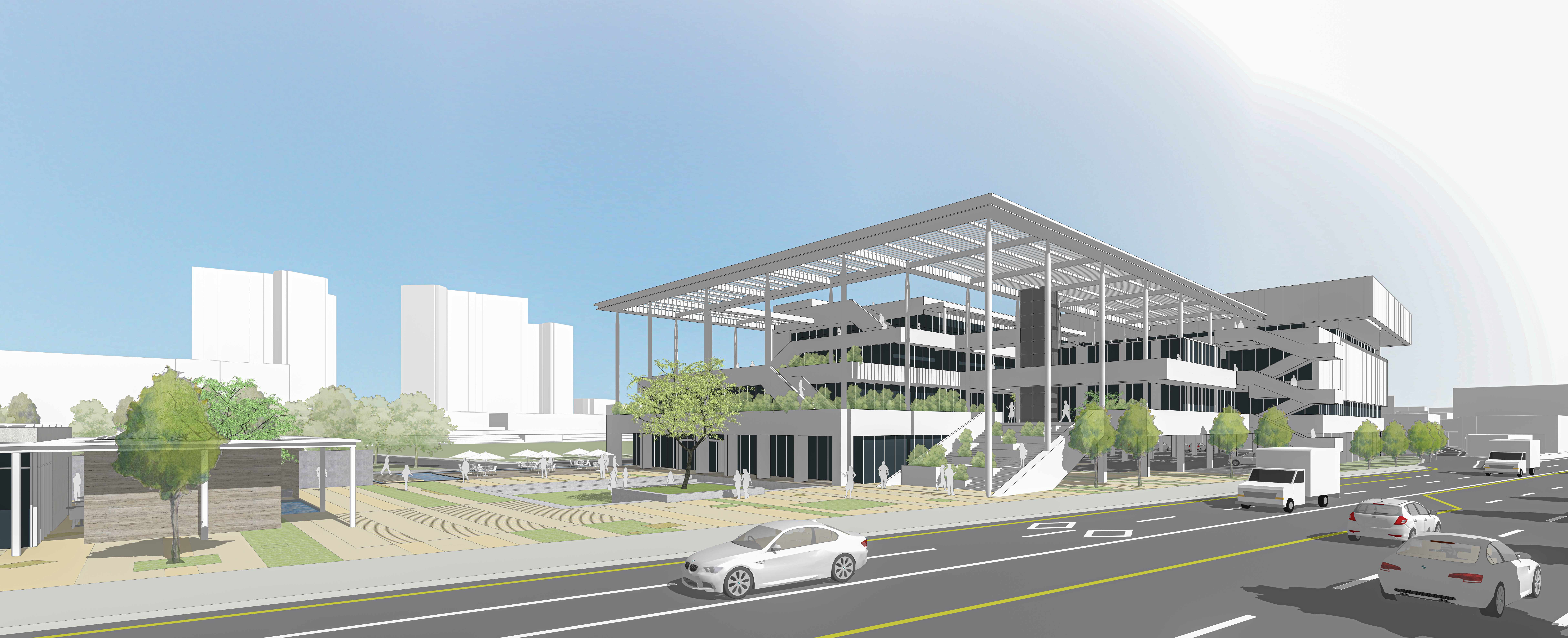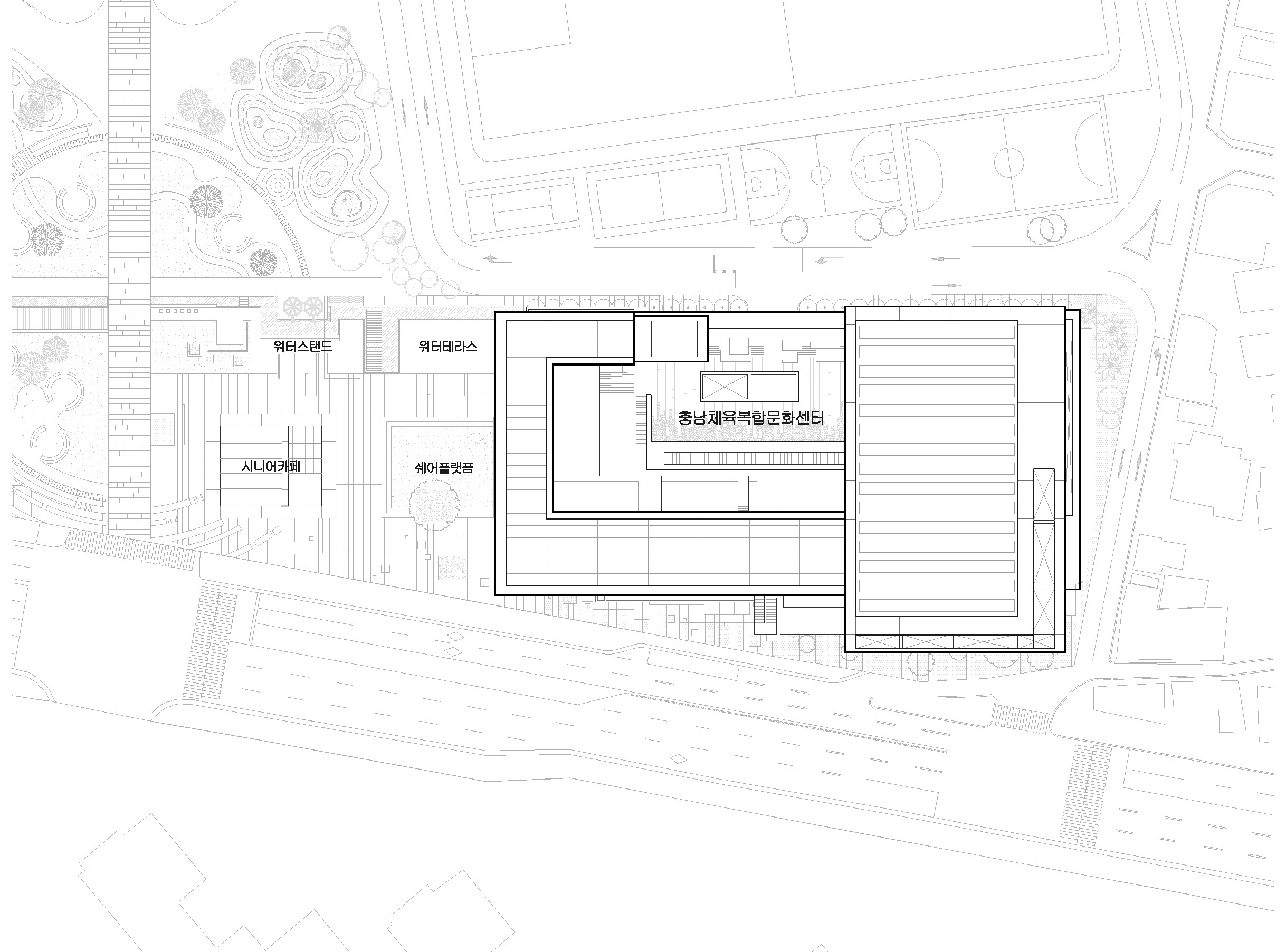 충남 체육문화복합센터는 공원과 함께 계획하는 것을 통해 자연의 흐름을 연결하며 경계를 허물어야 한다. 우리는 시각적·물리적으로도 경계를 허무는 것을 통해 서로를 스며들게 하는 한 흐름 안에 있도록 계획했다. 스텝형 매스와 루프 구조를 활용하여 외부 공간이 실내로 확장되고, 다양한 레벨의 외부 공간은 공원과 건물이 유기적으로 스며드는 공간 흐름을 가지질 수 있도록 구성하였다.