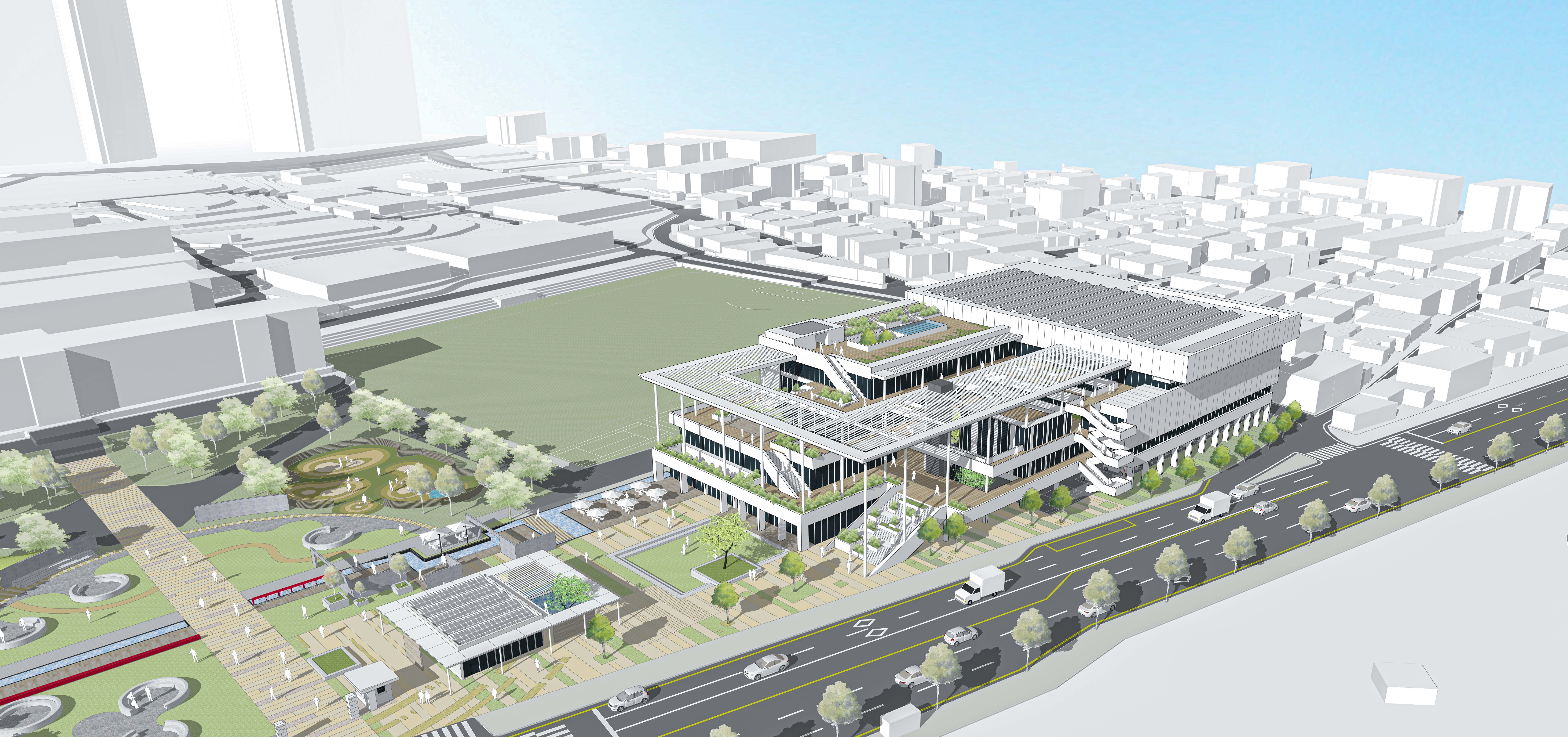 기존의 학교는 담장으로 인해 지역 사회와 단절되어 있다. 우리는 학교의 경계부를 허물고, 공원을 매개로 마을과 자연스럽게 이어지도록 계획했다. 공원은 단순한 외부공간이 아니라 일상 속에서 학생과 주민이 함께 사용하는 공동의 마당이 되며 학교는 이웃과 교류하고 열린 관계를 형성하는 커뮤니티의 중심으로 재정의되고, 공공성을 회복한 학교는 마을과 일상을 공유하는 플랫폼이 된다.