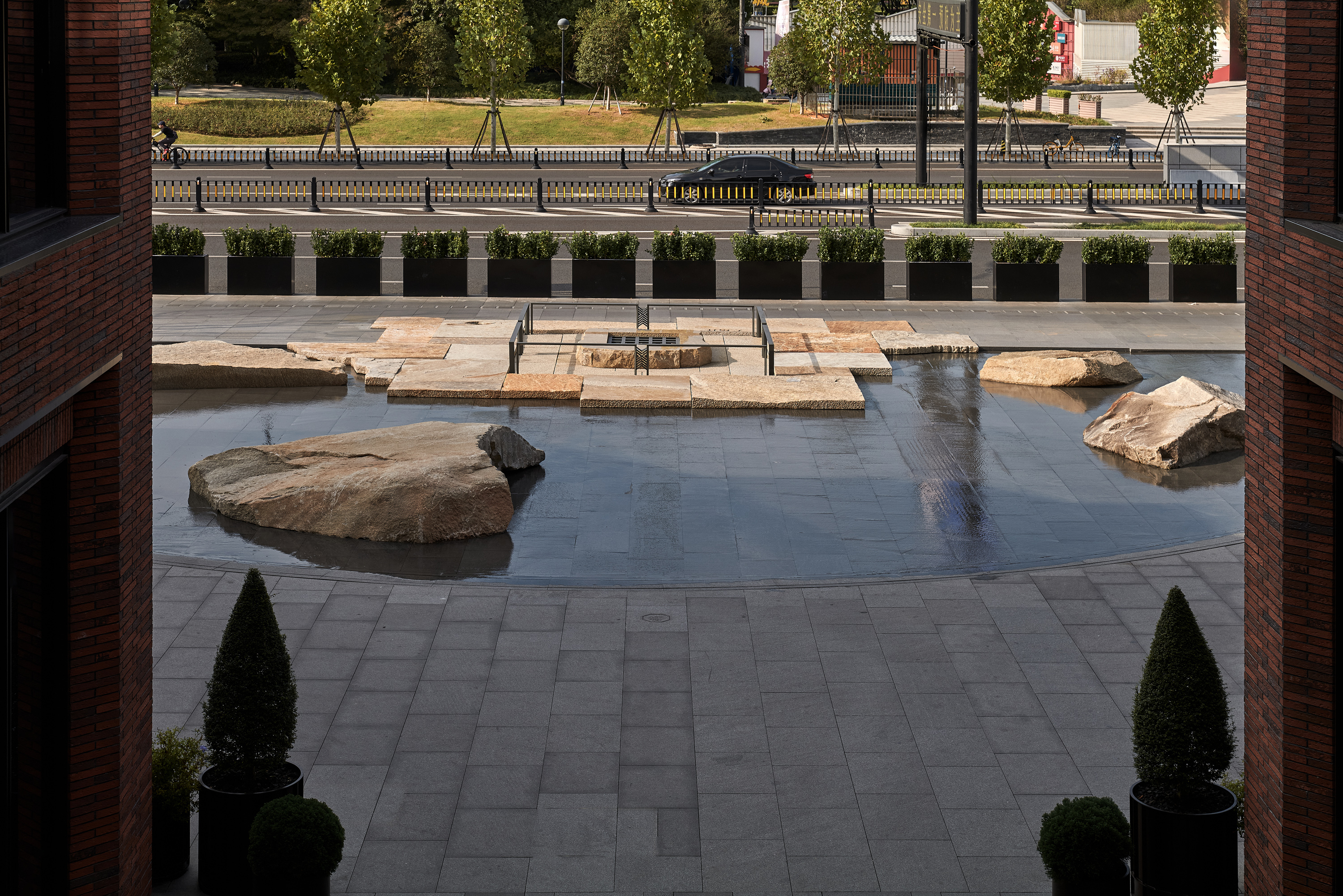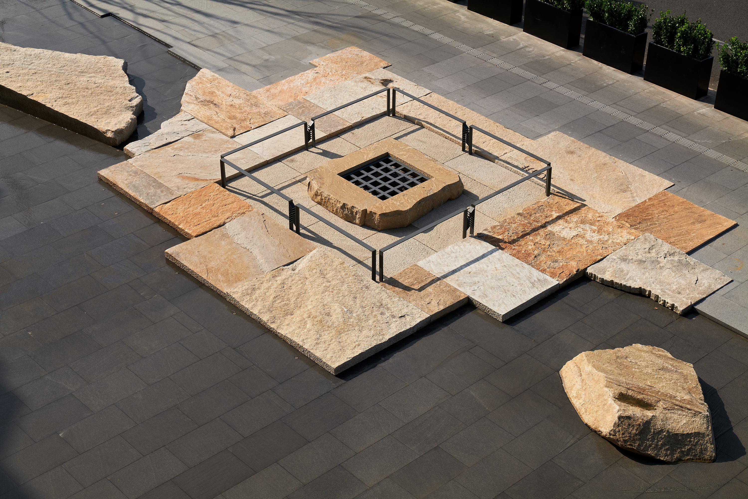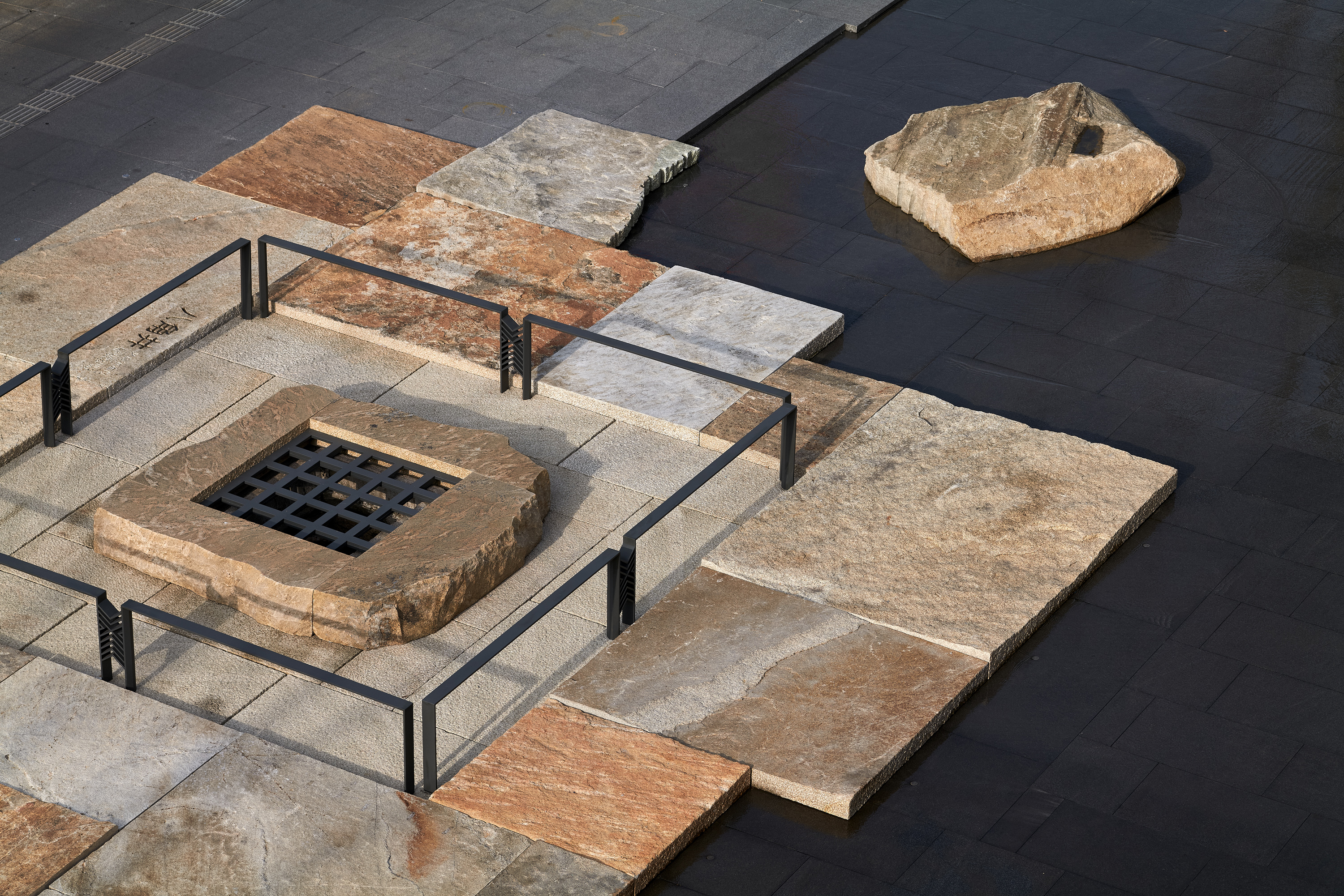 상부에서 내려다본 광장은 균열진 석재 표면처럼 읽힌다. 포장은 우물로부터 바깥 방향으로 부드럽게 갈라지며, 대륙이 이동하는 지각의 흐름을 연상시킨다. 돌들은 의도적으로 변화 있는 방식으로 맞물려, 의식적이면서도 서사적인 리듬을 만든다. 그 높이와 비율은 세심하게 조정되어, 시각적 감상과 물리적 체험을 동시에 가능하게 한다. 얕은 반사 수공간은 움직임과 빛을 더한다. 외곽 호(弧)는 간결하고 현대적이며, 내부 곡선은 부드럽고 유기적이다. 이는 기억과 현대성, 폐허와 재생 사이의 대화를 비춘다.