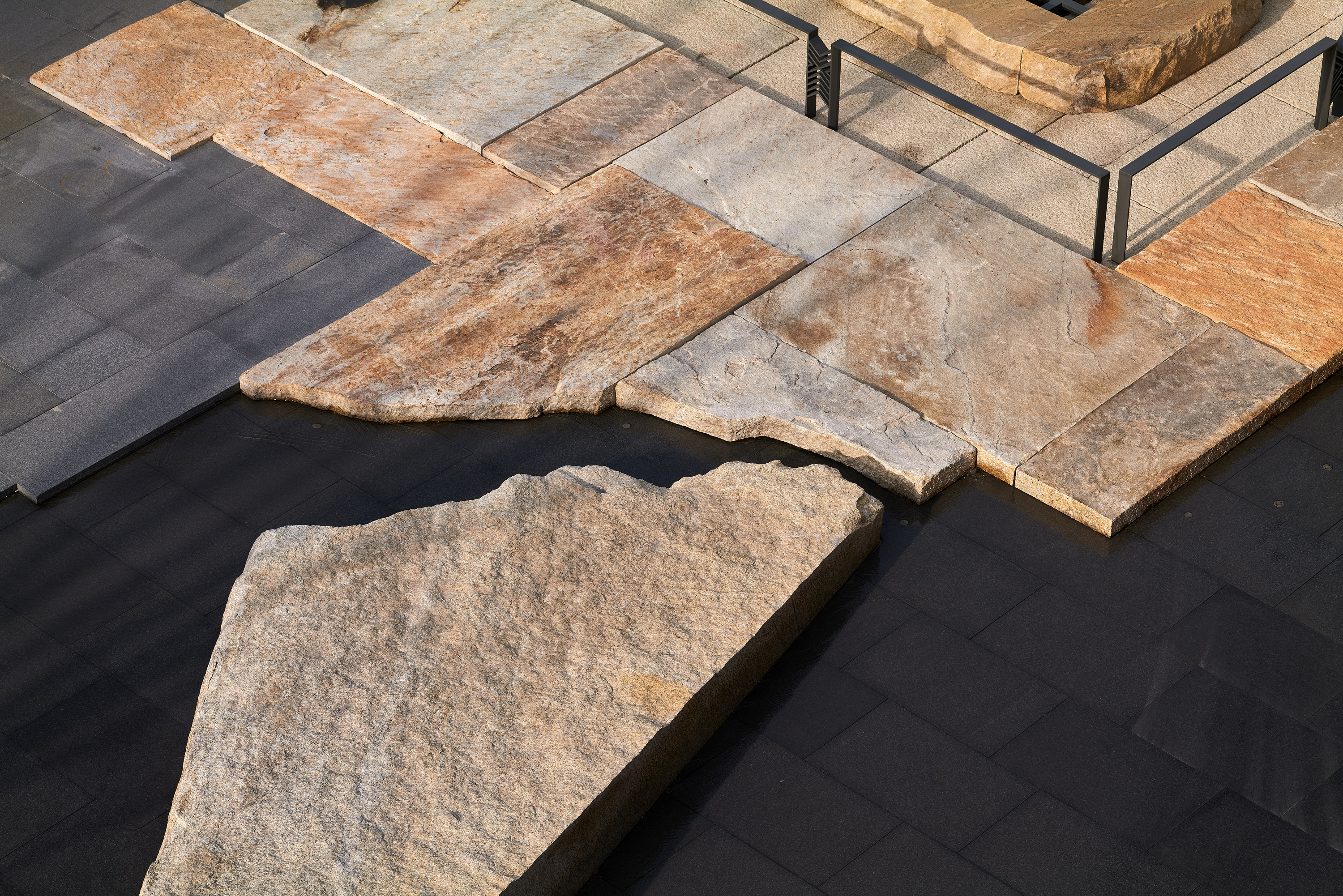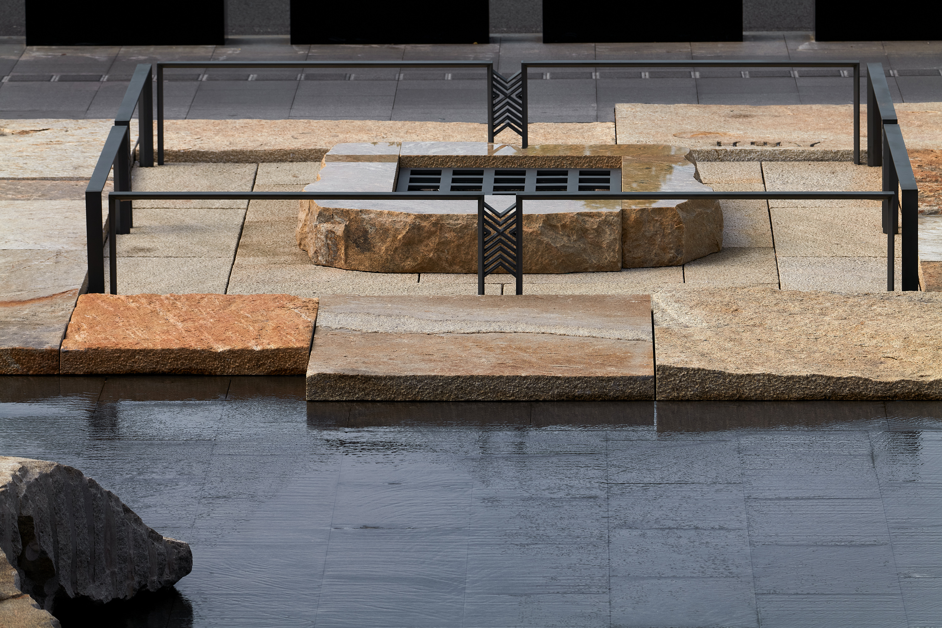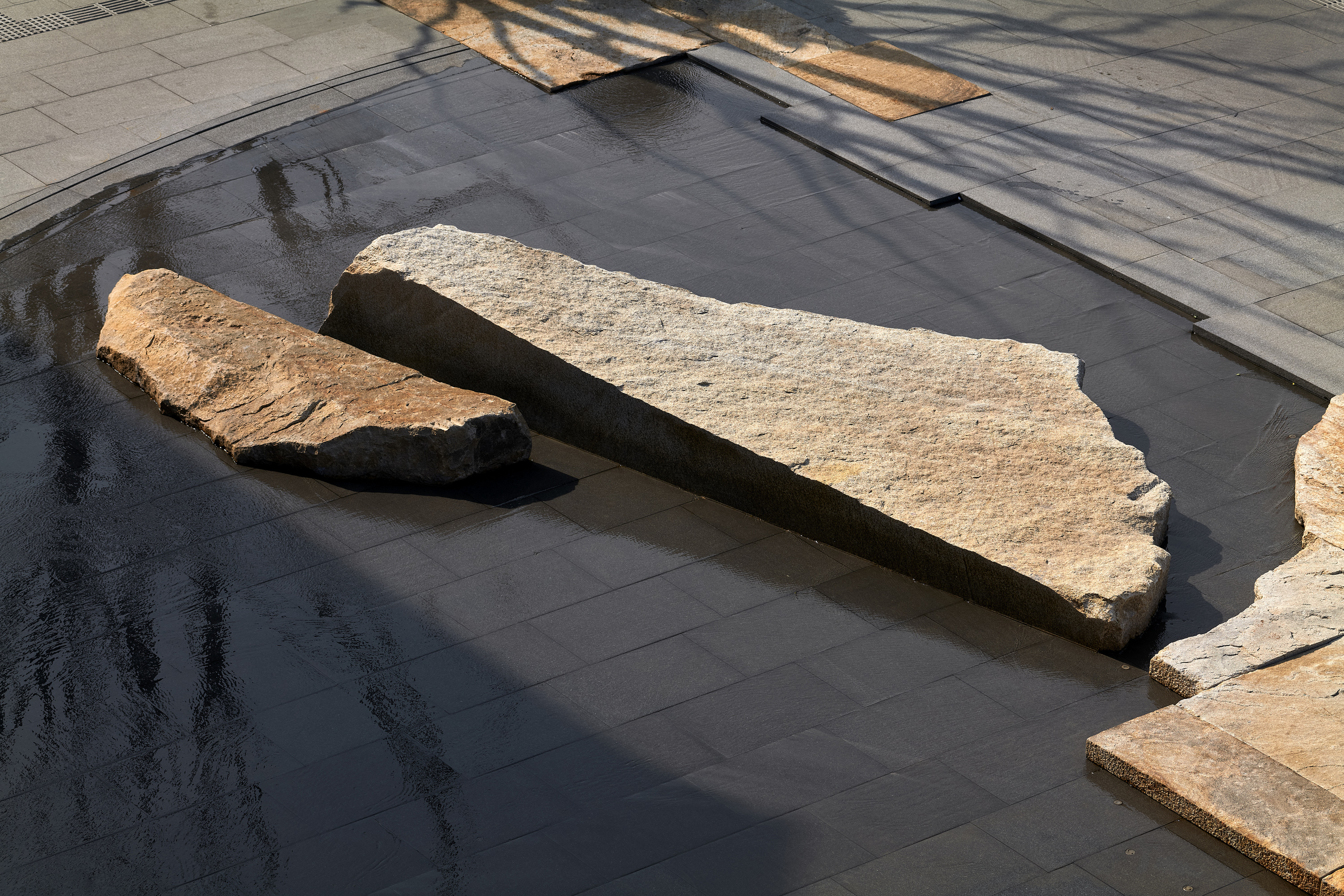 상부에서 내려다본 광장은 균열진 석재 표면처럼 읽힌다. 포장은 우물로부터 바깥 방향으로 부드럽게 갈라지며, 대륙이 이동하는 지각의 흐름을 연상시킨다. 돌들은 의도적으로 변화 있는 방식으로 맞물려, 의식적이면서도 서사적인 리듬을 만든다. 그 높이와 비율은 세심하게 조정되어, 시각적 감상과 물리적 체험을 동시에 가능하게 한다. 얕은 반사 수공간은 움직임과 빛을 더한다. 외곽 호(弧)는 간결하고 현대적이며, 내부 곡선은 부드럽고 유기적이다. 이는 기억과 현대성, 폐허와 재생 사이의 대화를 비춘다.