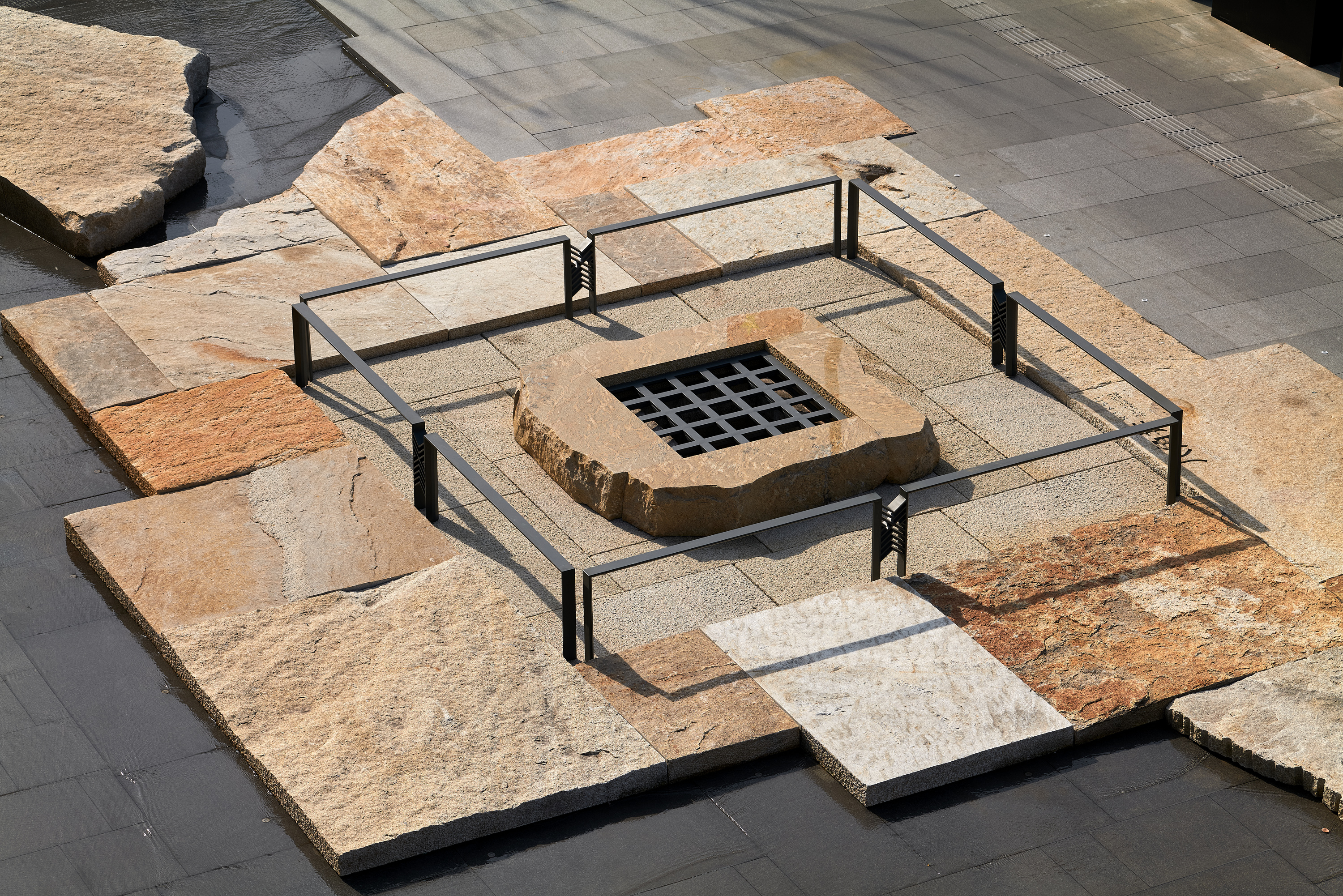 상부에서 내려다본 광장은 균열진 석재 표면처럼 읽힌다. 포장은 우물로부터 바깥 방향으로 부드럽게 갈라지며, 대륙이 이동하는 지각의 흐름을 연상시킨다. 돌들은 의도적으로 변화 있는 방식으로 맞물려, 의식적이면서도 서사적인 리듬을 만든다. 그 높이와 비율은 세심하게 조정되어, 시각적 감상과 물리적 체험을 동시에 가능하게 한다. 얕은 반사 수공간은 움직임과 빛을 더한다. 외곽 호(弧)는 간결하고 현대적이며, 내부 곡선은 부드럽고 유기적이다. 이는 기억과 현대성, 폐허와 재생 사이의 대화를 비춘다.