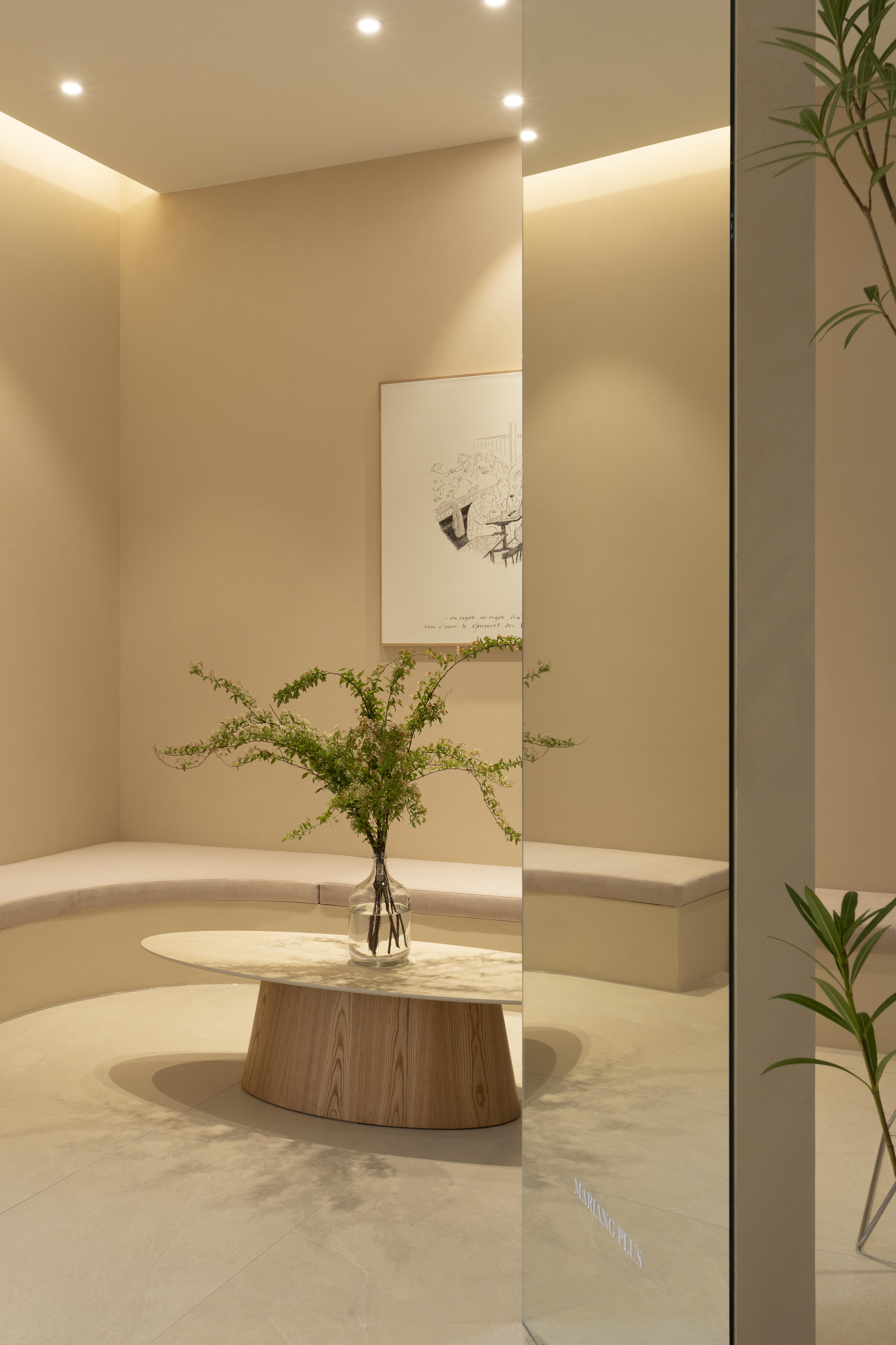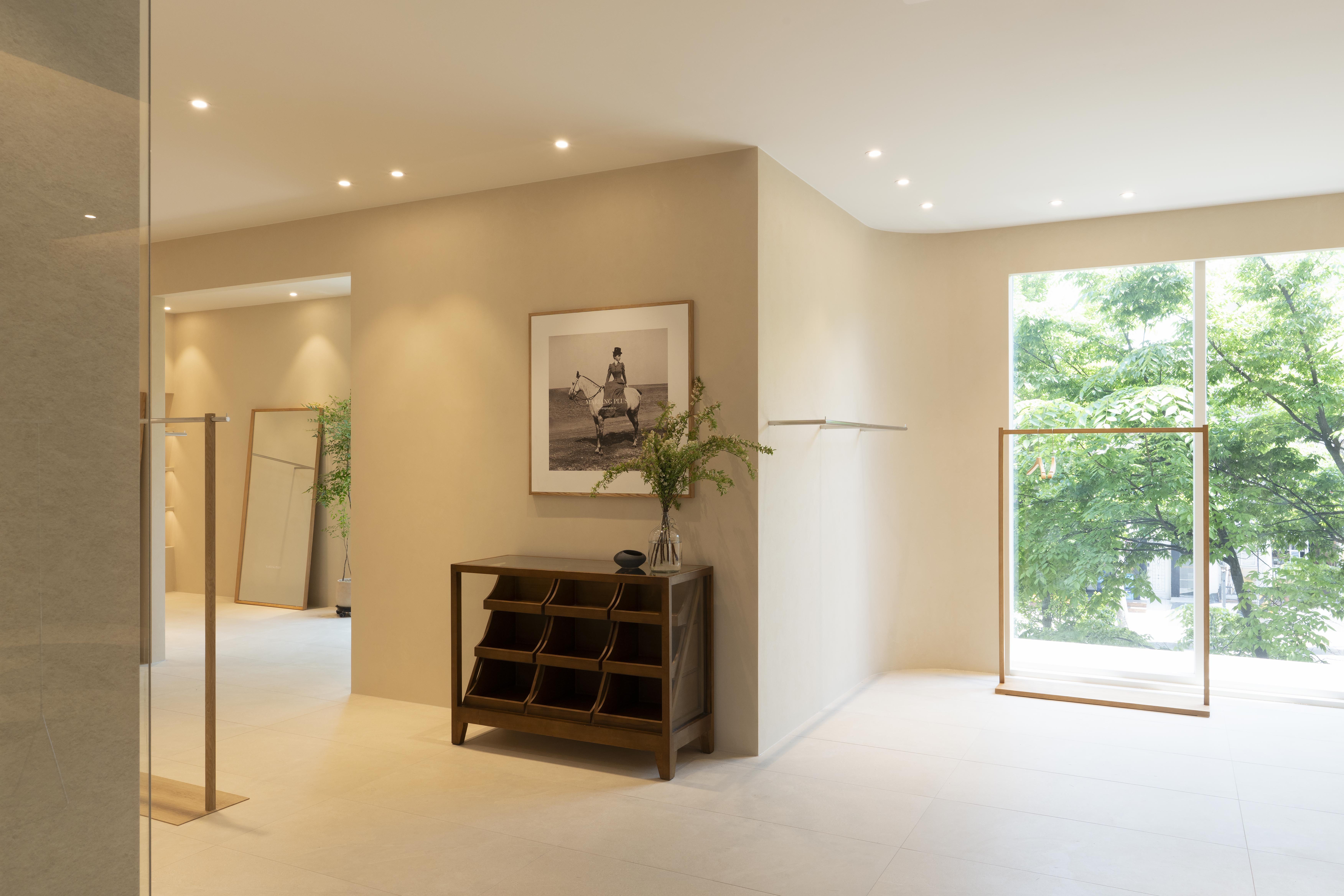 여성복 브랜드 마리앙 플러스 쇼룸은 자연의 온기와 브랜드 고유의 페미닌한 감성을 담아낸 공간이다. 초록빛 자연과 뉴트럴한 베이지 톤, 따뜻한 우드 톤을 조화롭게 사용해 브랜드의 아이덴티티를 공간에 구현했고, 지중해 감성의 여유로움과 우아함을 동시에 전달했다.