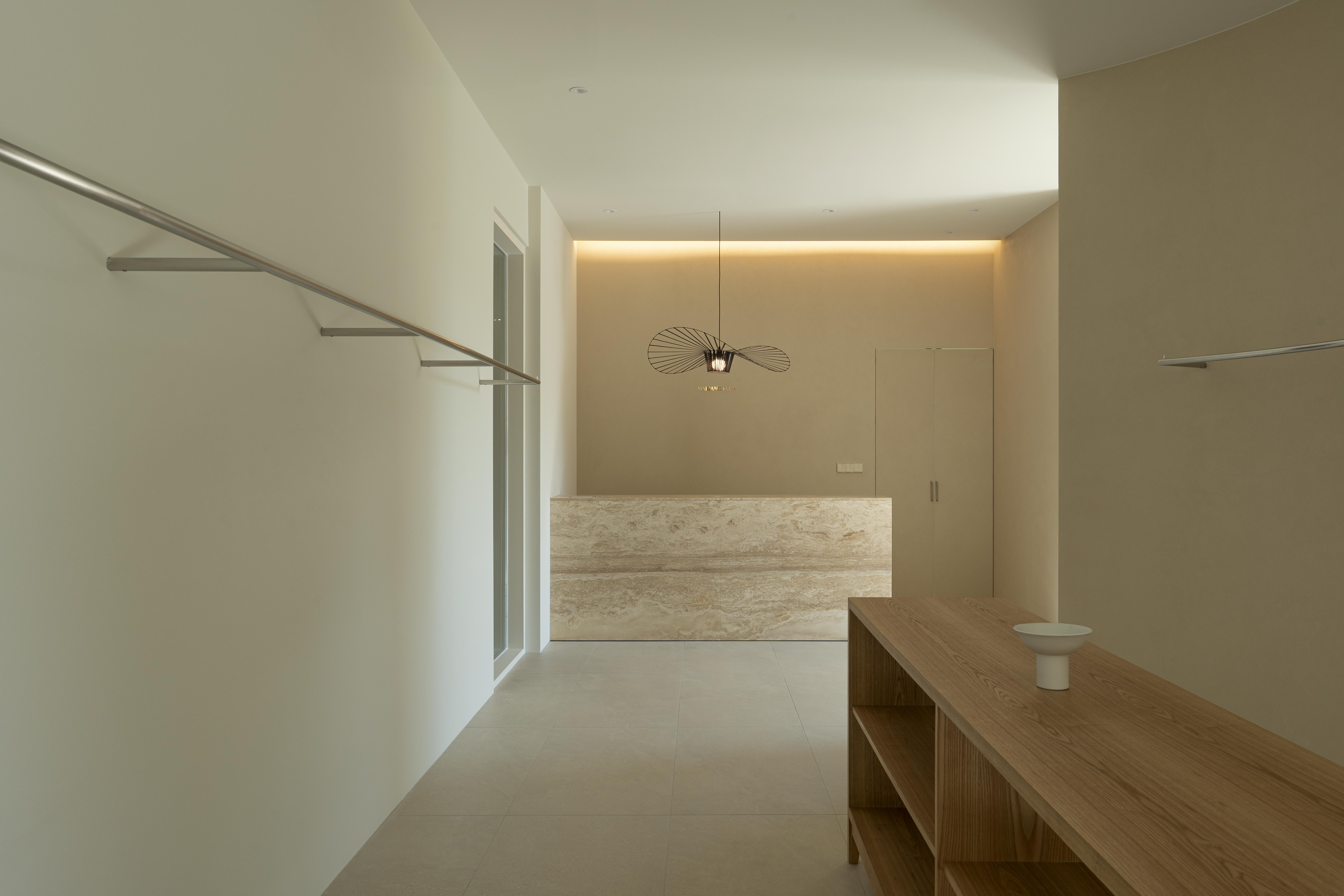 피팅룸은 고객 동선을 고려해 카운터 옆에 배치했고, 라탄을 연상시키는 지사 벽지로 마감해 공간 전체에 내추럴하고 코지한 분위기를 더했다. 마리앙 플러스 쇼룸은 자연과 조화로운 색감, 부드러운 곡선, 여백이 살아 있는 디테일을 통해 브랜드가 추구하는 자연스러움을 온전히 담아내며, 브랜드와 고객을 감성적으로 연결하는 공간이 됐다.