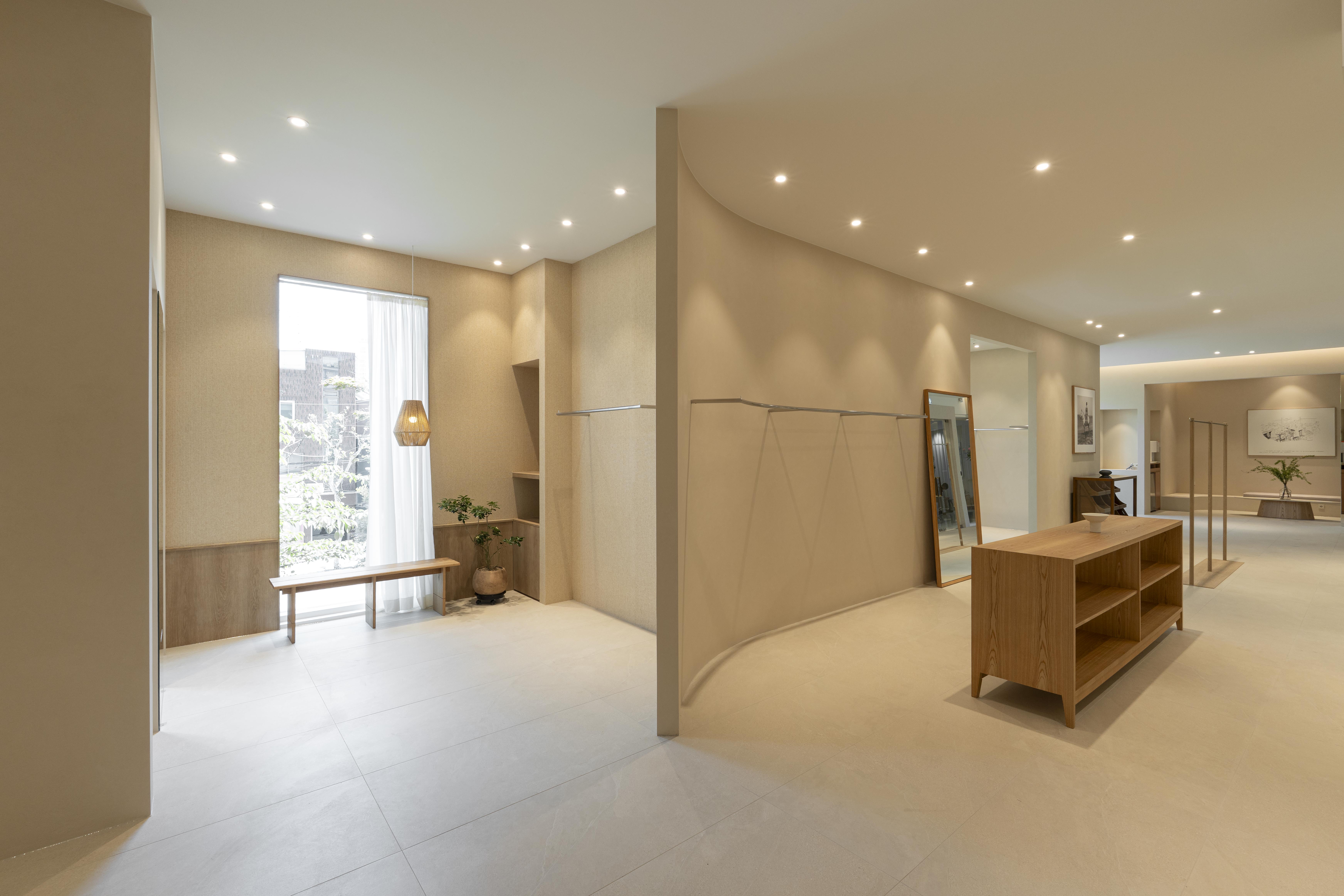 길게 뻗은 매장의 파사드는 매장 외부에서도 내부가 자연스럽게 보이도록 불규칙 간격의 보이드형 유리창을 설계했다. 상부에는 간접조명을 균일하게 배치해 매장 외관을 은은하게 밝혔다. 입구에 들어서면 전면에 위치한 존은 외부의 나무 풍경을 실내에 담기 위해 창의 크기와 위치를 나무 방향에 맞춰 계획했다.