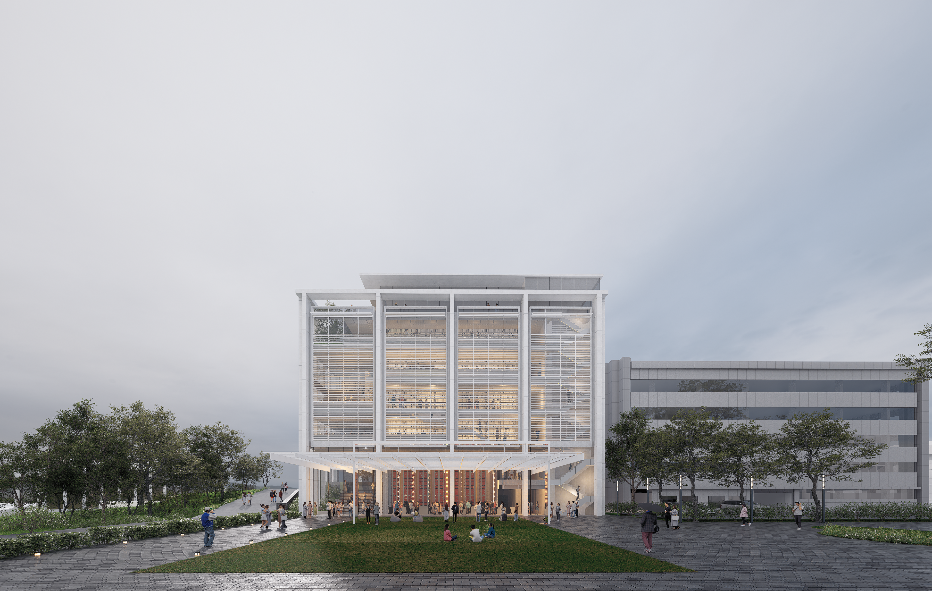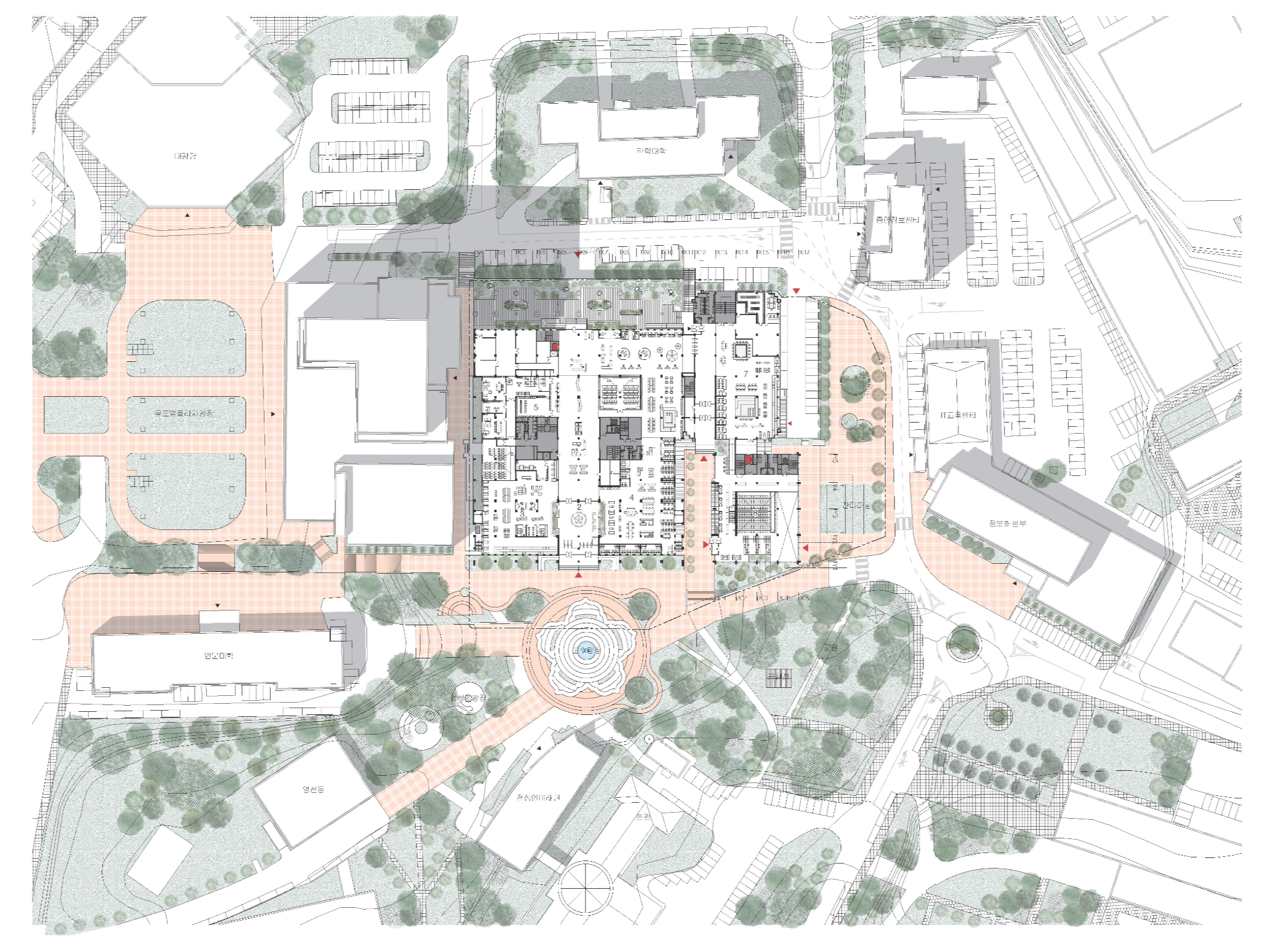과거와 현재를 잇는 공간, 경북대학교의 상징성과 역사성은 유지하면서, 현대적 감성과 기술롸 설계한다. 이 두 건축 언어 사이의 ‘사이공간’은 시간의 층위를 보여주는 공간으로써, 리듬감 있는 동선과 빛의 흐름을 통해 자연스럽게 과거에서 현재로 이동하는 감각을 부여한다. 시각적 연속성을 확보해 기존과 신축 사이의 경계를 흐리게 하고 자연광을 적극적으로 도입해, 도서관 전체의 채광 환경을 개선하고, 동시에 에너지 효율을 높인다. 중정과 옥상정원을 배치해 생태적 요소를 도입해, 실내외를 넘나드는 풍경을 만들어, 이용자의 스트레스 완화 및 정서적 휴식공간을 제공한다. 도서관의 기능이 단순한 독서/학습 공간에서 벗어나 공동체적 교류 공간으로 확장됨에 따라. 사이공간은 비형식적 교류공간으로써, 다양한 스케일의 좌식, 스탠딩, 계단형 라운지 등을 조합해 유기적인 체류를 유도한다.