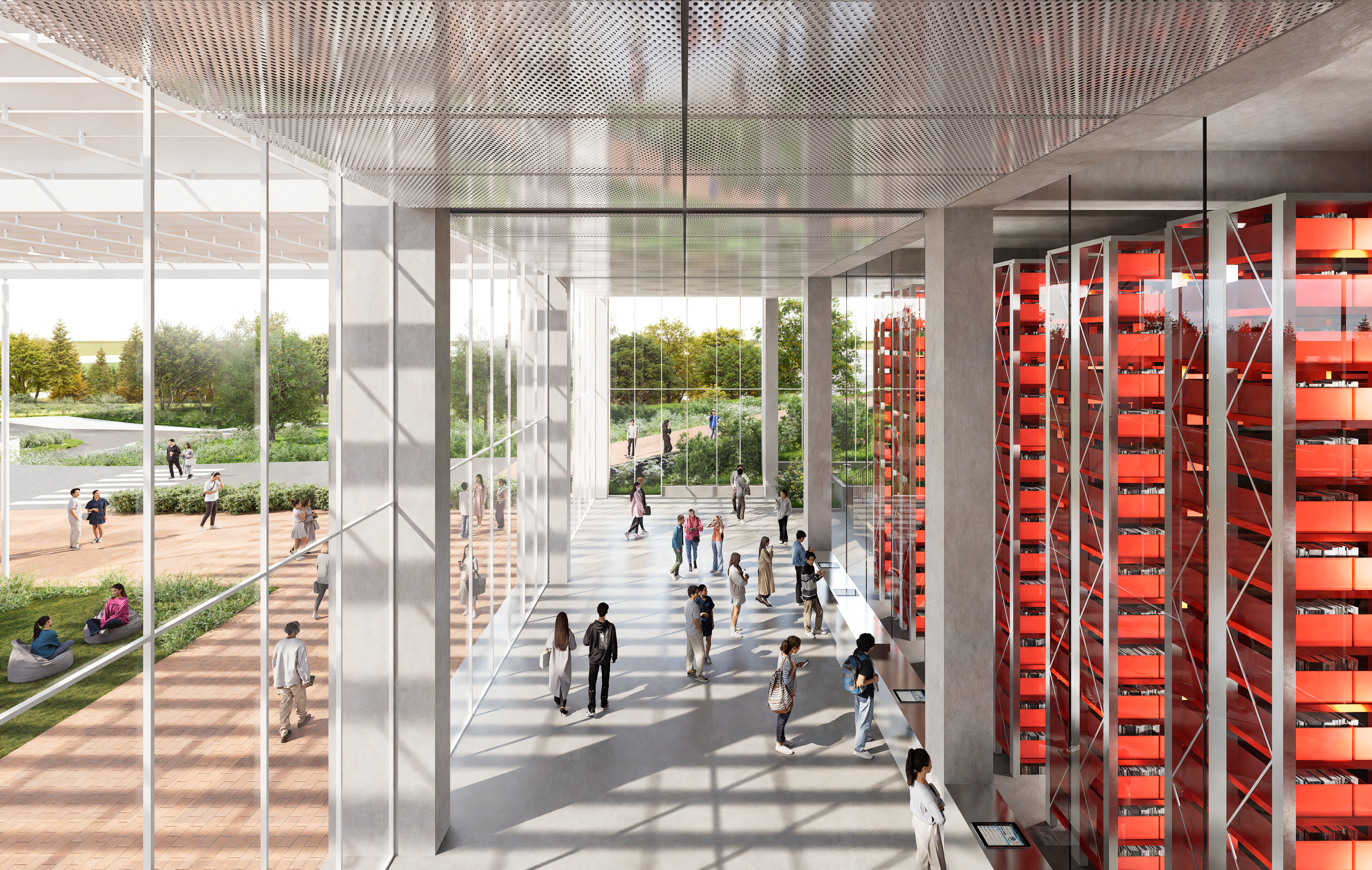 기존 동선구조의 비효율성과 단절 문제를 해소, 증축되는 영역과의 원활한 연계, 입체적으로 연결되는 공간구조를 조성한다. 현재 도서관의 가장 큰 문제인 증축부간의 물리적 단절을 해결하고자, 간단 명료한 그리드를 통해 주요 연결 동선의 기준을 설정한다. 모든 수직동선요소와 연결이 명확하며, 층별 컨디션에 따라 다양한 변경이 가능하다. 도서관에서의 바이오필릭은 공간의 본질과 지식의 본질을 재조명한다. 따로 작동하던 본관동의 아트리움과 보이드 공간을 통합하고 증축동의 사이공간을 활용하여 곳곳에 빛의 통로를 형성한다. 빛의 통로는 주 동선 및 공용부와 같이 작동하며, 곳곳에 실내 조경요소를 배치한다. 오픈공간 및 휴게공간에 풍성하게 들어오는 자연광과 식물요소를 통해 학습과 휴식, 채광과 공기질 정화의 효과를 가져온다.
