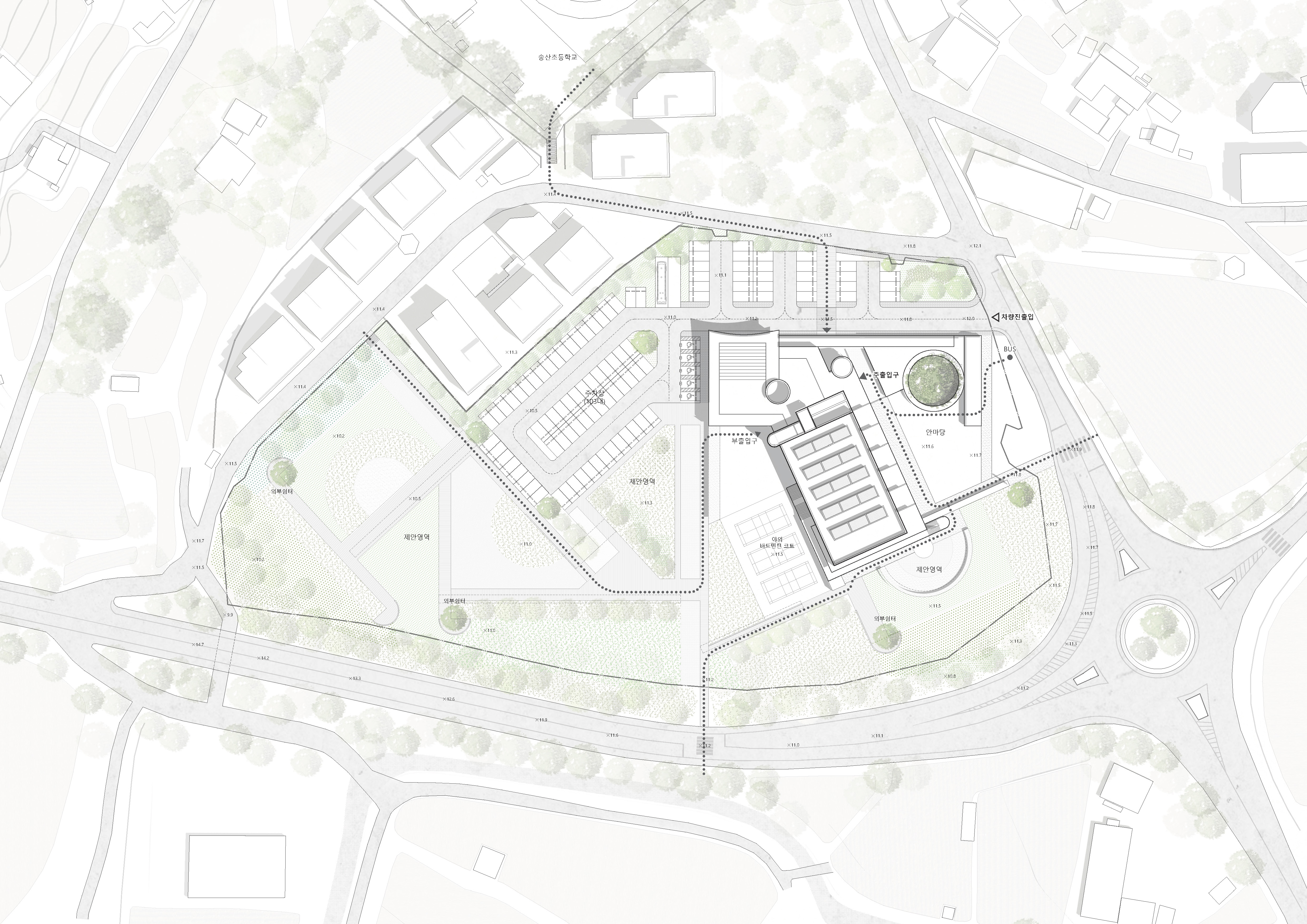 전면이 도로에 노출된 대상지의 산만한 특징에 대응한다. 두개의 엇갈린 “ㄱ자 형태”를 배치한다. “ㄱ자 형태”는 대지 전체로 확장되며 다양한 위계의 둘러싸인 영역을 형성하거나 선적인 요소의 하드스케이프로 대상지에 최소한의 인프라스트럭처로 개입한다. 진입로가 되거나 그늘막이되고 배관과 배선이 놓인다. 경작을 위한 장치가 된다.