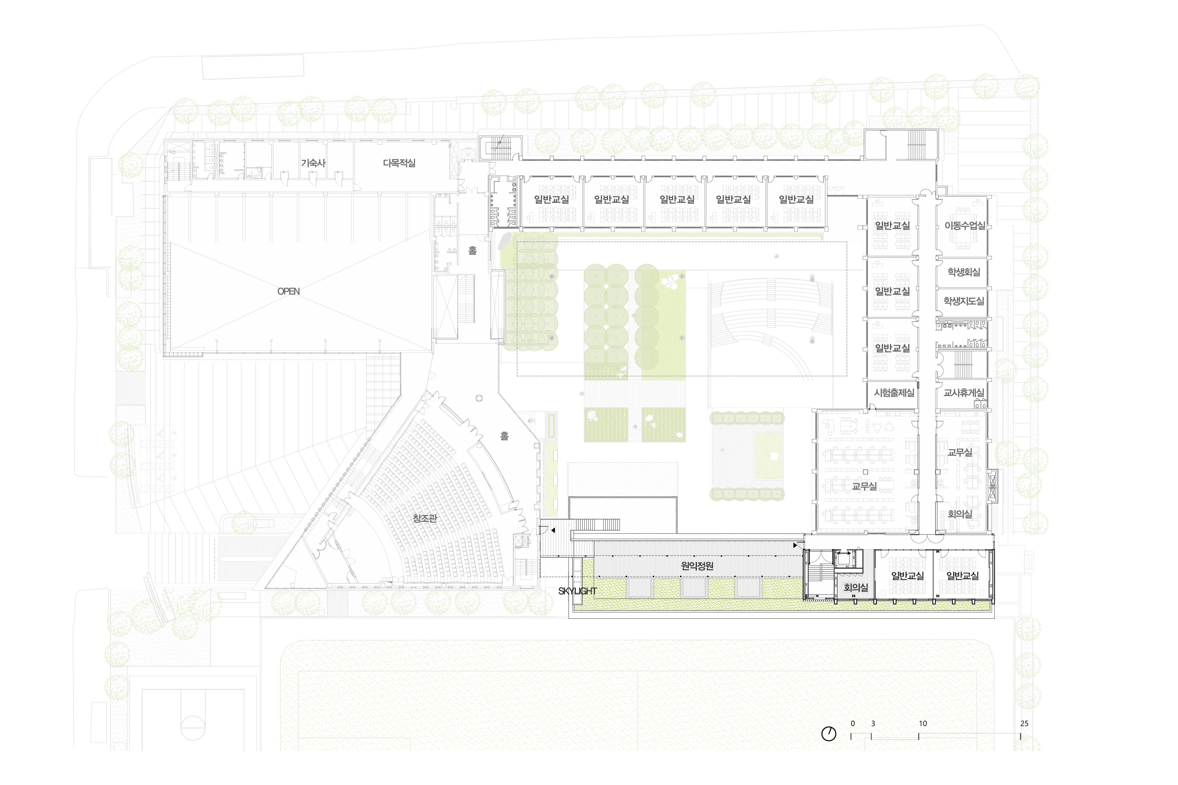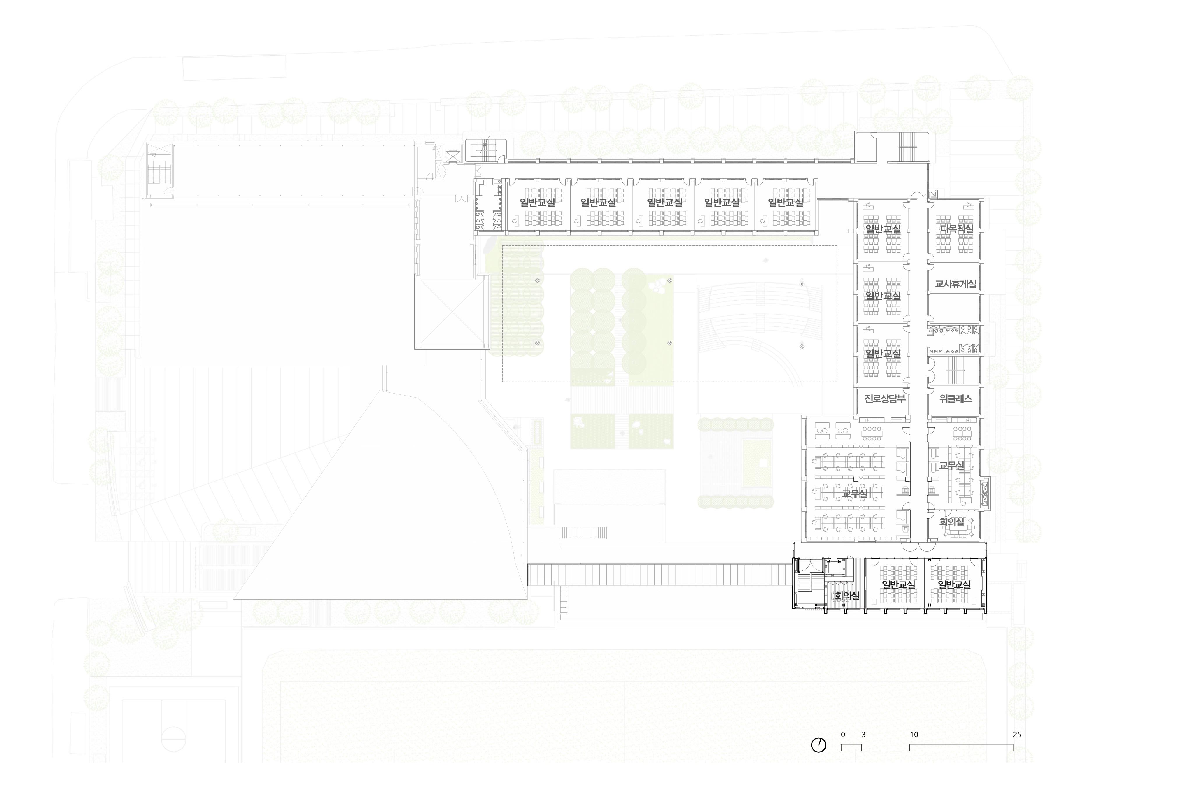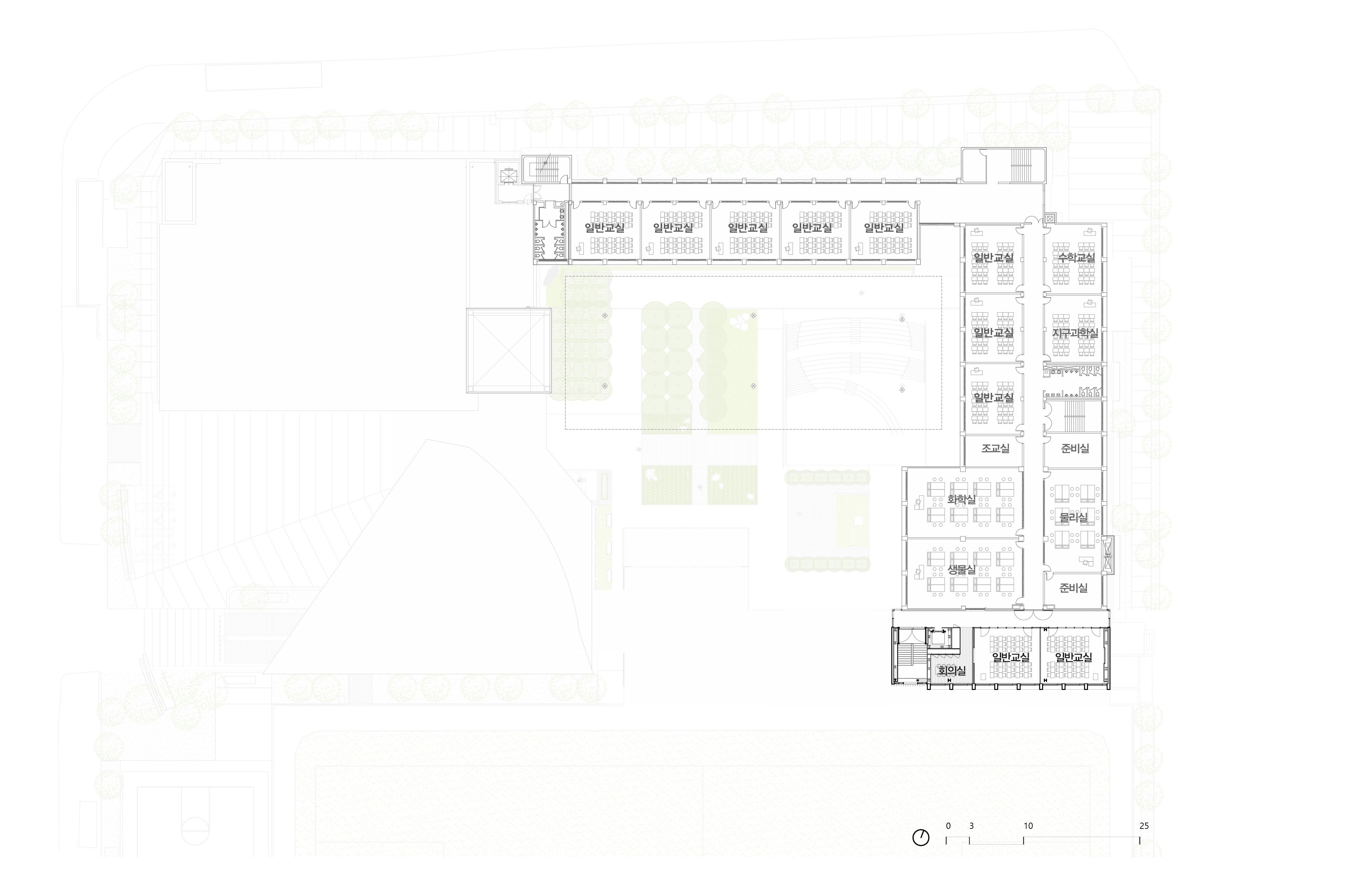 이 프로젝트의 핵심은 단순한 증축을 넘어서, 학교 전체의 통합적 재구조화를 실현한 데 있다. 하나의 순환 동선을 형성해 기존 공간을 유기적으로 연결하고, 학생들이 교실 안에 머무는 것을 넘어 학교 곳곳을 경험하며 주체적으로 성장할 수 있는 환경을 만들고자 했다. ‘교육은 백년지대계’라는 말처럼, 교육을 담는 학교 공간 역시 그만큼 중요하다. 이 공간에서 학생들이 더욱 풍부한 일상을 경험하며 미래세대의 주역으로 성장하길 기대한다.