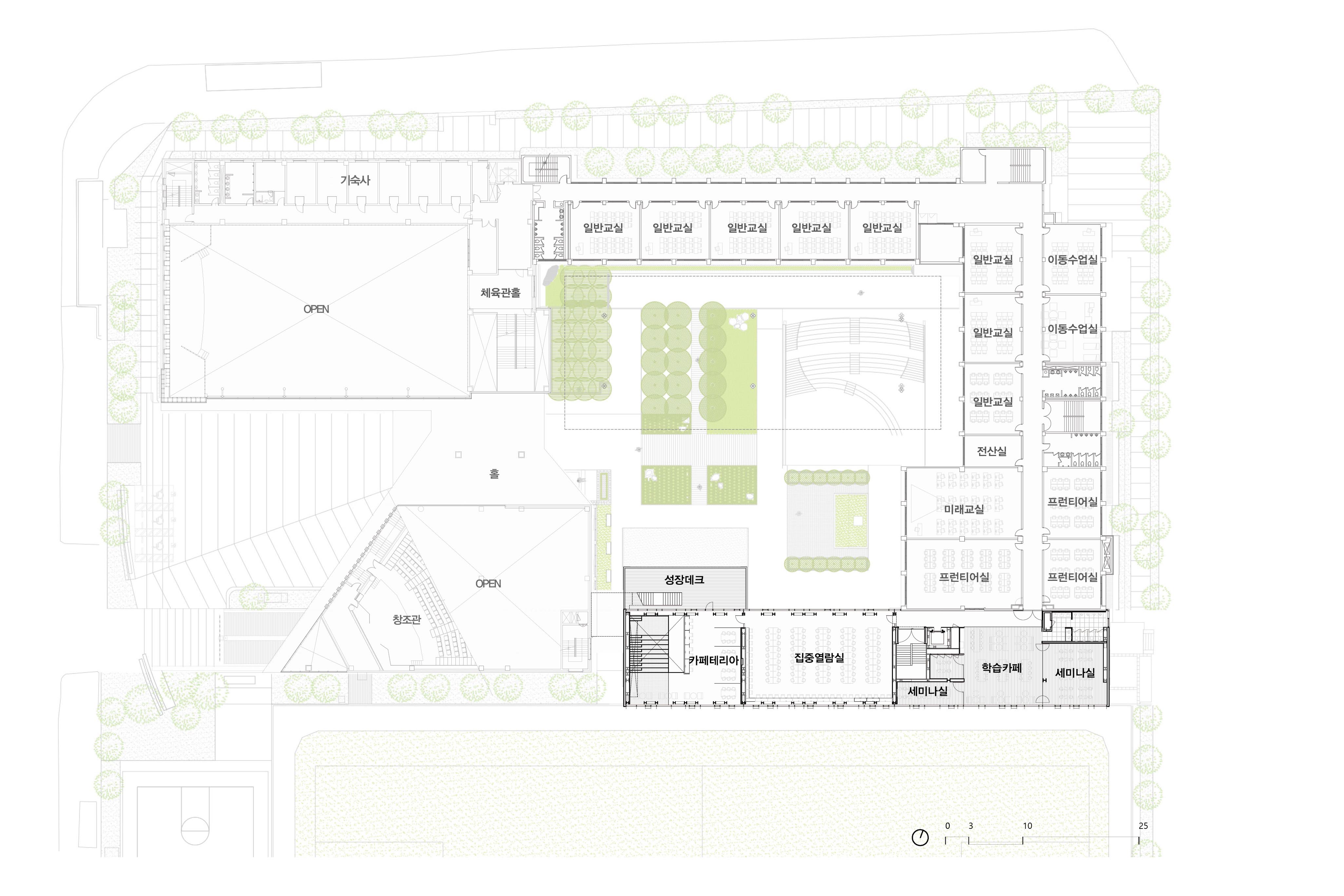 고교학점제 시행에 대비해, 학생들이 시간표에 따라 교실을 이동하고 공강 시간 동안 자율적으로 공간을 활용할 수 있도록 저층부에 다양한 학생 공간을 배치했다. 운동장과 중정을 조망할 수 있는 2층 자율학습실과 학습카페, 1층 카페테리아 등을 통해 일상 속에서 자연을 체감하고 사유할 수 있는 환경을 마련했다.