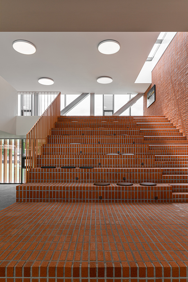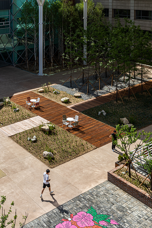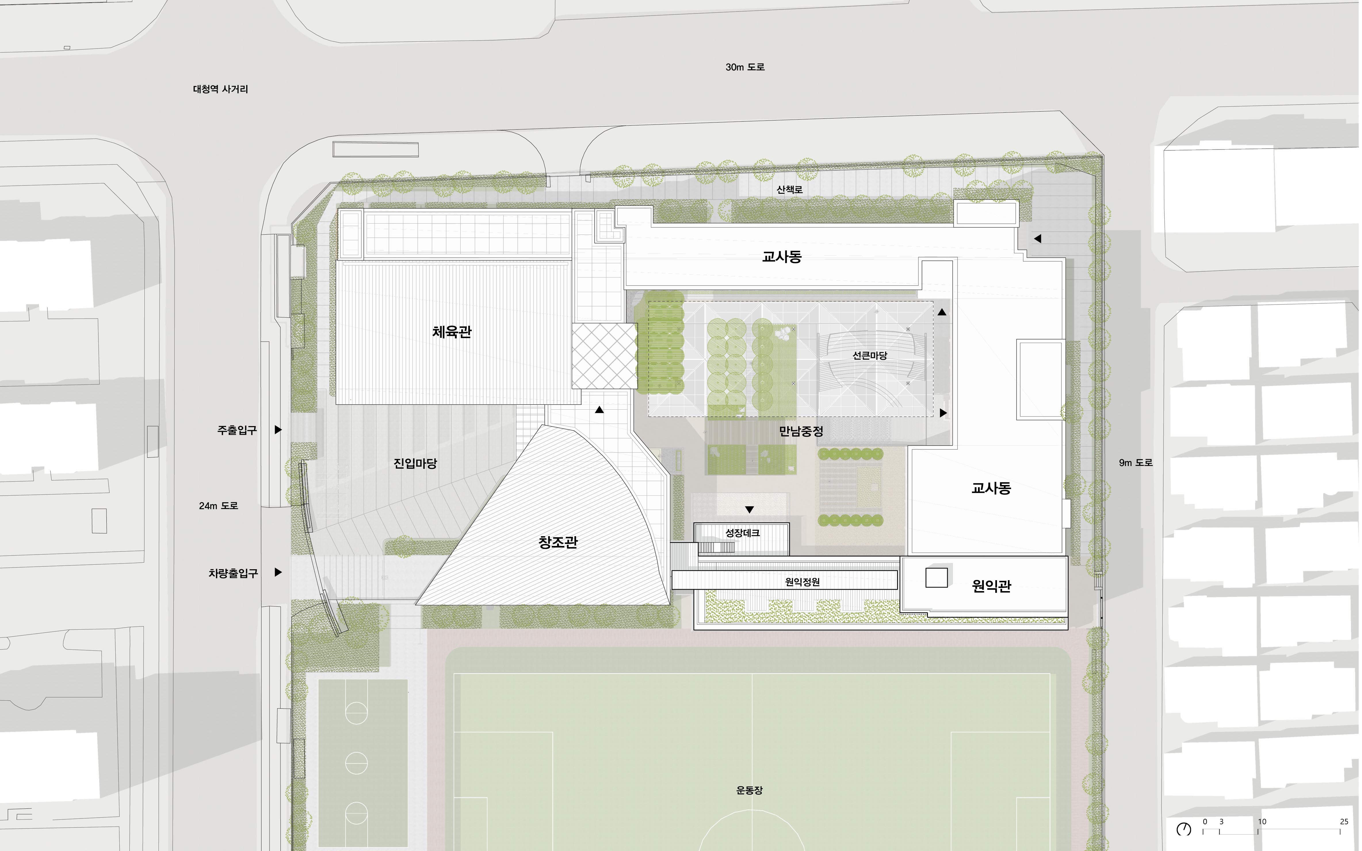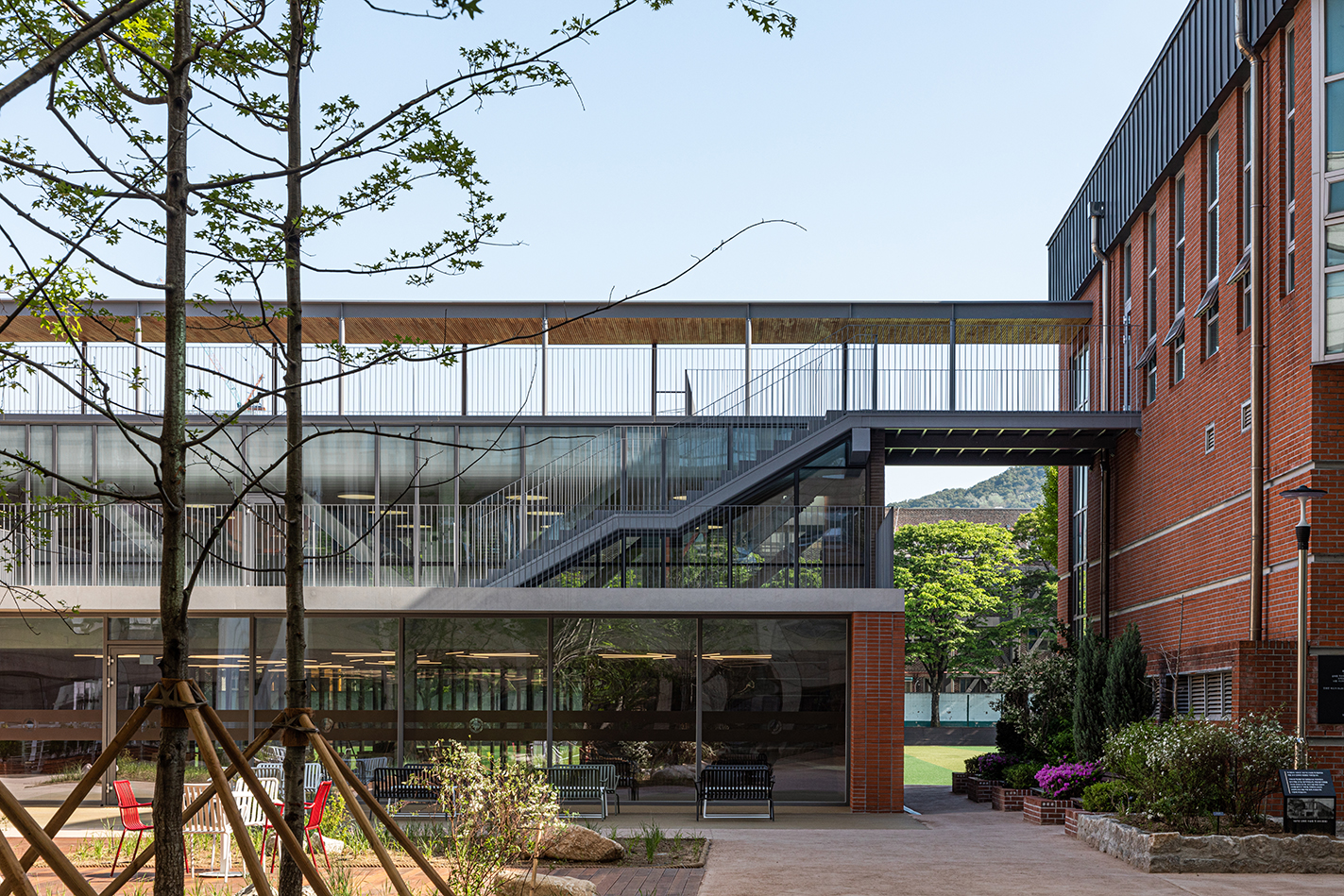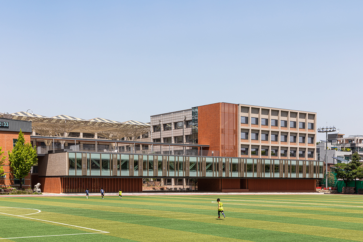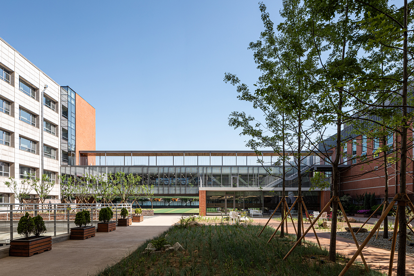 증축을 통해 형성된 중정에는 조경을 계획해 구성원들이 자연스럽게 소통하고 쉴 수 있는 정원을 마련했다. 또한 3층 옥상정원을 더해 내부와 외부 공간을 넘나드는 일상 속 공간 경험을 만들고자 했다. 외관은 기존 학교 건물의 붉은 벽돌을 사용하되 새로운 재료로 섬세하게 정리하여, 여러 동이 하나의 건물처럼 인식되도록 했다. 이를 통해 과거와 현재가 공존하면서도 미래 교육의 정체성을 담은 학교의 이미지를 구축했다.
