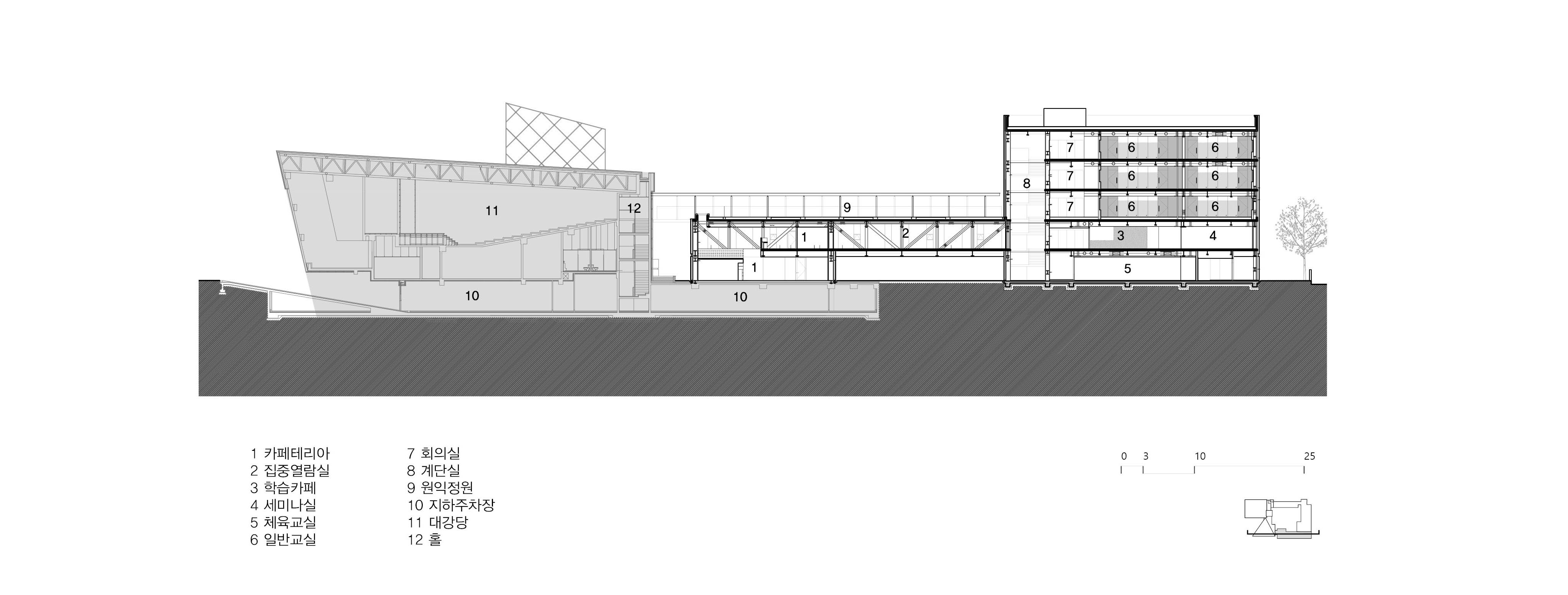 건물은 지하 주차장의 기초를 보강하고, 장스팬 철골 트러스를 활용해 무주공간을 형성한 2층 자율학습공간과 3~5층의 교실 공간으로 구성되었다. 집중학습공간, 학습카페, 다양한 세미나실 등은 학습, 휴식, 이동, 교류가 복합적으로 이루어지는 환경을 조성해 학생들의 창의적인 배움과 성장을 유도했다.