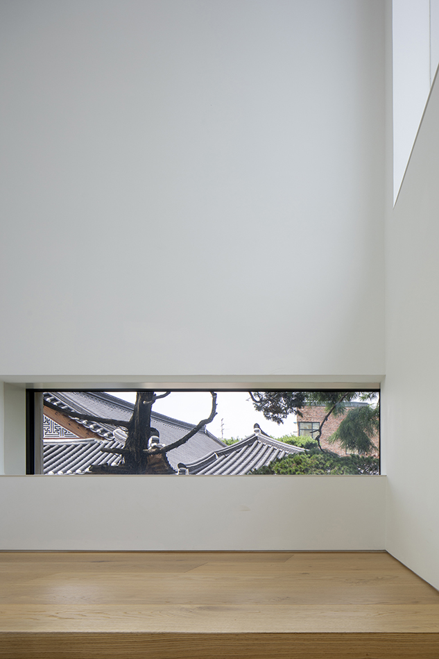 전이 공간인 중심 홀은 두 개의 천창에서 흘러내리는 자연광과 2층 복도의 곡선 흐름이 결합되어 이 주택의 고유한 공간적 특징을 드러낸다. 중심 홀과 돈암마당에서 시작되는 계단은 천창과 함께 수직적 상승감을 만들어낸다. 계단을 오르며 계단참의 수평창을 통해 돈암장 본채의 한옥 지붕이 시야에 들어오도록 했다. 이 시각적 전개는 과거 돈암장과의 관계성을 환기시킨다. 계단을 따라 2층에 도달하면 두 개의 천창과 곡선 브리지를 지나 가족실과 자녀 공간으로 이어지고, 이 과정에서 공간의 전환 경험이 이루어진다.