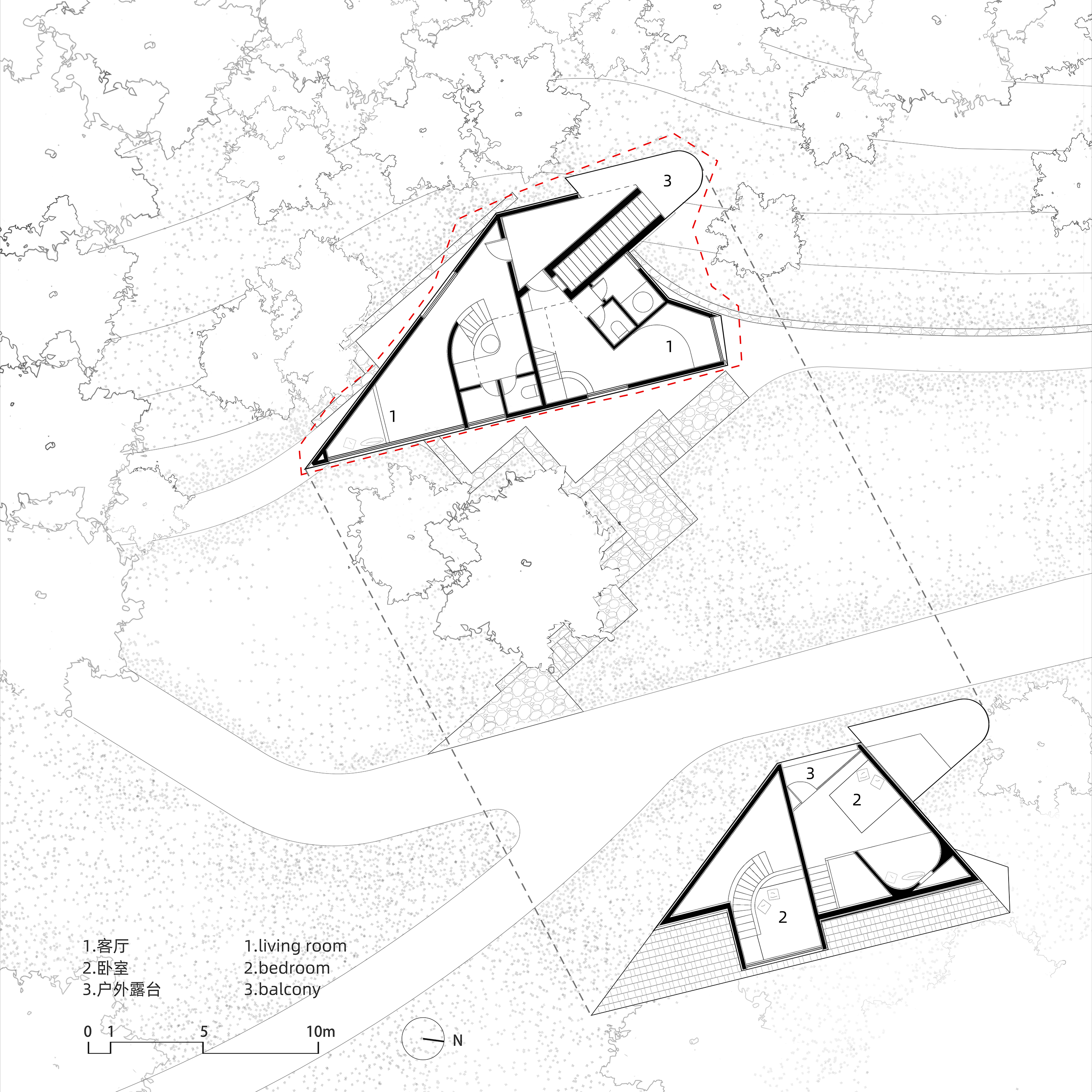 숲속의 트리하우스는 대지의 길과 나무의 윤곽에 정밀한 기하학적 질서로 대응한다. 기하학적 형태는 직접적으로 미적 효과를 드러내려는 것이 아니라, 현장 감각을 바탕으로 한 설계 조건의 종합에서 도출되었다. 설계자는 불규칙한 대지 경계에서 제어선을 추출해 평면과 단면 반복을 통해 매스, 대지, 인체의 관계를 정제했다. 특히 지상층에서 중심 계단실 코어를 원래 축에서 60도 회전시킨 것이 중요한 조정이었다. 이로써 공간이 열리고 새로운 구조적 표현이 가능해졌다.