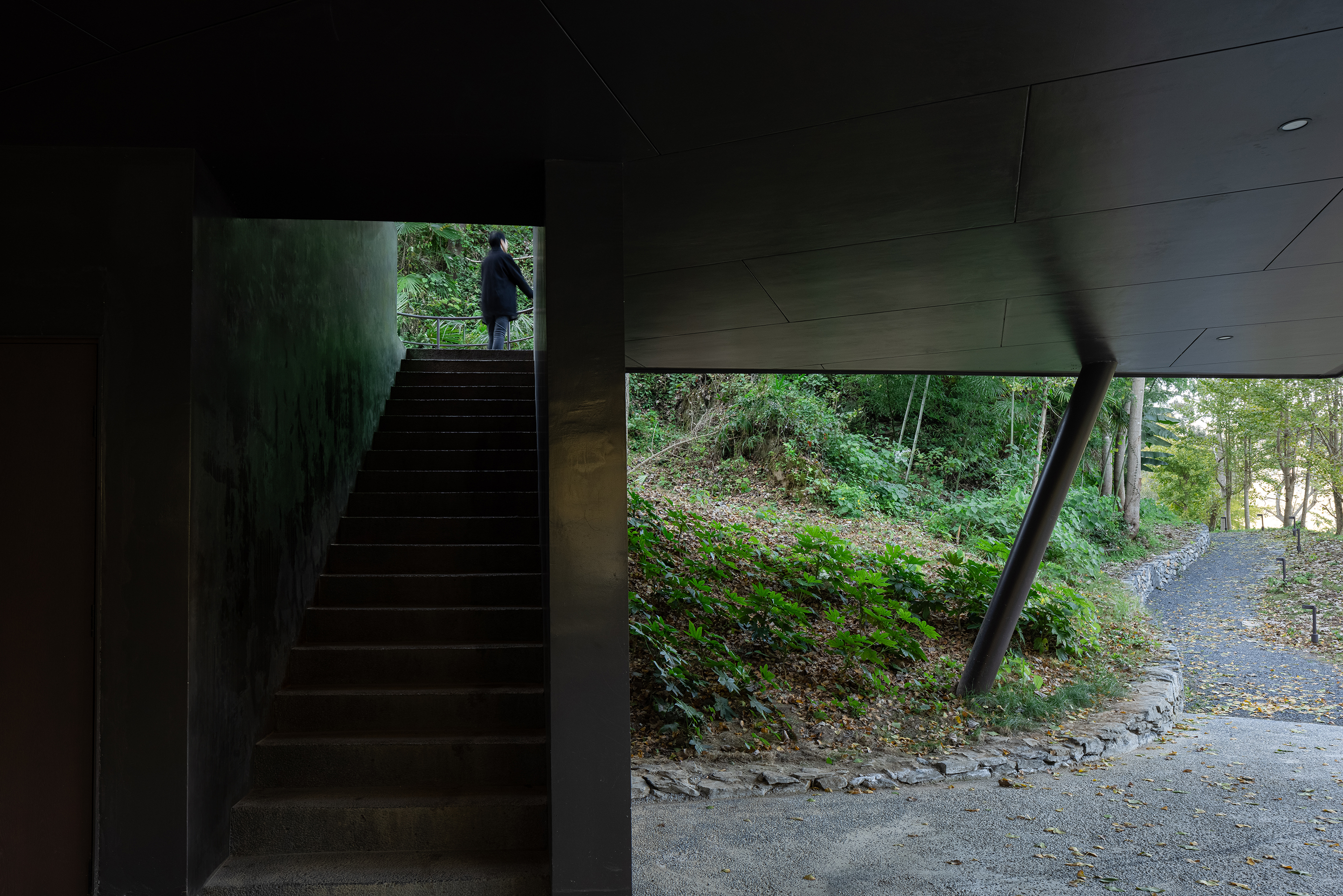 대지 위 세 그루 고목을 보존하기 위해 건물은 혼합 구조를 채택했다. 독립 기초, 1층의 강철 구조와 콘크리트 내력벽, 2층의 경량 강철 구조가 결합된 방식이다. 경량 강철 부재는 필요 길이에 맞게 가공되었고, 내력벽 두께는 150mm 이내로 제한해 실내 면적을 최대화했다. 외장에는 30×45cm 크기의 숯화 처리된 삼나무 판재를 사용했다. 일부는 연마 후 무광 클리어 바니시를 입혀 은은한 광택과 갈라진 질감을 드러냈다. 탄화목 표면은 건물을 자연 속 풍경에 조화시키는 동시에 흰개미, 해충, 습기에 강한 보호막이 된다.