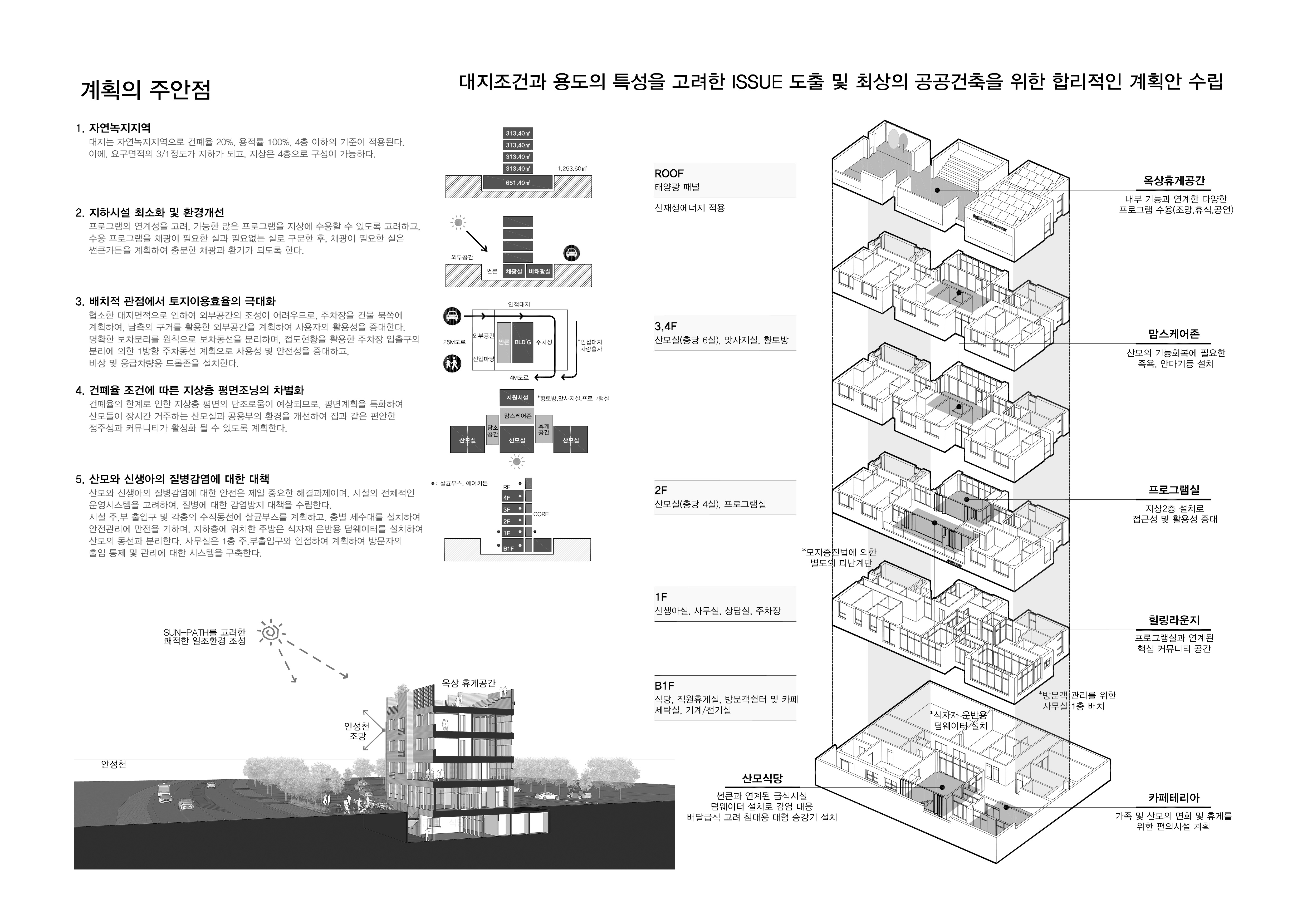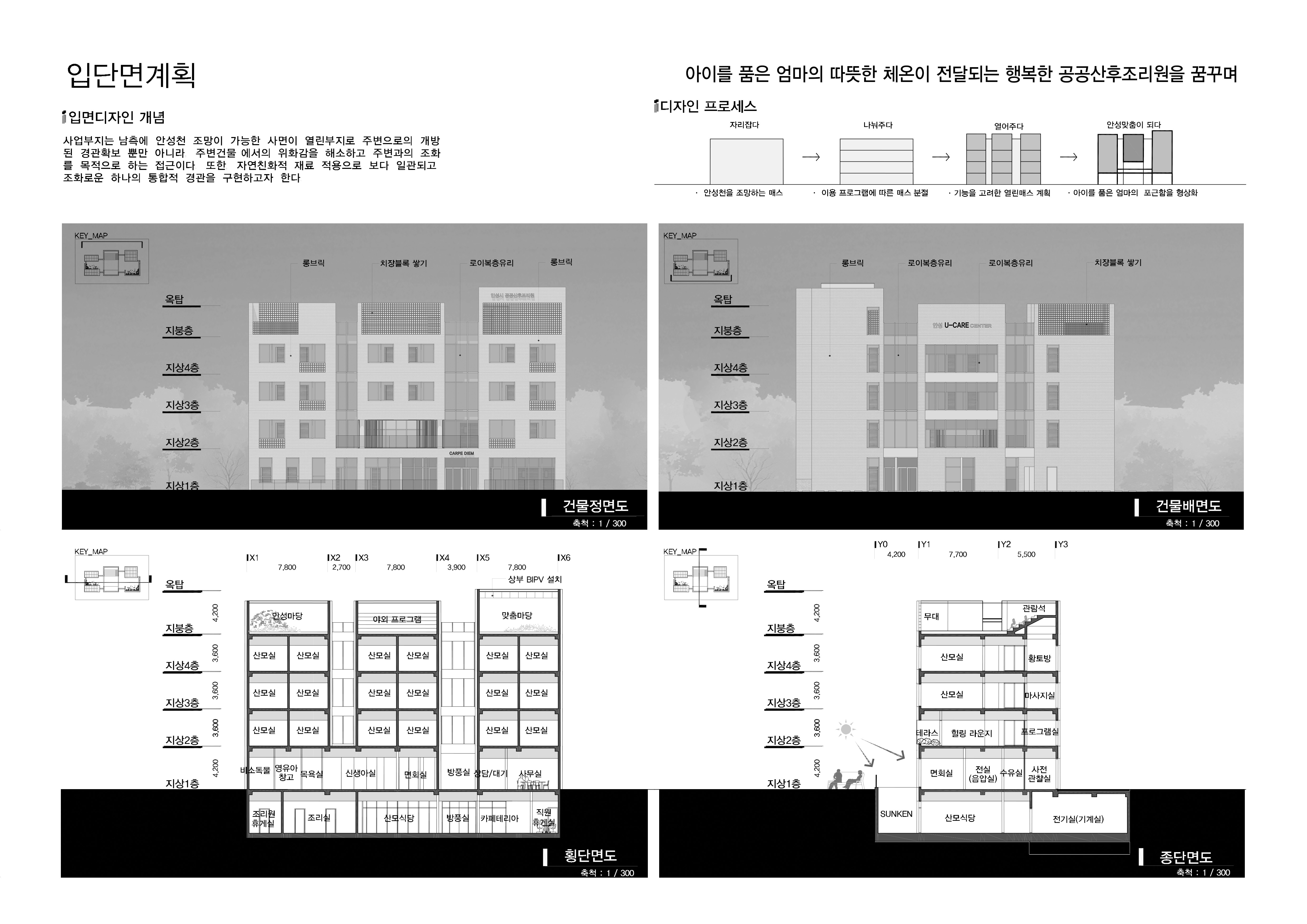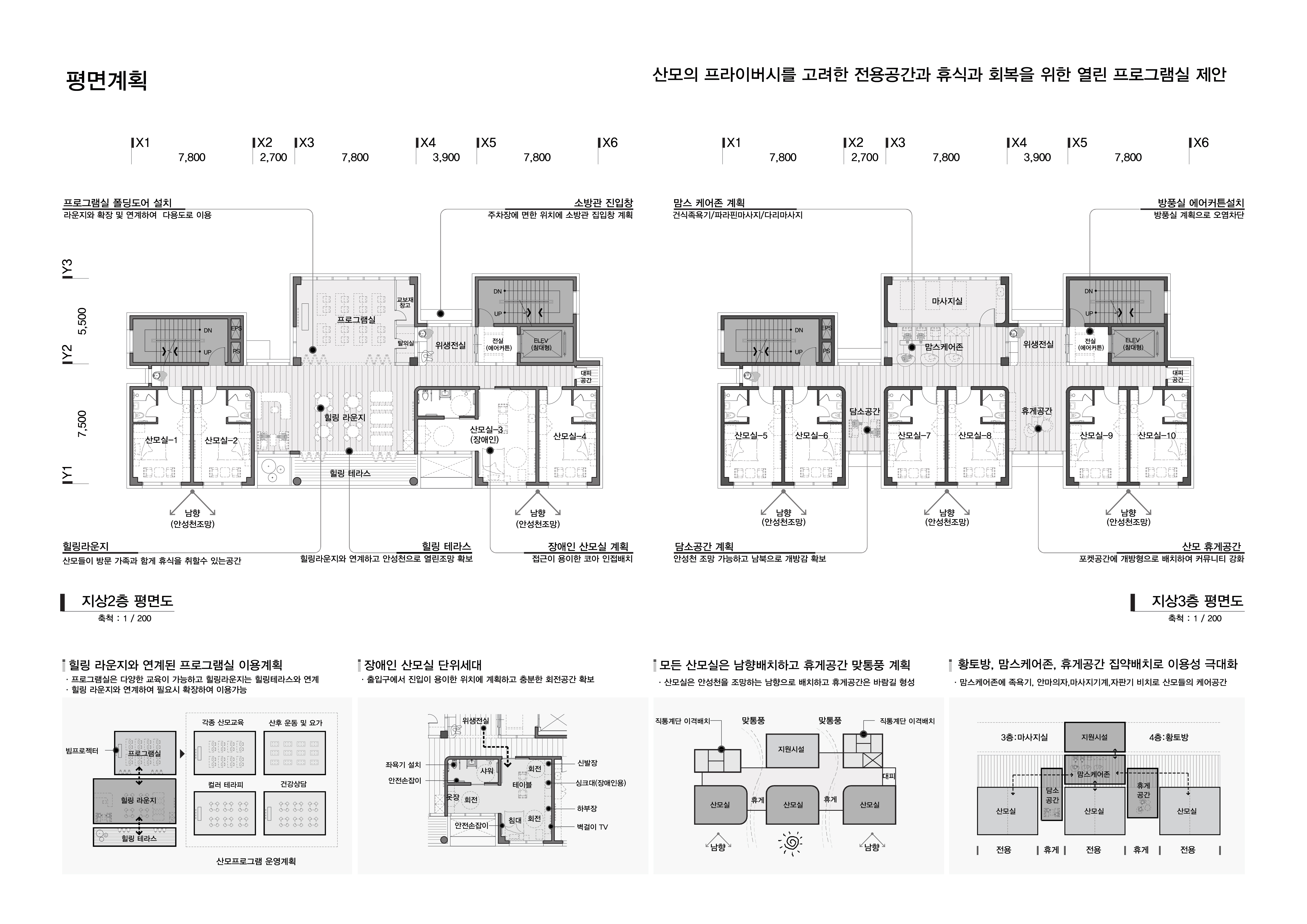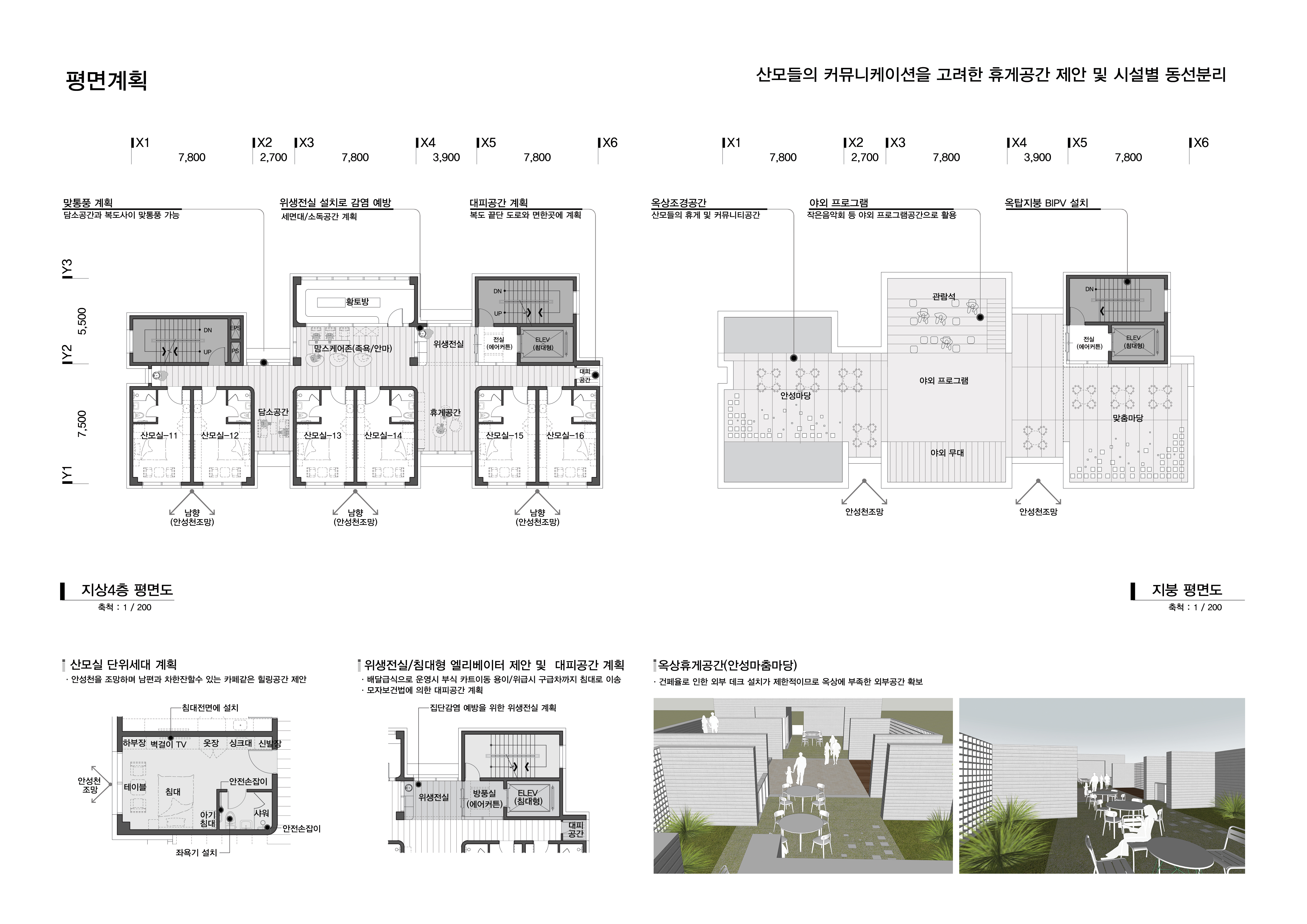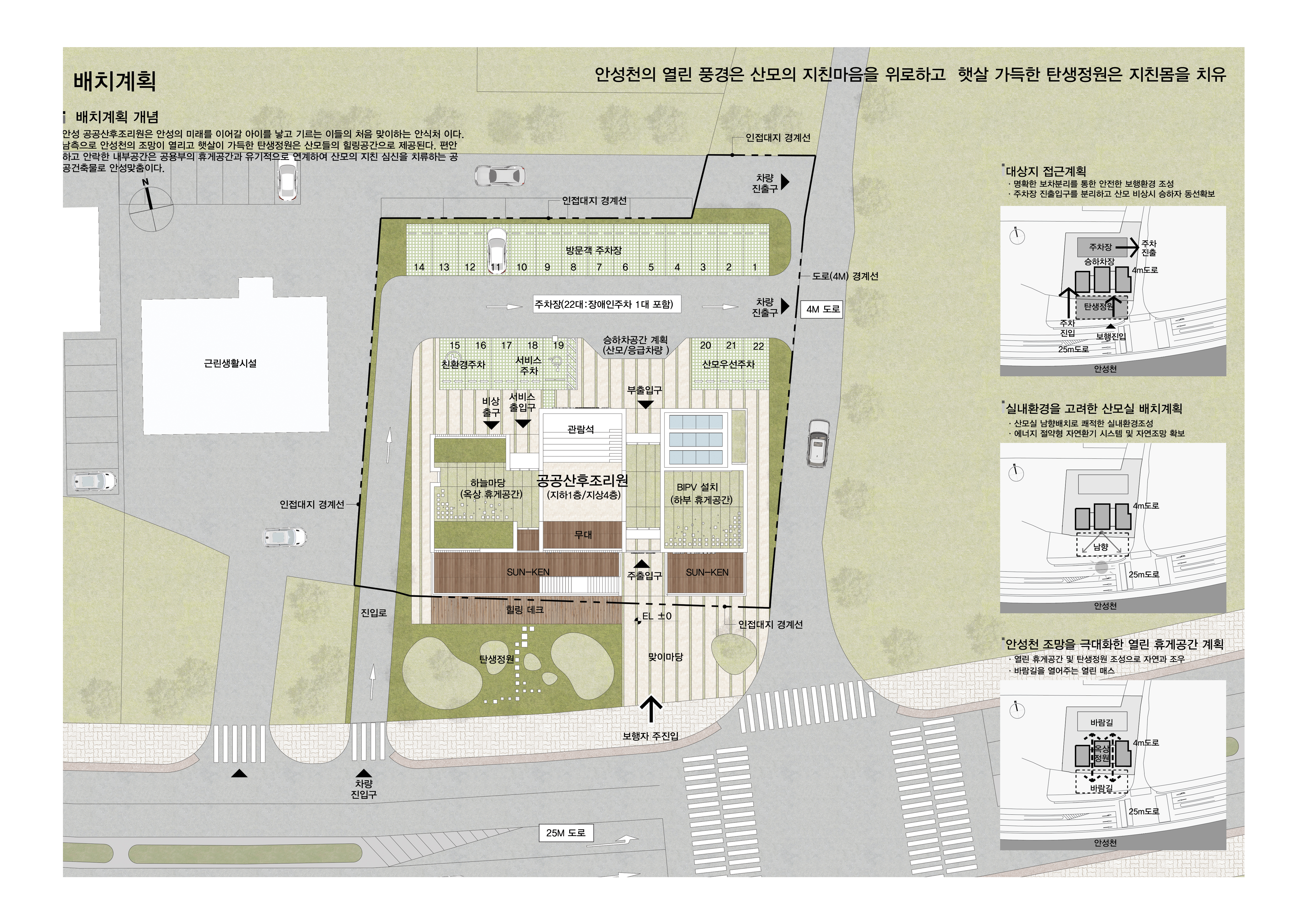 건폐율 제한으로 인해 지상층 평면이 단조로워질 가능성을 보완하기 위해, 장기간 거주하는 산모실과 공용부의 환경을 특화하여 ‘집과 같은 편안함’을 제공한다. 이를 통해 산모와 가족 간, 사용자 간의 커뮤니티가 자연스럽게 형성될 수 있는 환경을 조성한다. 특히 산모와 신생아의 질병 감염 방지는 핵심 과제로, 건축 계획과 시설 운영 전반에 걸쳐 감염 차단 대책을 반영하였다. 남측으로는 안성천 조망이 가능한 개방감을 살려 주변 경관과 조화를 이루며, 인근 건물과의 위화감을 최소화하는 디자인을 추구하였다.