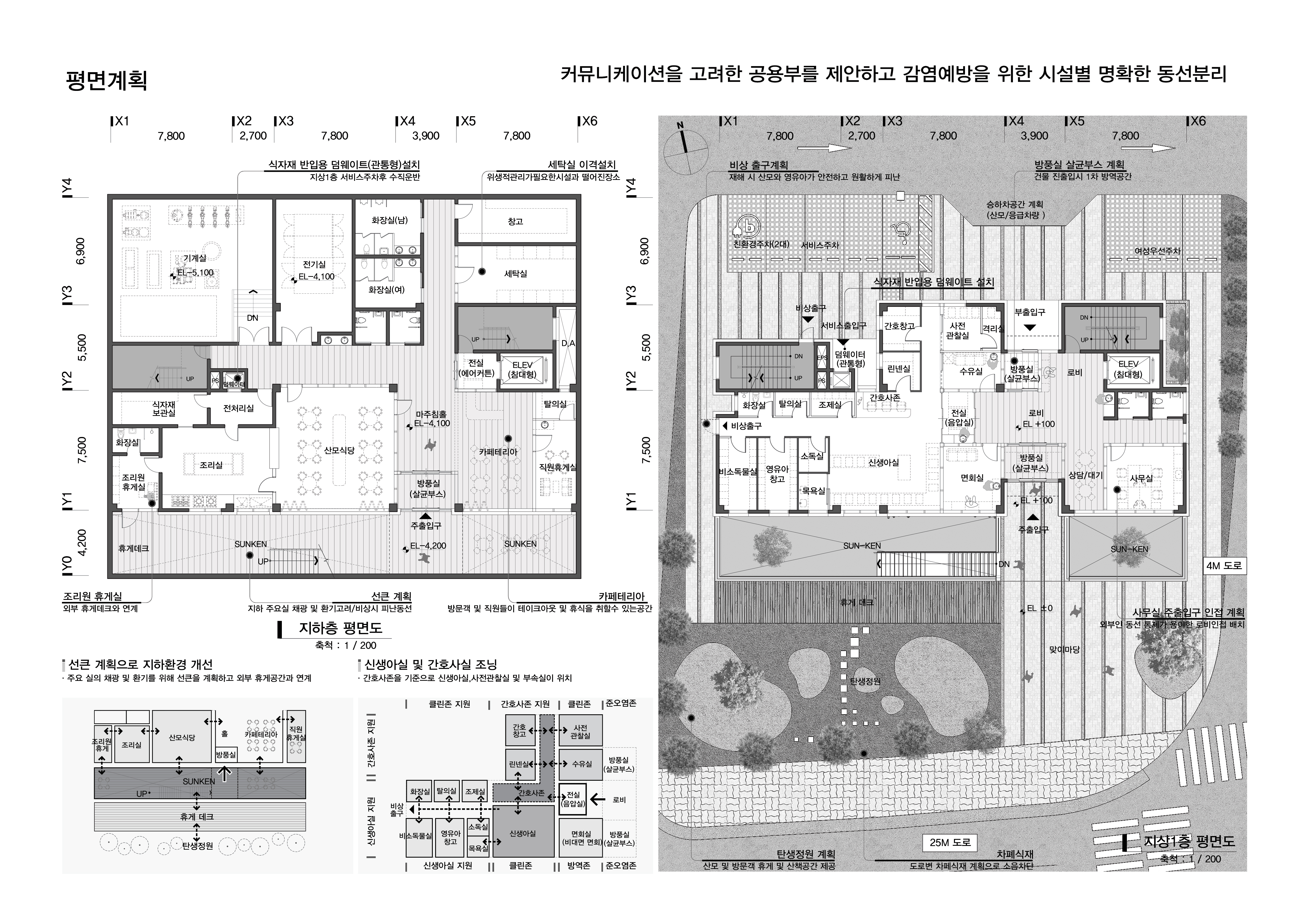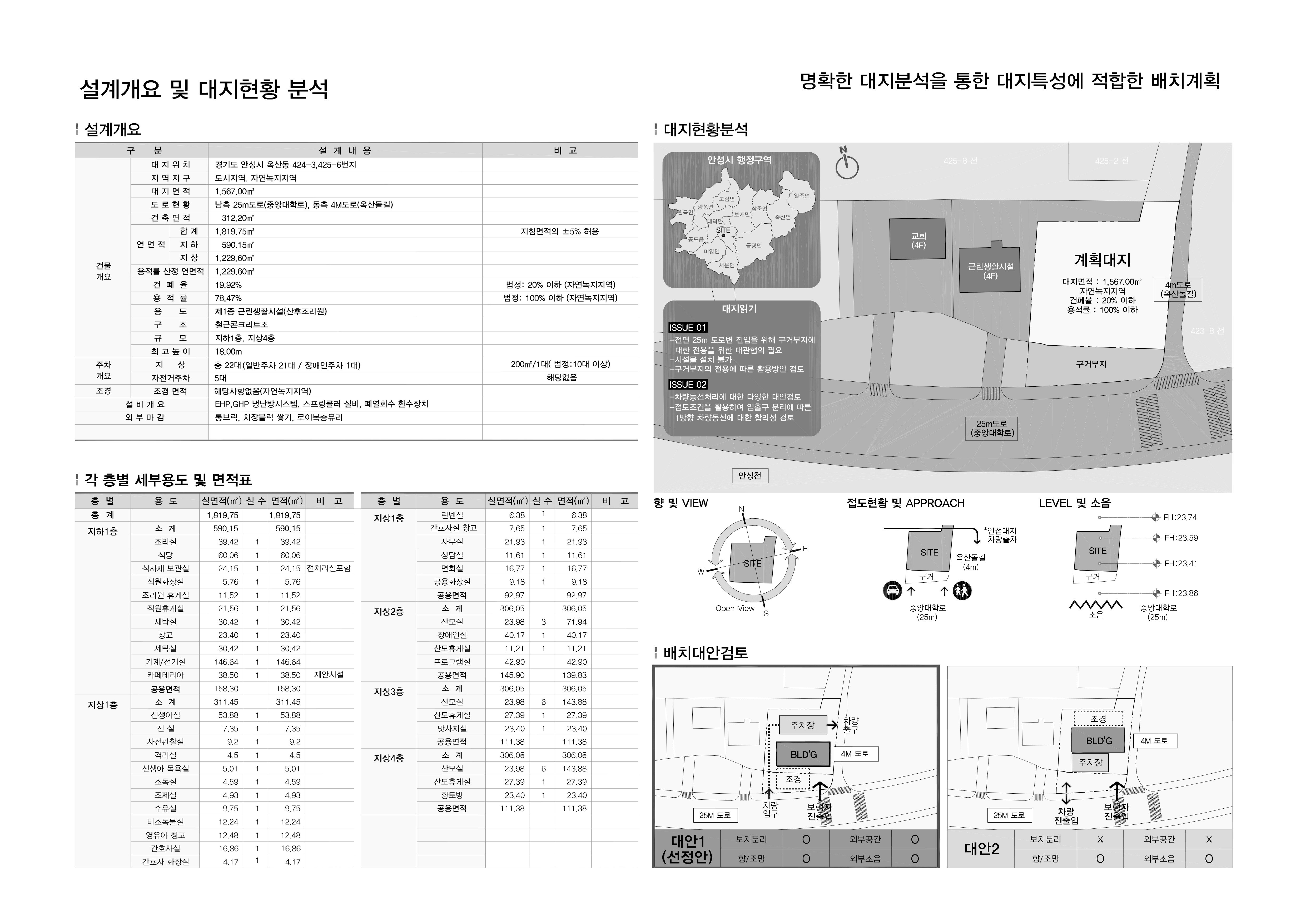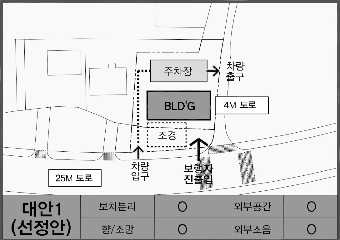 본 프로젝트는 산모와 신생아를 위한 Safety, Convenience, Community의 가치를 담은 문화 쉼터를 조성하는 데 목적이 있다. 협소한 대지 조건으로 인해 외부 공간 조성에 한계가 있으나, 주차장을 북측에 배치하고 남측의 구거를 활용한 테마 외부 공간을 계획함으로써 공간 활용성을 극대화하였다. 이 외부 공간은 썬큰, 2층 힐링 테라스, 옥상 휴게 공간과 유기적으로 연결되어, 자연을 닮은 치유의 환경을 제공하며 사용자에게 심리적·신체적 휴식을 선사한다. 동선 계획은 명확한 보차 분리를 원칙으로, 접도 현황을 고려한 주차장 입출구 분리와 일방향 주차 동선을 적용하여 안전성과 편의성을 높였다.