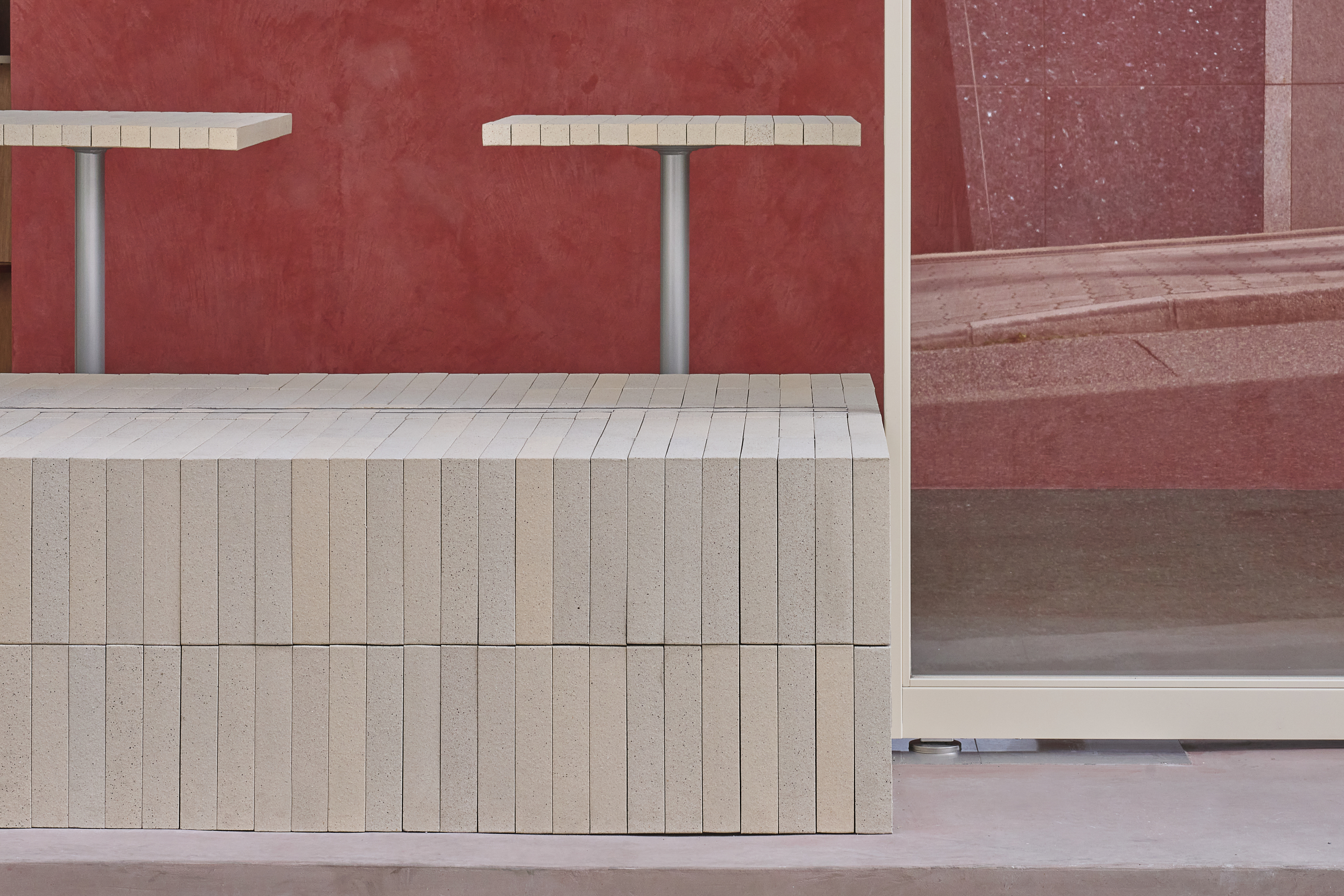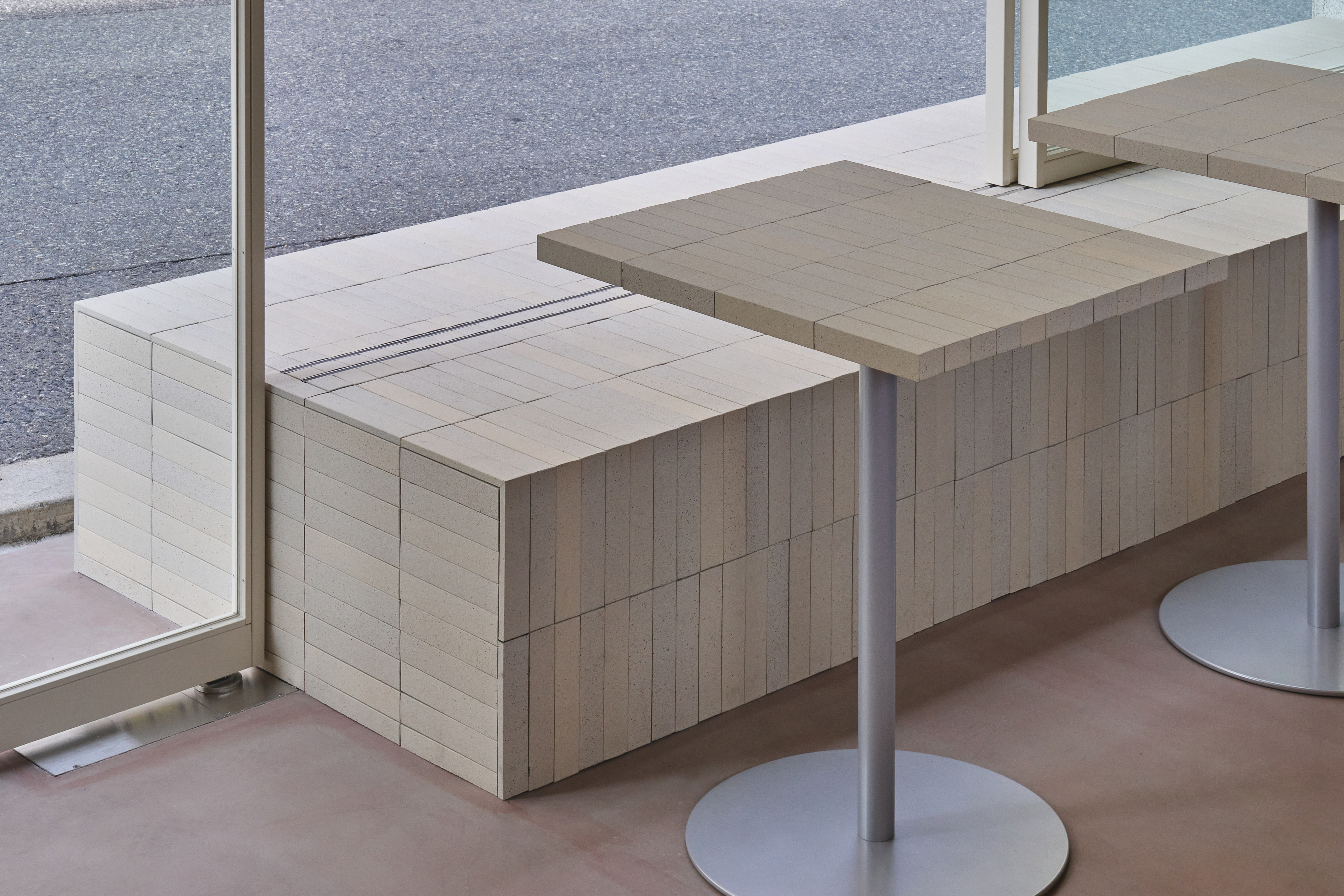 또한, 색의 농담이 불규칙한 미노야키 타일을 벤치와 테이블에 기능의 구분 없이 사용하고, 벽은 타일과 같은 색조의 회반죽 마감으로 처리해 서로 다른 재료가 같은 질감을 만들어내도록 했다.