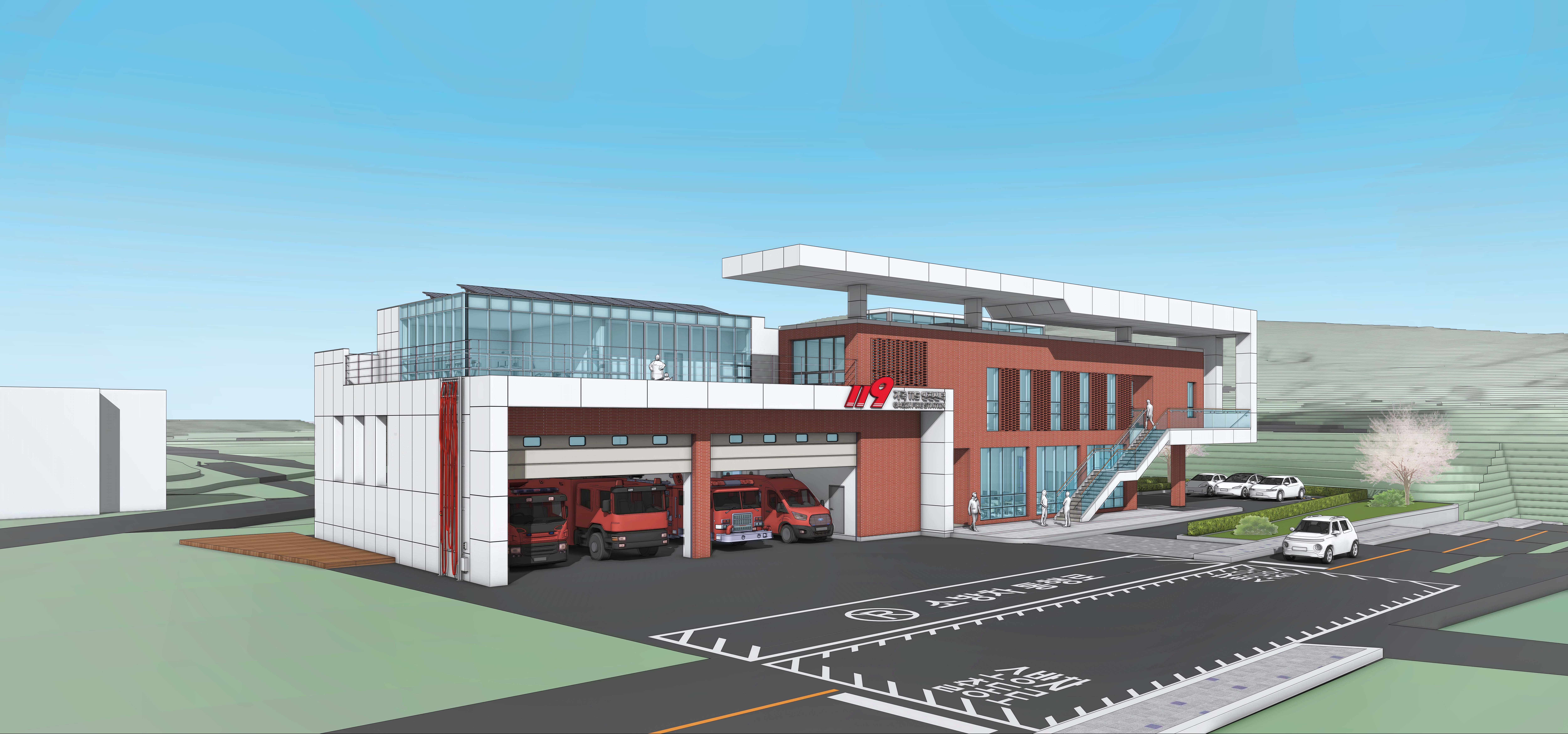 건물의 입면은 길게 뻗은 수평매스를 리듬감 있게 분절하여 역동성을 표현하고, 동선과 연결된 프레임은 출동의 긴박감을 시각적으로 드러낸다. 수직 창호와 영롱쌓기의 규칙적인 패턴은 질서와 안정감을 전하며, 곳곳에 사용된 적색 포인트는 119안전센터라는 정체성과 상징성을 또렷하게 각인시킨다.