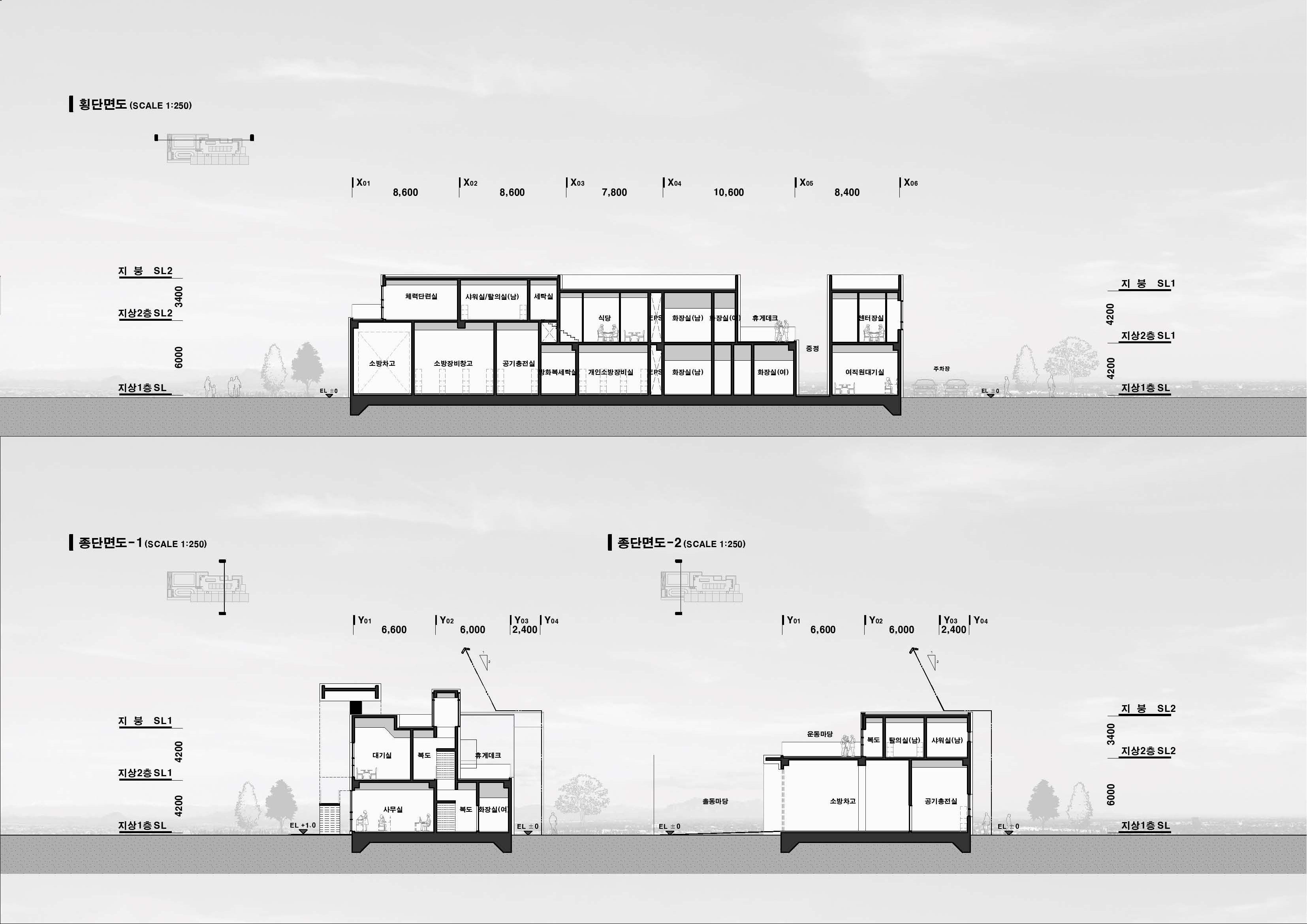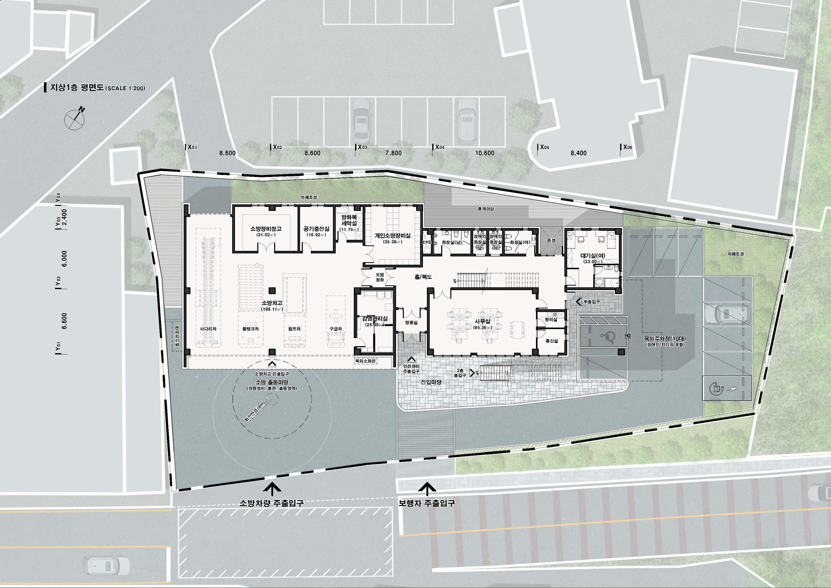 밀양 가곡동에 들어서는 119안전센터는 지역의 안전을 책임지는 거점이자, 신속한 출동을 가능하게 하는 공간으로 계획되었다. 도로와 맞닿은 출동영역은 구조 활동의 즉각적인 시작점이 되며, 철도 쪽으로 배치된 주차장은 일상적 이용과 긴급 출동의 동선을 자연스럽게 분리한다. 이는 곧 시민의 안전과 소방대원의 신속성을 연결하는 공간적 장치가 된다.