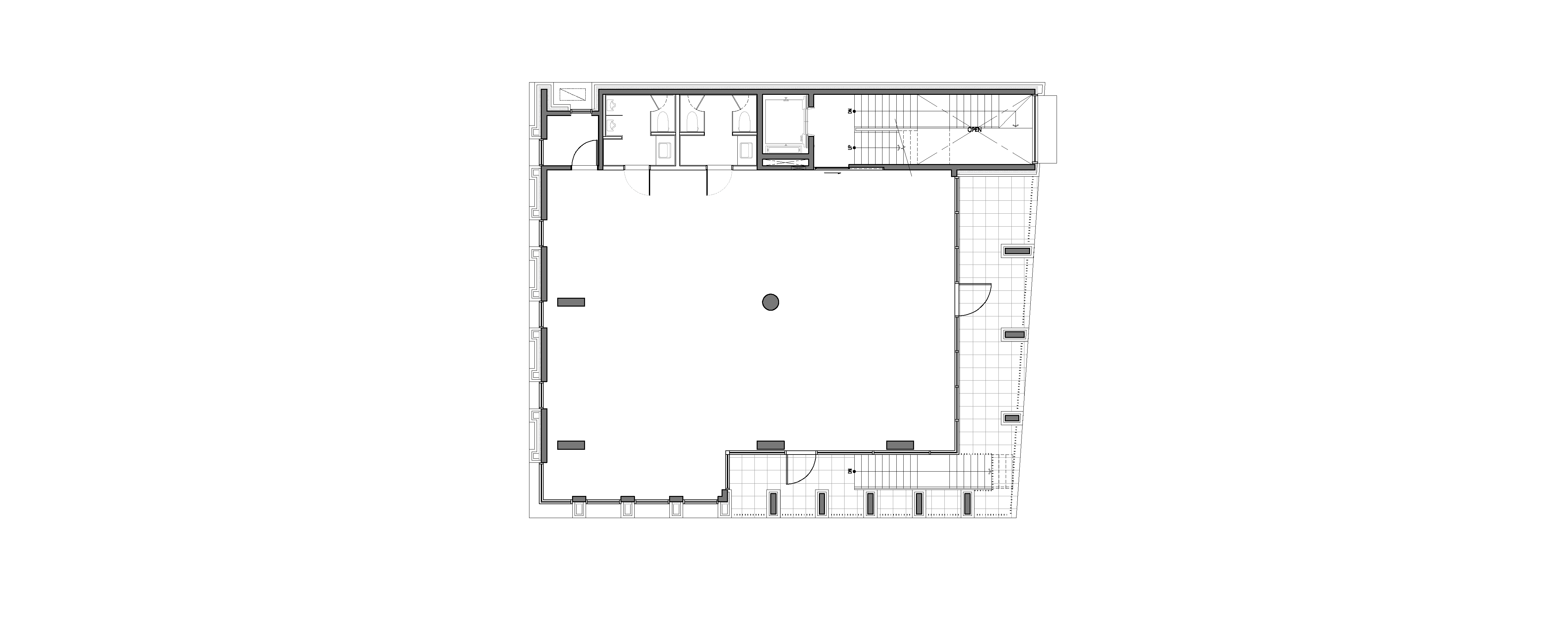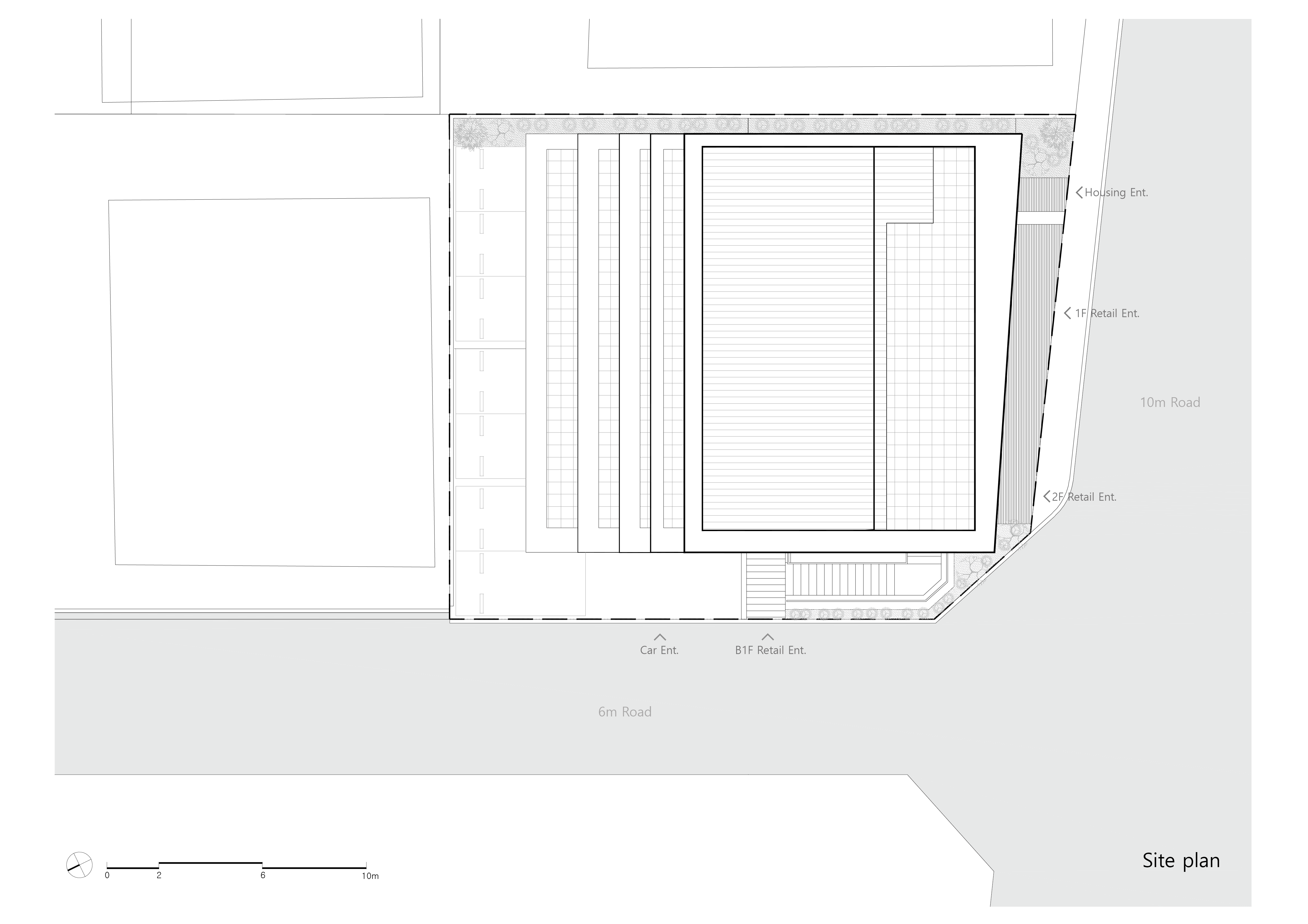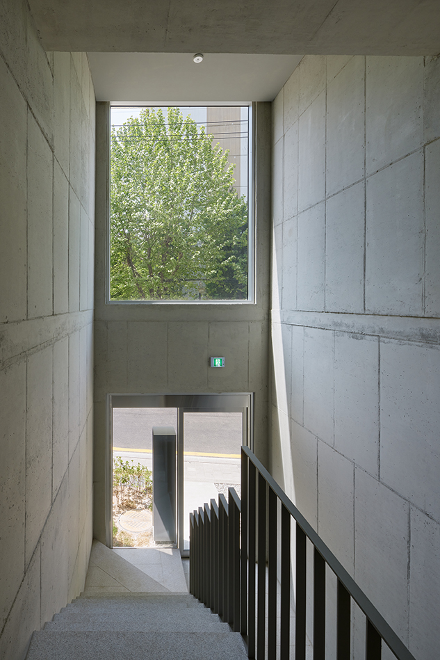주변보다 큰 대지에 최대 볼륨을 계획하는 것은 기존 도시에 이질적인 스케일을 더하여 포화 상태의 복잡한 도시에 더 높은 밀집을 더하는 것이다. 거대한 볼륨을 에워싸는 분절된 그리드는 기존 도시의 스케일과 조화를 이루고, 건물의 새로운 풍경을 만드는 장치이다. 사선으로 된 이형의 대지 형태를 따라 만들어진 그리드와 정형의 건물이 만나서 다양한 깊이의 켜를 만들어 낸다.