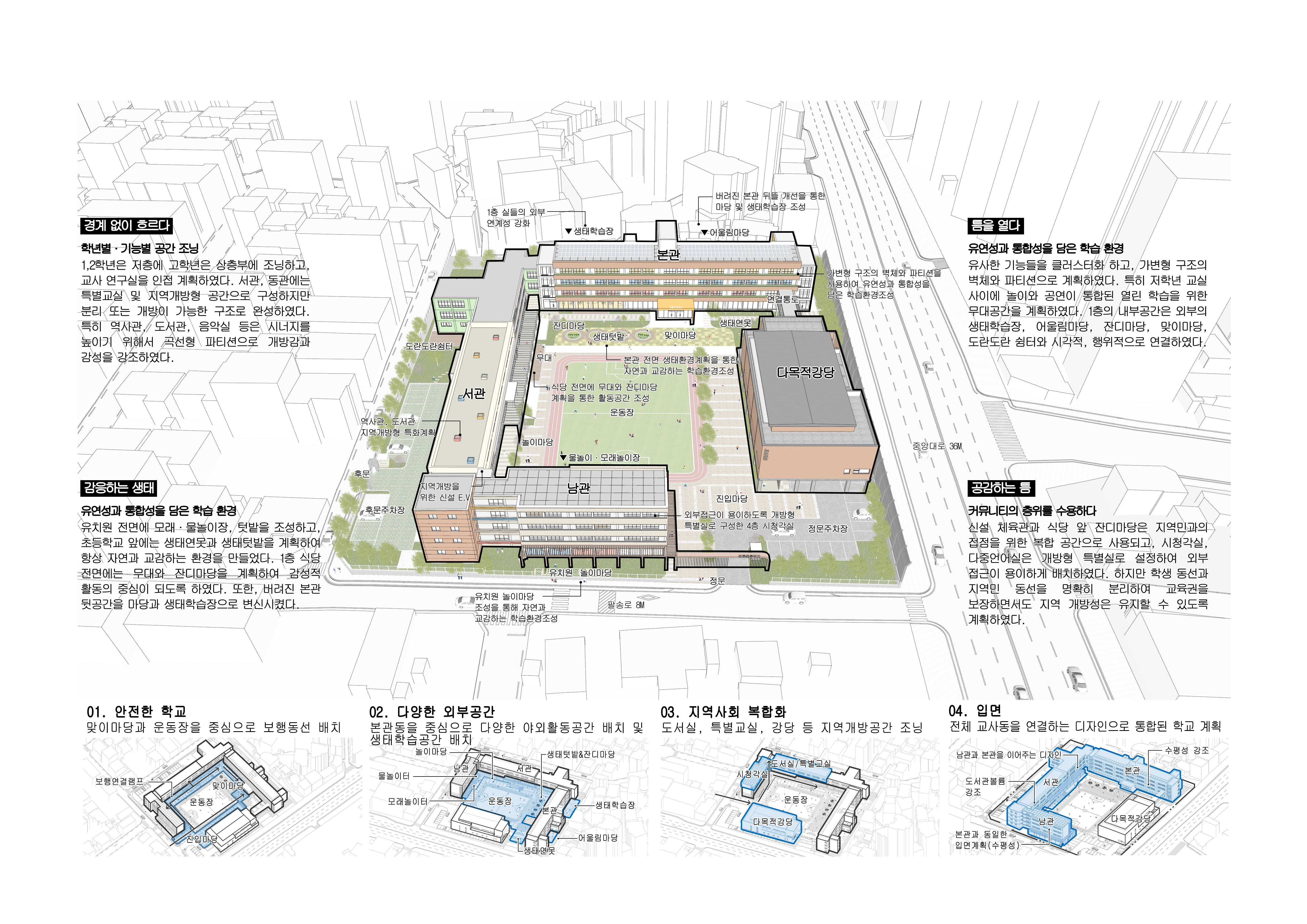 배움과 놀이, 사람과 지역, 실내와 자연 사이를 잇는 틈의 건축, 사이의 공간은 아이들의 경험을 다채롭게 하고, 학교를 일상의 중심으로 확장시킨다. 이제부터 청룡초등학교는 틈에서 자라고, 사이에서 배우는 공간이 될 것이다.