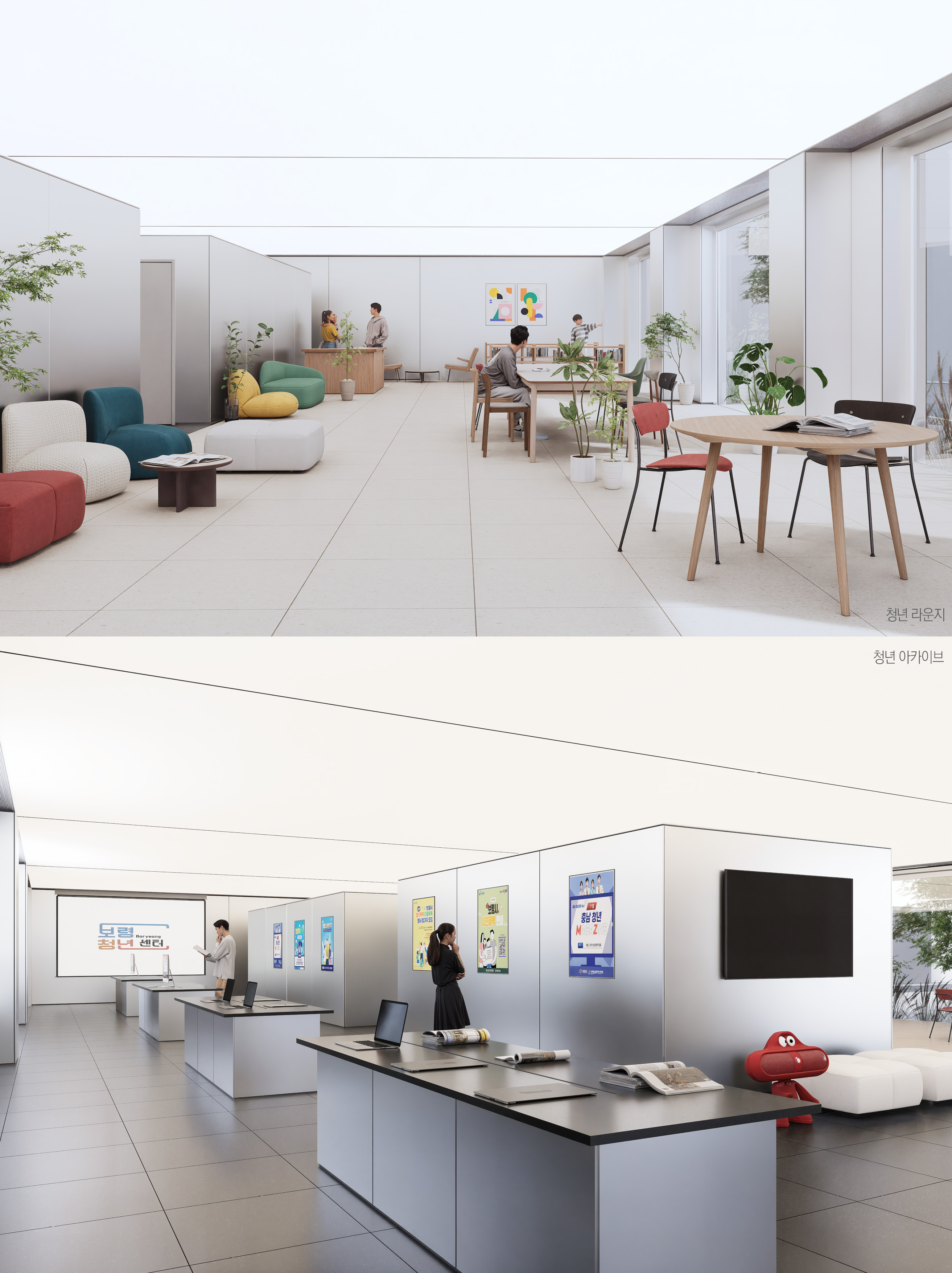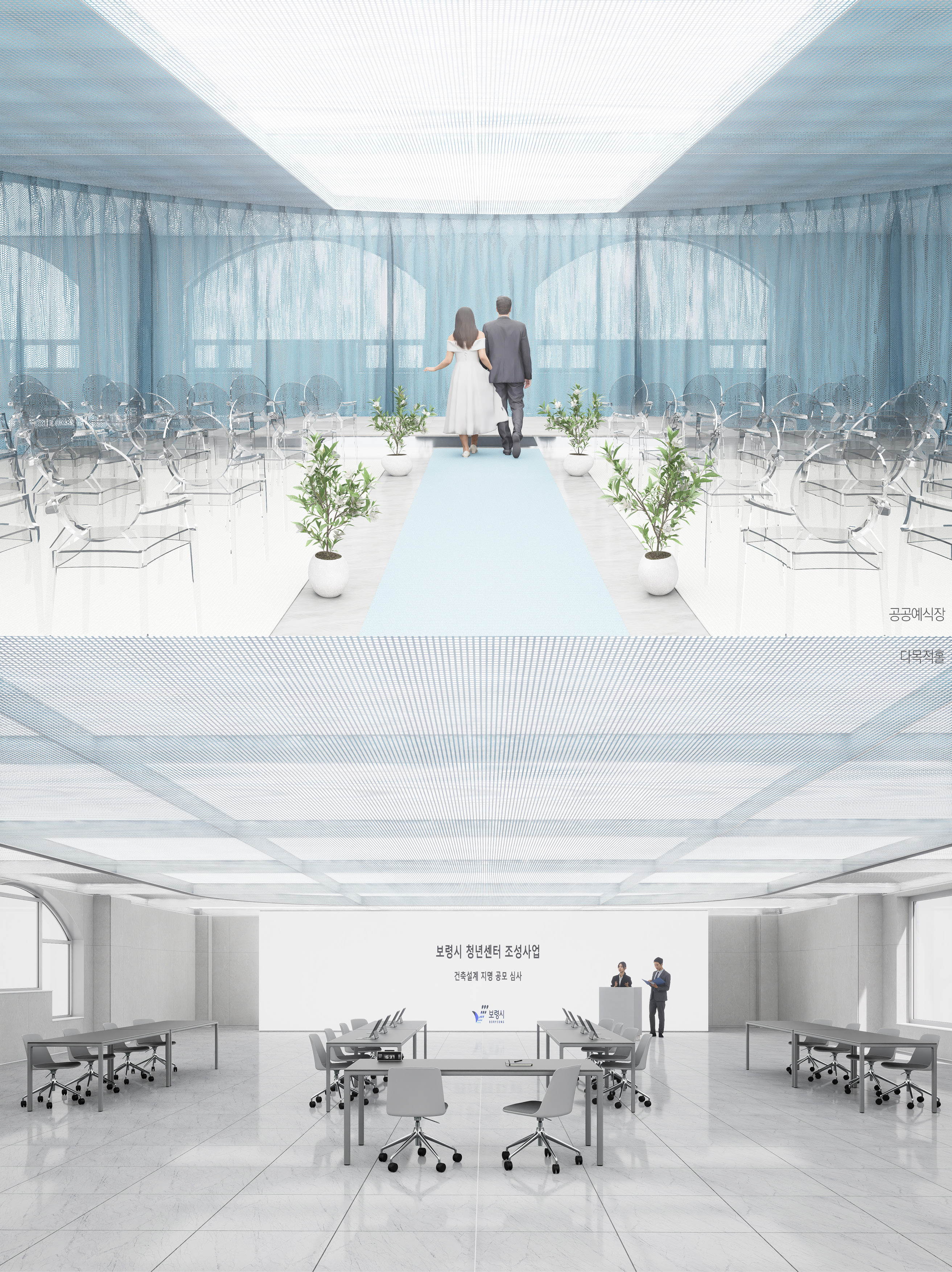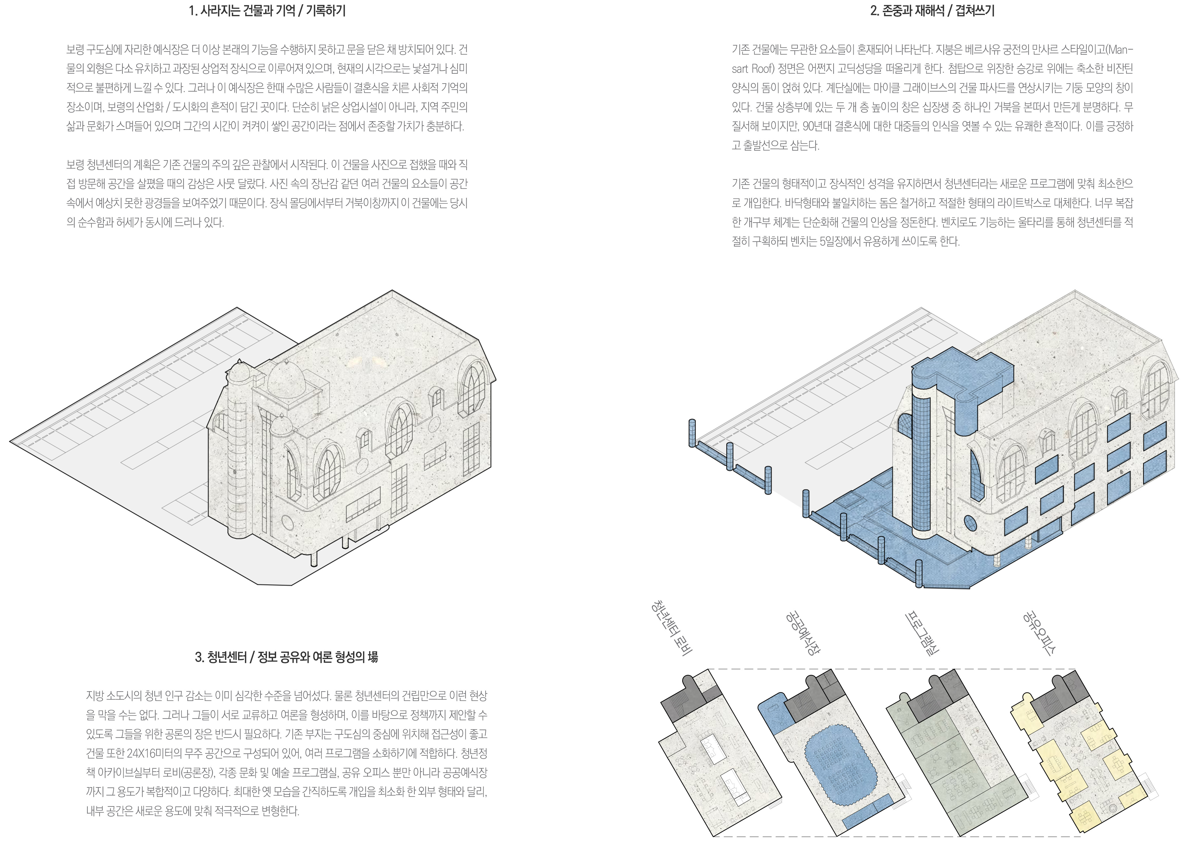 지방 소도시의 청년 인구 감소는 이미 심각한 수준을 넘어섰다. 물론 청년센터의 건립만으로 이런 현상을 막을 수는 없다. 그러나 그들이 서로 교류하고 여론을 형성하며, 이를 바탕으로 정책까지 제안할 수 있도록 그들을 위한 공론의 장은 반드시 필요하다. 기존 부지는 구도심의 중심에 위치해 접근성이 좋고 건물 또한 24X16미터의 무주 공간으로 구성되어 있어, 여러 프로그램을 소화하기에 적합하다. 청년정책 아카이브실부터 로비(공론장), 각종 문화 및 예술 프로그램실, 공유 오피스 뿐만 아니라 공공예식장까지 그 용도가 복합적이고 다양하다. 최대한 옛 모습을 간직하도록 개입을 최소화 한 외부 형태와 달리, 내부 공간은 새로운 용도에 맞춰 적극적으로 변형한다.