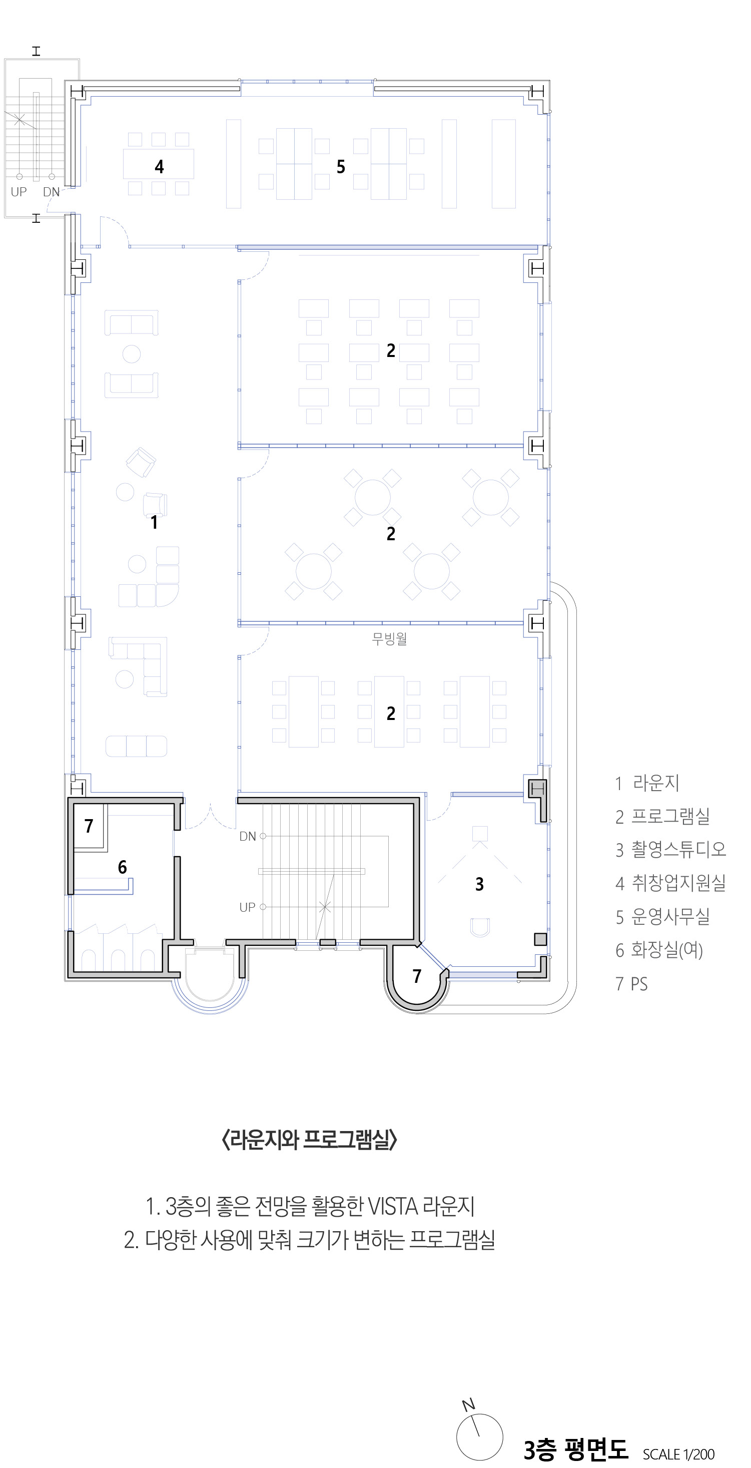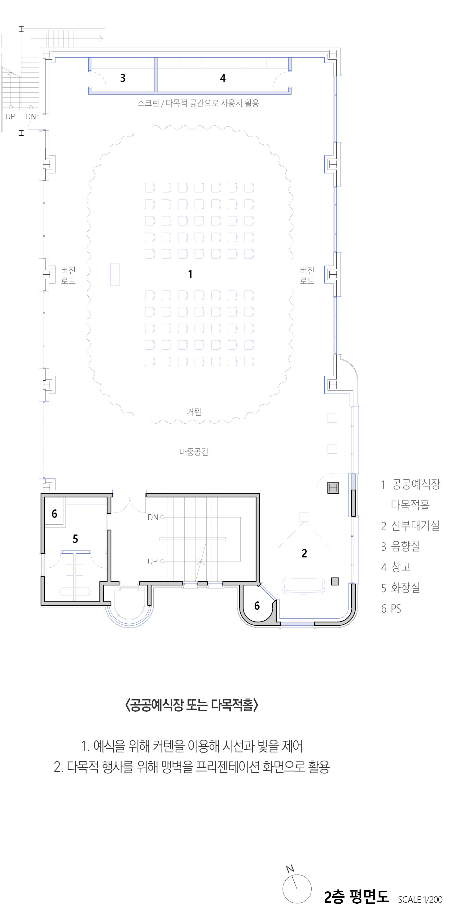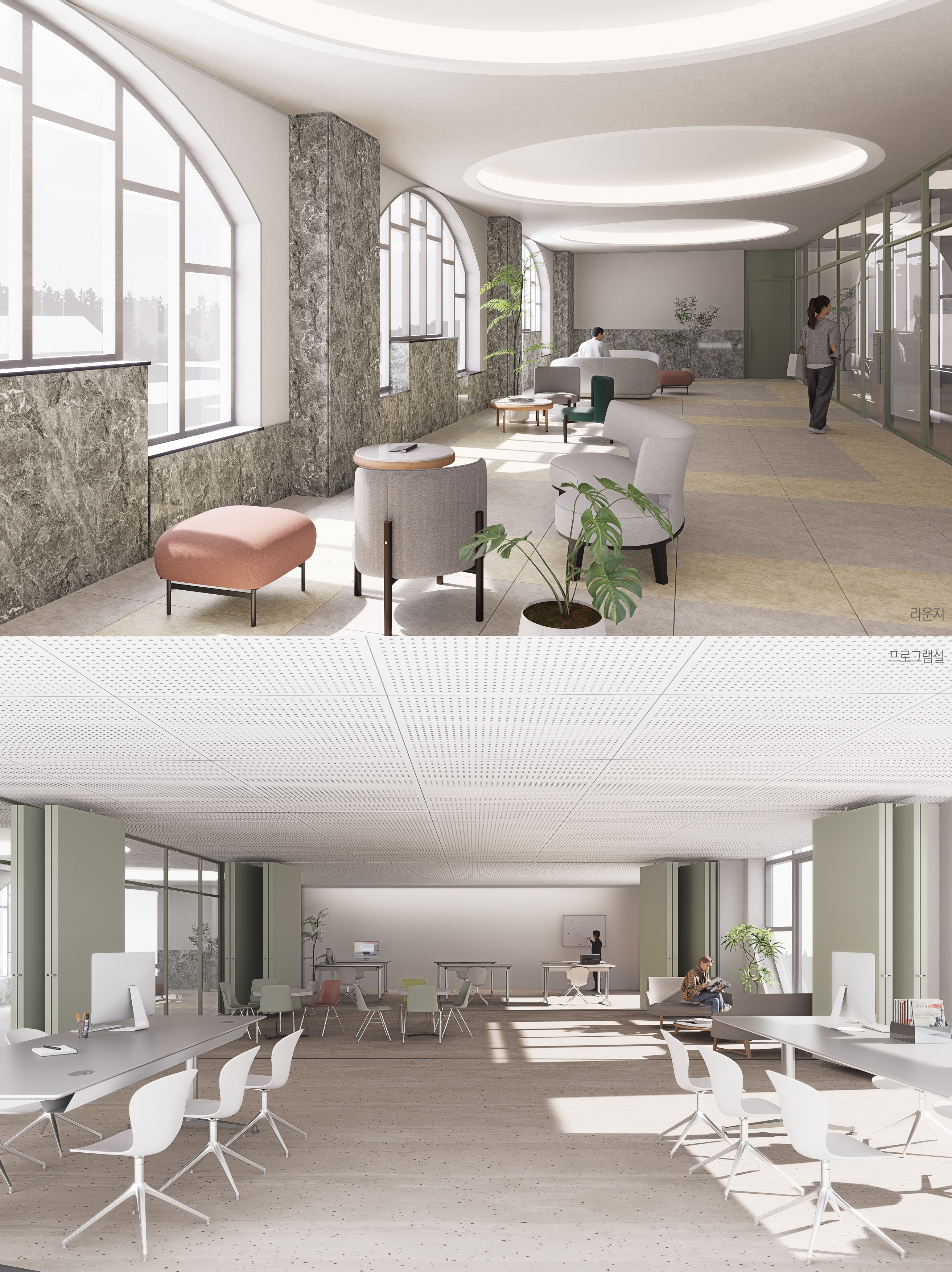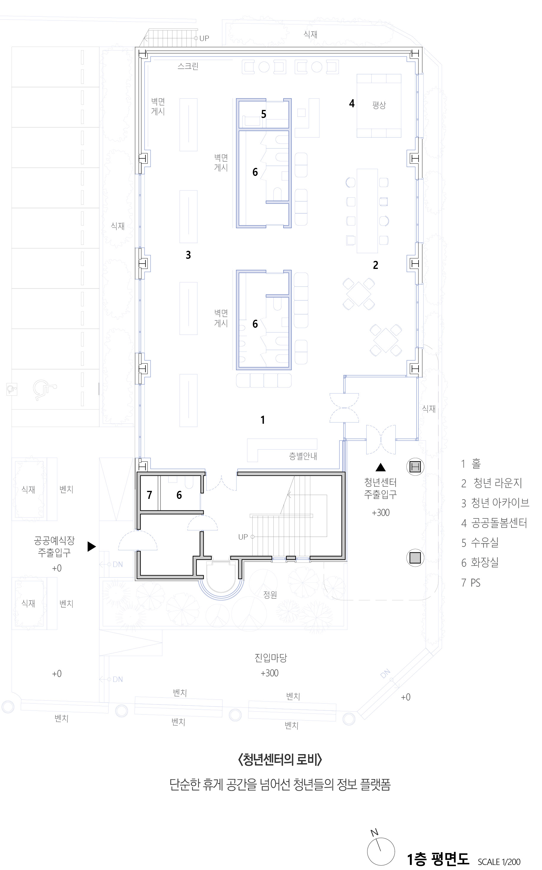 지방 소도시의 청년 인구 감소는 이미 심각한 수준을 넘어섰다. 물론 청년센터의 건립만으로 이런 현상을 막을 수는 없다. 그러나 그들이 서로 교류하고 여론을 형성하며, 이를 바탕으로 정책까지 제안할 수 있도록 그들을 위한 공론의 장은 반드시 필요하다. 기존 부지는 구도심의 중심에 위치해 접근성이 좋고 건물 또한 24X16미터의 무주 공간으로 구성되어 있어, 여러 프로그램을 소화하기에 적합하다. 청년정책 아카이브실부터 로비(공론장), 각종 문화 및 예술 프로그램실, 공유 오피스 뿐만 아니라 공공예식장까지 그 용도가 복합적이고 다양하다. 최대한 옛 모습을 간직하도록 개입을 최소화 한 외부 형태와 달리, 내부 공간은 새로운 용도에 맞춰 적극적으로 변형한다.