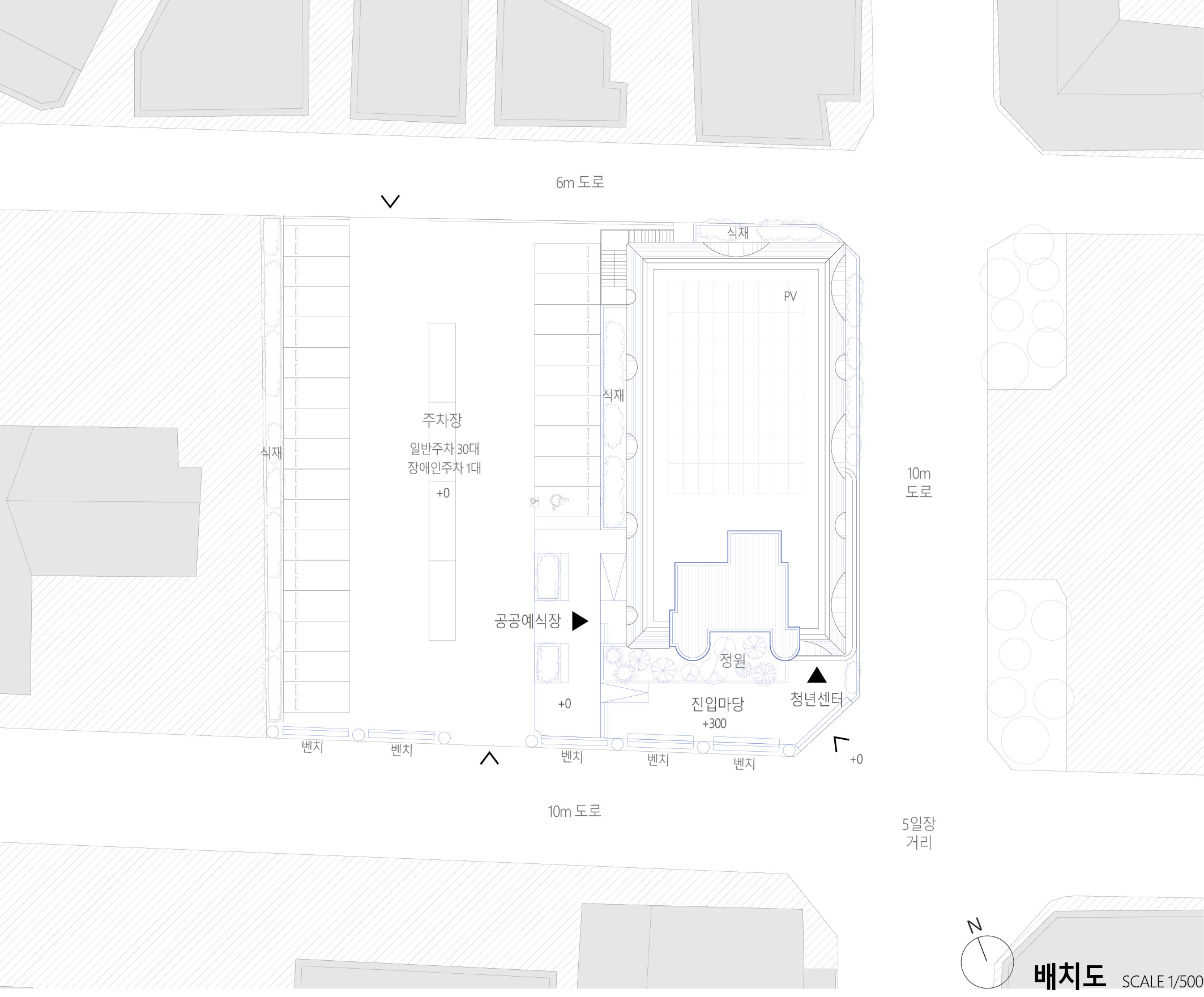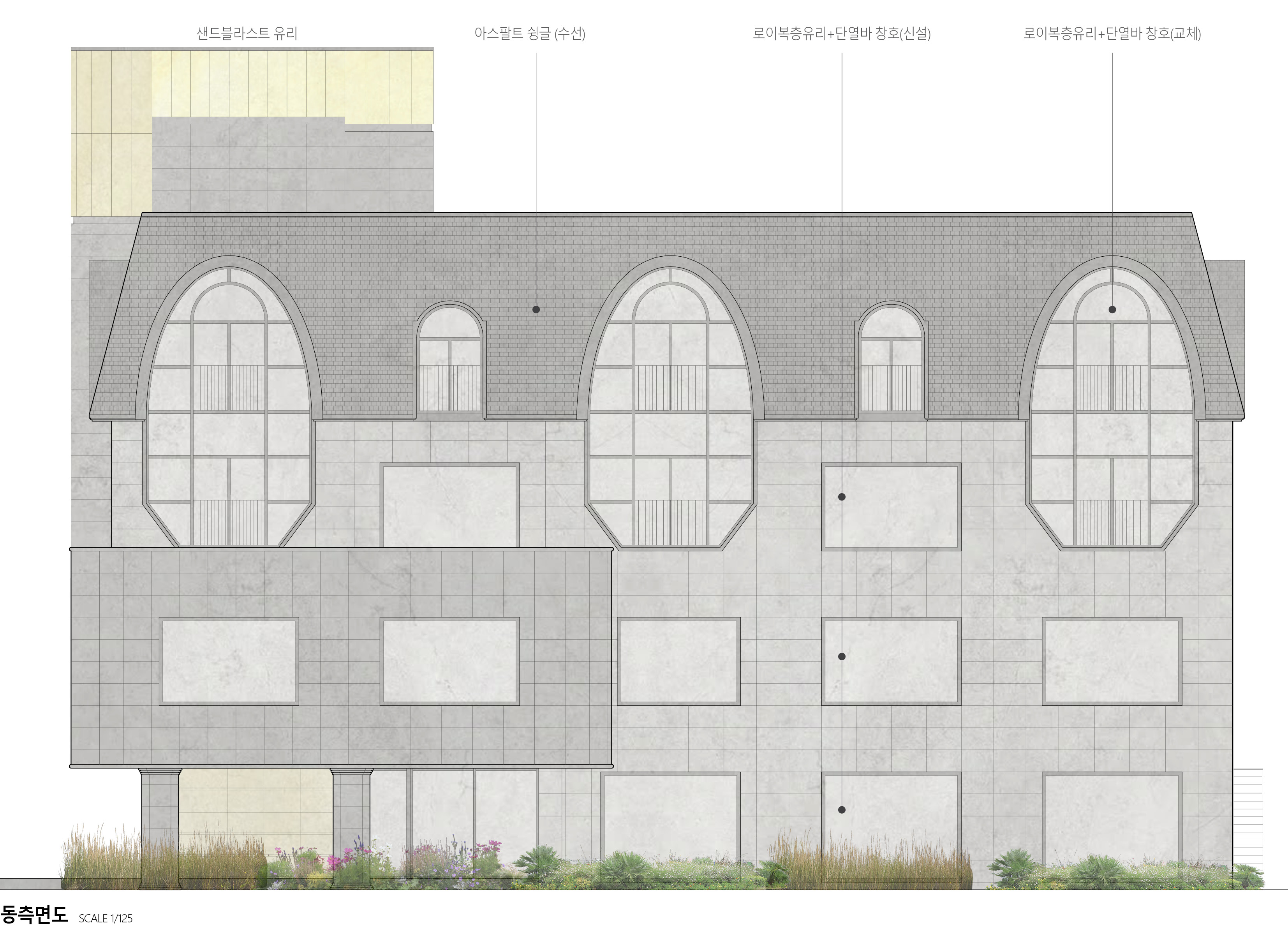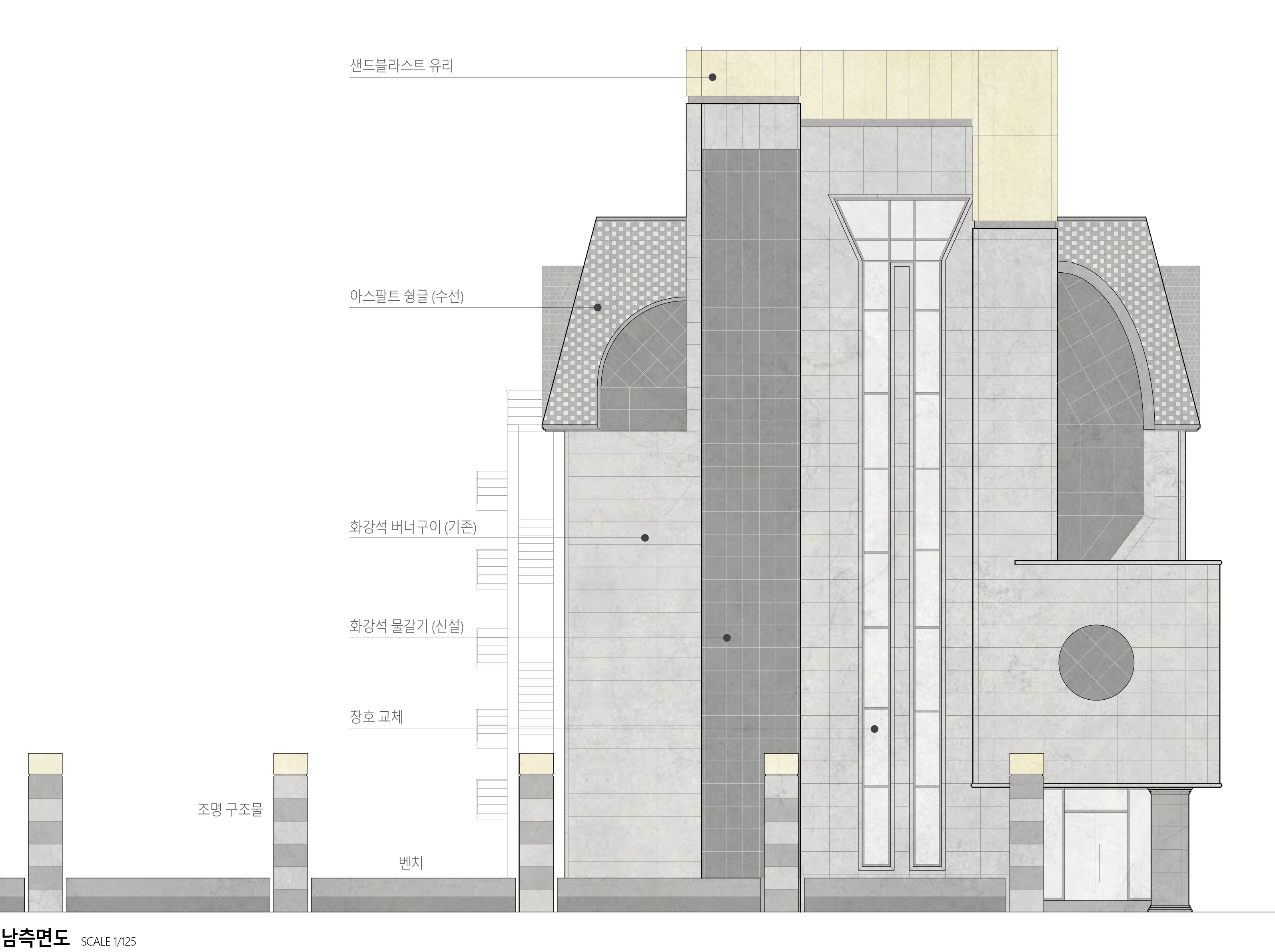 기존 건물에는 무관한 요소들이 혼재되어 나타난다. 지붕은 베르사유 궁전의 만사르 스타일이고(Mansart Roof) 정면은 어쩐지 고딕성당을 떠올리게 한다. 첨탑으로 위장한 승강로 위에는 축소한 비잔틴 양식의 돔이 얹혀 있다. 계단실에는 마이클 그래이브스의 건물 파사드를 연상시키는 기둥 모양의 창이 있다. 건물 상층부에 있는 두 개 층 높이의 창은 십장생 중 하나인 거북을 본떠서 만든게 분명하다. 무질서해 보이지만, 90년대 결혼식에 대한 대중들의 인식을 엿볼 수 있는 유쾌한 흔적이다. 이를 긍정하고 출발선으로 삼는다. 기존 건물의 형태적이고 장식적인 성격을 유지하면서 청년센터라는 새로운 프로그램에 맞춰 최소한으로 개입한다. 바닥형태와 불일치하는 돔은 철거하고 적절한 형태의 라이트박스로 대체한다. 너무 복잡한 개구부 체계는 단순화해 건물의 인상을 정돈한다. 벤치로도 기능하는 울타리를 통해 청년센터를 적절히 구획하되 벤치는 5일장에서 유용하게 쓰이도록 한다.