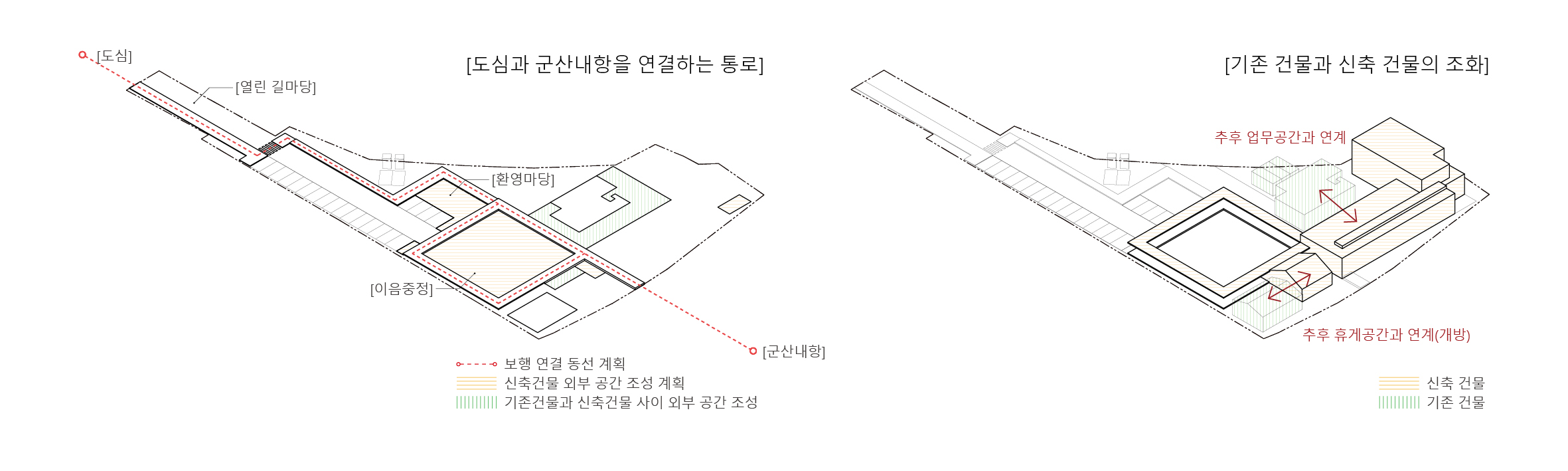 마치 강의 물길이 산과 들 사이를 유유히 흐르듯, 사람들의 동선도 건물 사이를 감싸며 이어지고 개방된 대회의실, 로비와 민원실을 통해 내항과 연결된다. 건물의 볼륨은 가급적 수평적 흐름을 유지하며 낮게 자리하되, 필요한 2층 높이의 볼륨은 서측으로 붙여 주변의 높은 건물 속으로 스며들게 하였다. 회랑의 위요감과 수평적 높이가 곧 대지의 리듬이 되도록 한 것이다. 남겨지는 두 동의 존치건물은 각기 다른 성격을 지닐 가능성이 있으므로, 신축건물의 내부 프로그램 배치는 이들과의 관계 속에서 구성되었다. 대회의실은 C동의 향후 변경될 프로그램을 고려해 공간적 흐름을 이어받고, B동은 회랑과 만나는 지점에서 하나의 건축적 오브제가 되도록 계획했다. 특히 대지를 가로지르는 지름길과 같이 새로운 도시의 통로로서 작동될 계획안은 업무영역과 공공개방영역을 명확히 구분되도록 하여, 업무환경의 집중도 및 공공건축물의 개방성을 동시에 고려하여 운영의 효율성과 다목적성을 부여하도록 계획하였다. 과거의 기억과 자연의 흐름, 그리고 도시의 시간이 어우러지는 이 새로운 작은 틈이 내항과 군산을 다시 이어줄 수 있기를 기대한다.