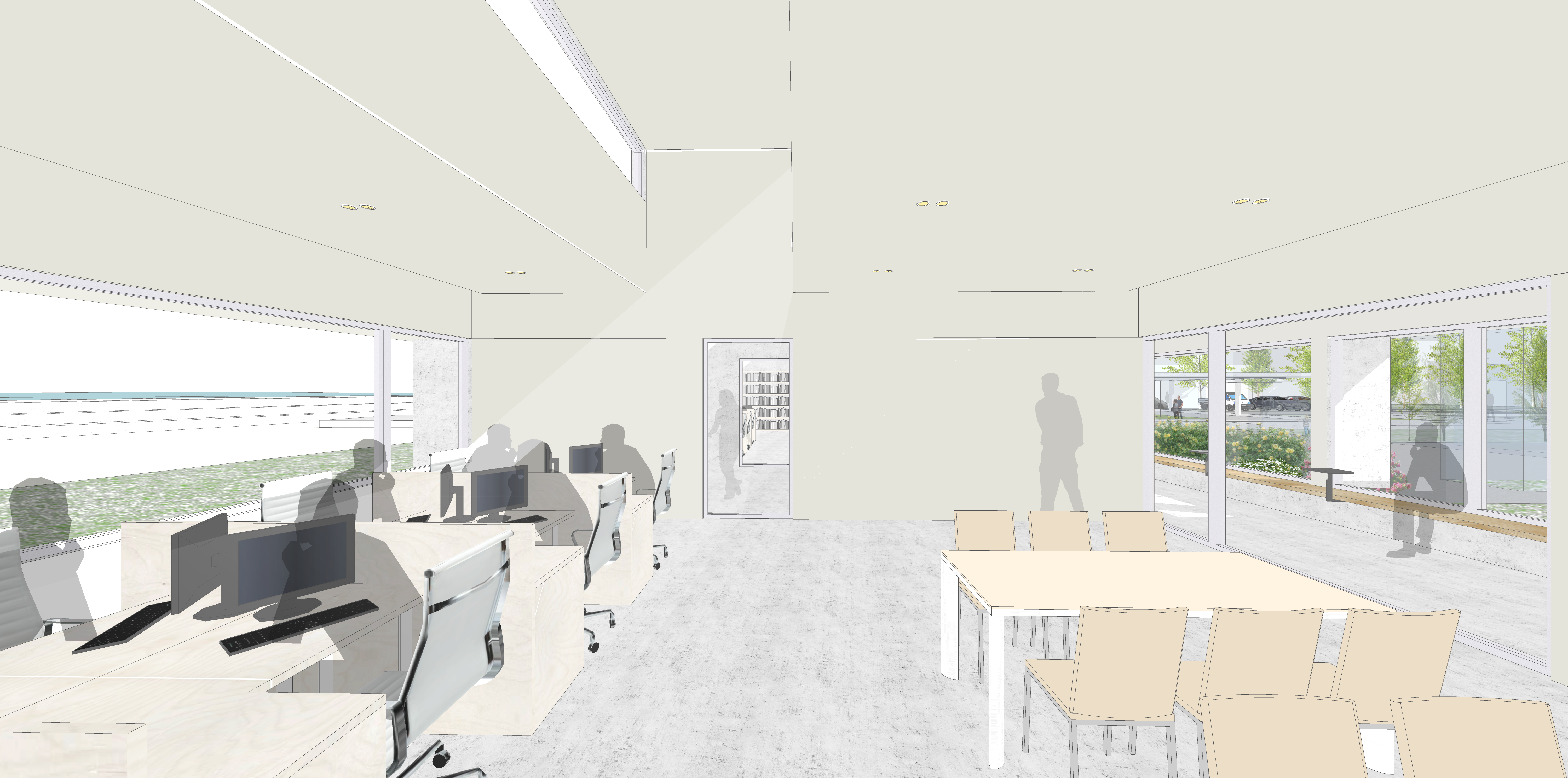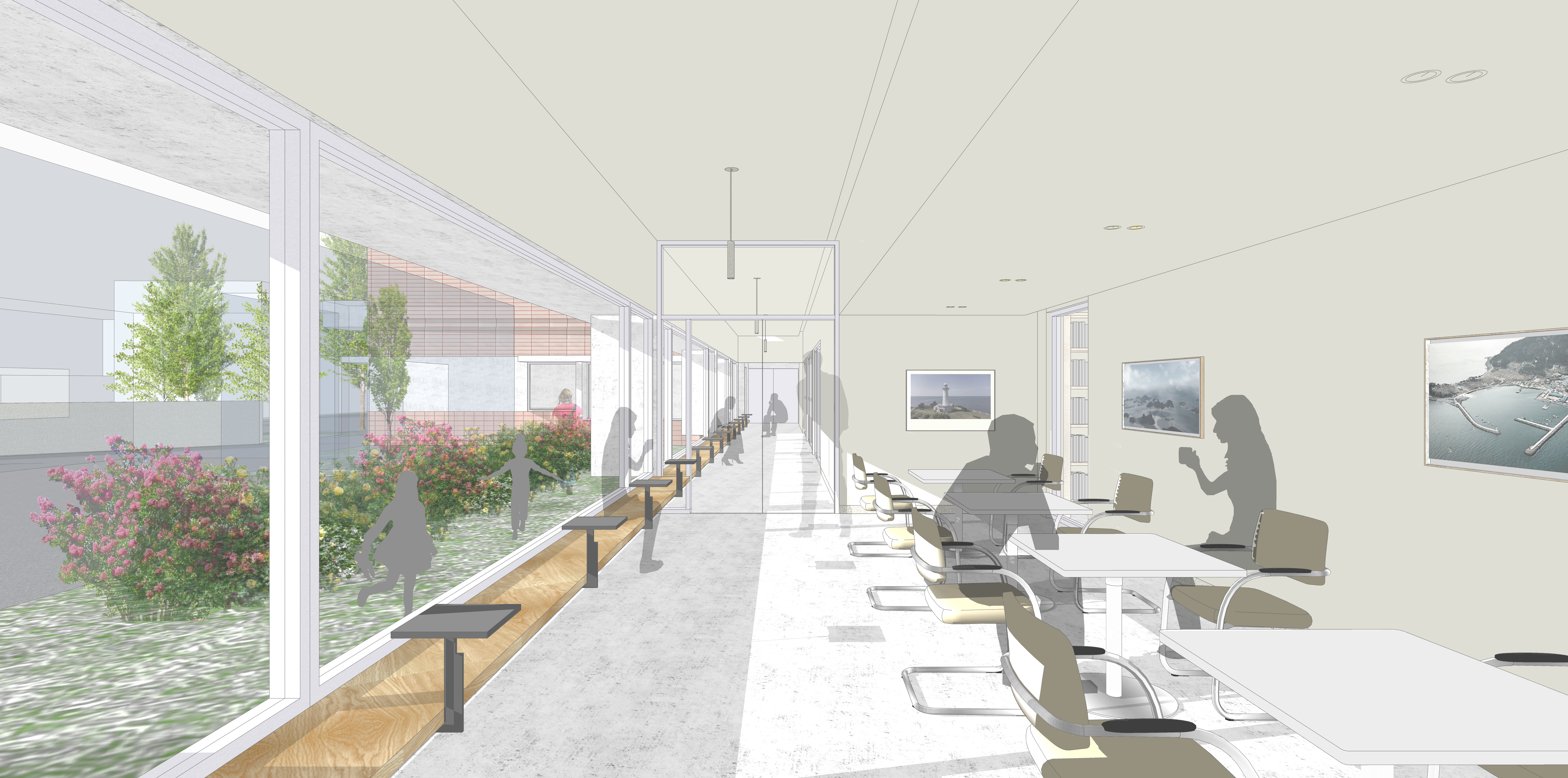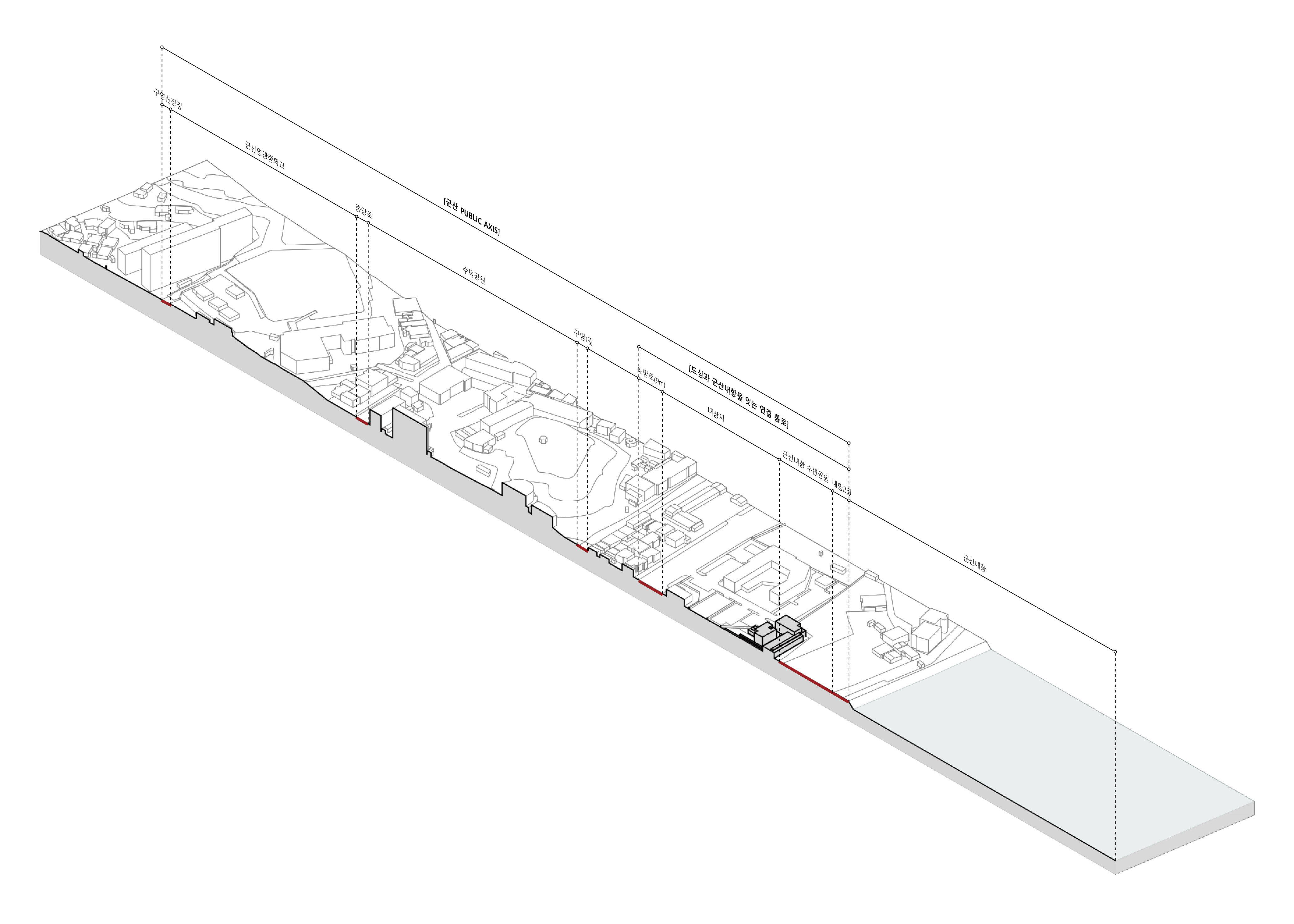 마치 강의 물길이 산과 들 사이를 유유히 흐르듯, 사람들의 동선도 건물 사이를 감싸며 이어지고 개방된 대회의실, 로비와 민원실을 통해 내항과 연결된다. 건물의 볼륨은 가급적 수평적 흐름을 유지하며 낮게 자리하되, 필요한 2층 높이의 볼륨은 서측으로 붙여 주변의 높은 건물 속으로 스며들게 하였다. 회랑의 위요감과 수평적 높이가 곧 대지의 리듬이 되도록 한 것이다. 남겨지는 두 동의 존치건물은 각기 다른 성격을 지닐 가능성이 있으므로, 신축건물의 내부 프로그램 배치는 이들과의 관계 속에서 구성되었다. 대회의실은 C동의 향후 변경될 프로그램을 고려해 공간적 흐름을 이어받고, B동은 회랑과 만나는 지점에서 하나의 건축적 오브제가 되도록 계획했다. 특히 대지를 가로지르는 지름길과 같이 새로운 도시의 통로로서 작동될 계획안은 업무영역과 공공개방영역을 명확히 구분되도록 하여, 업무환경의 집중도 및 공공건축물의 개방성을 동시에 고려하여 운영의 효율성과 다목적성을 부여하도록 계획하였다. 과거의 기억과 자연의 흐름, 그리고 도시의 시간이 어우러지는 이 새로운 작은 틈이 내항과 군산을 다시 이어줄 수 있기를 기대한다.