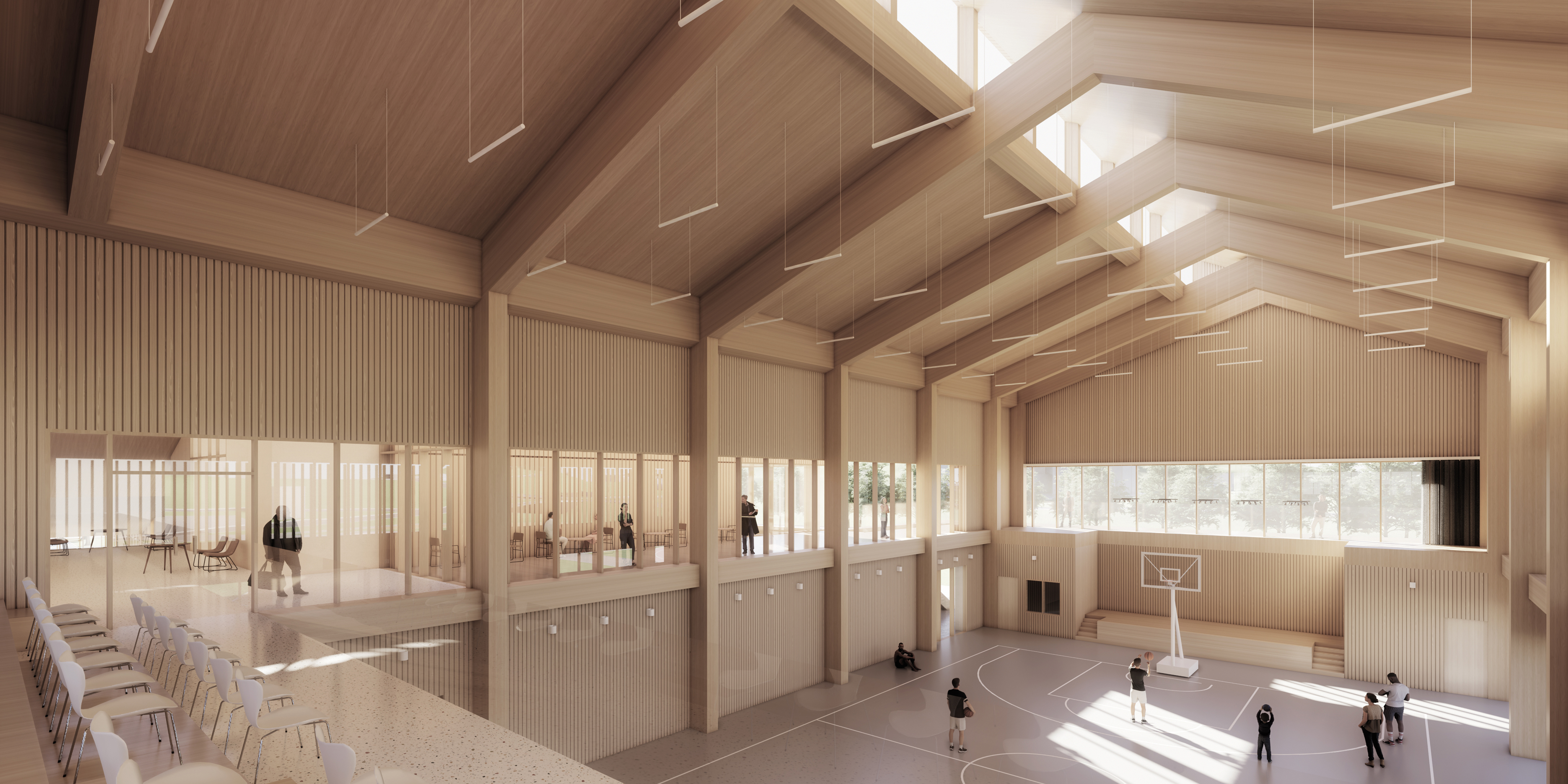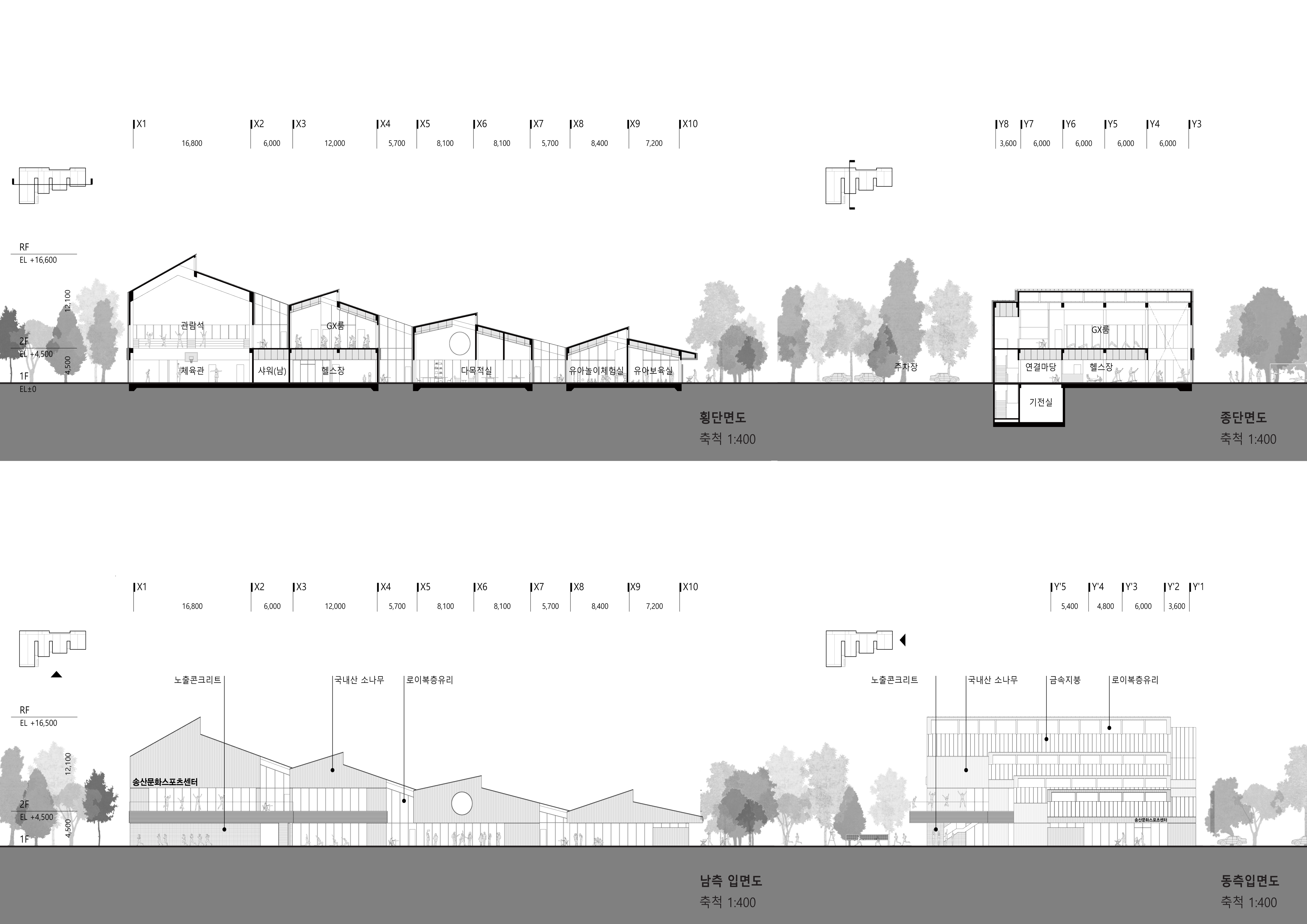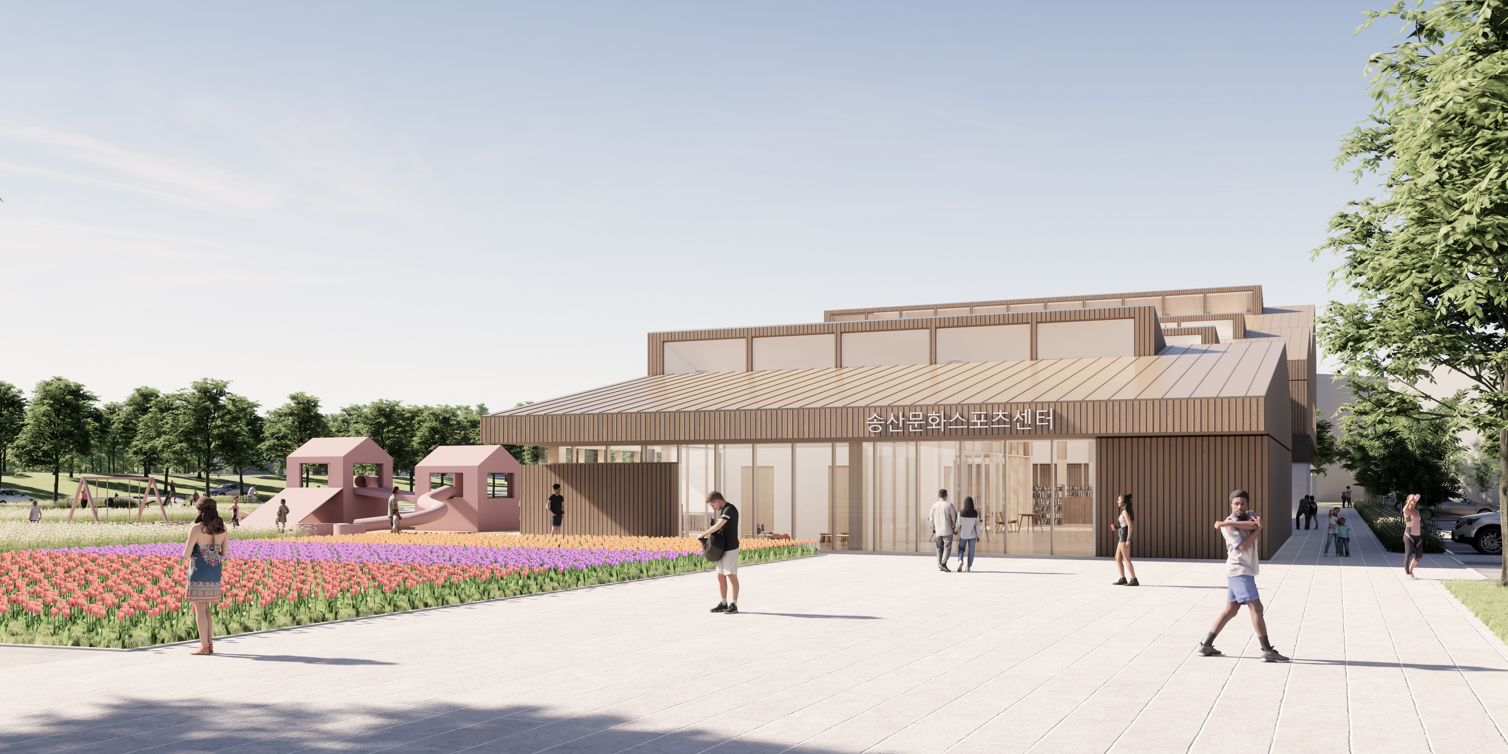 상거리는 송산이라는 지명이 유래된 소나무 산이 위치한 지역으로 송산을 상징하는 중심적 장소이다. 따라서 외장에는 송산의 지형과 기억을 담아 소나무 목재를 사용하여 장소성을 환기하는 건축적 표현 장치로 사용한다. 송산문화스포츠센터는 단순한 기능의 그릇을 넘어, 다양한 삶의 방식과 전 세대의 시간이 흐르는 열린 공동체의 장으로서 지역의 자연과 기억, 그리고 주민들의 일상이 자연스럽게 스며드는 공공 건축이 되고자한다.