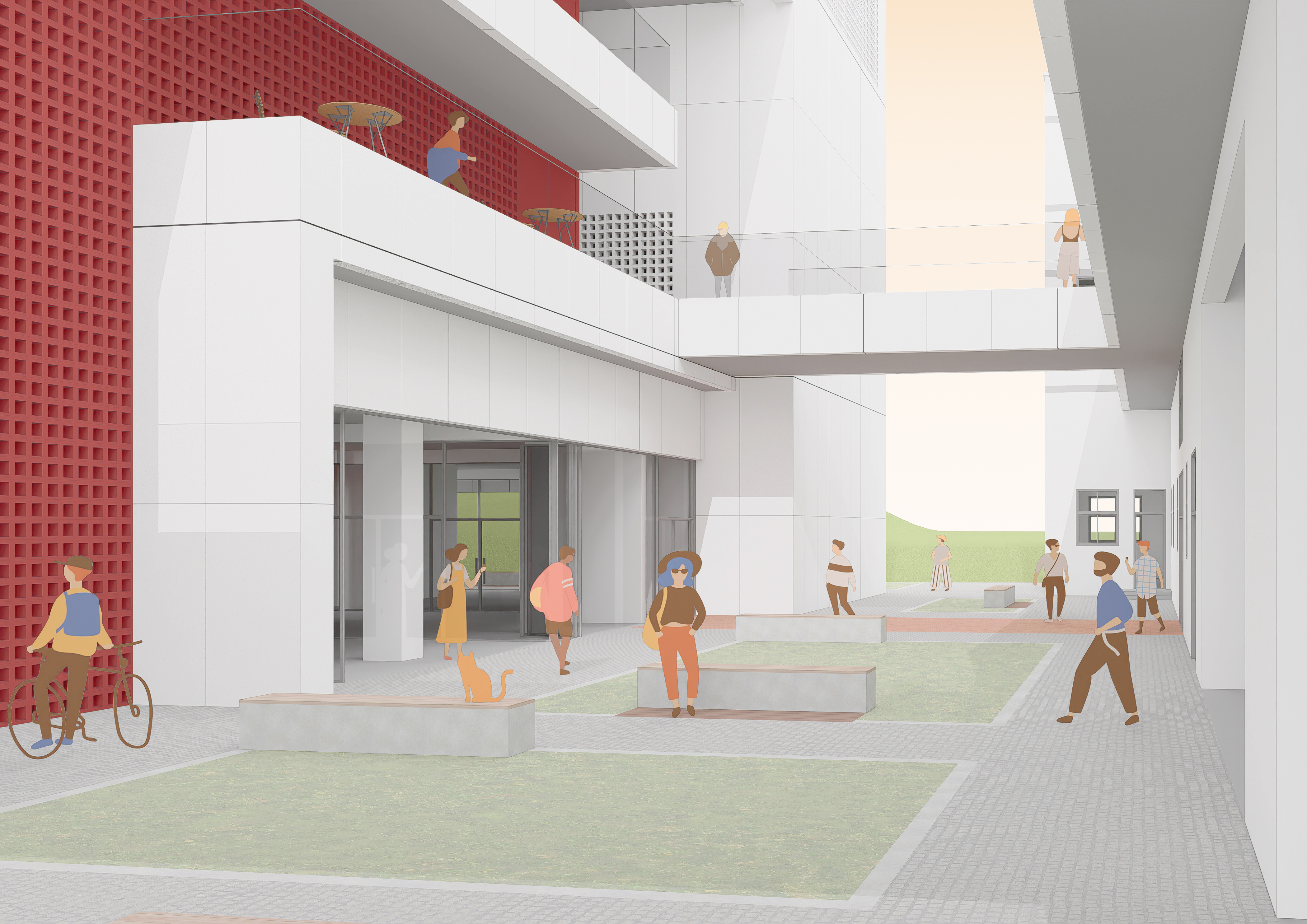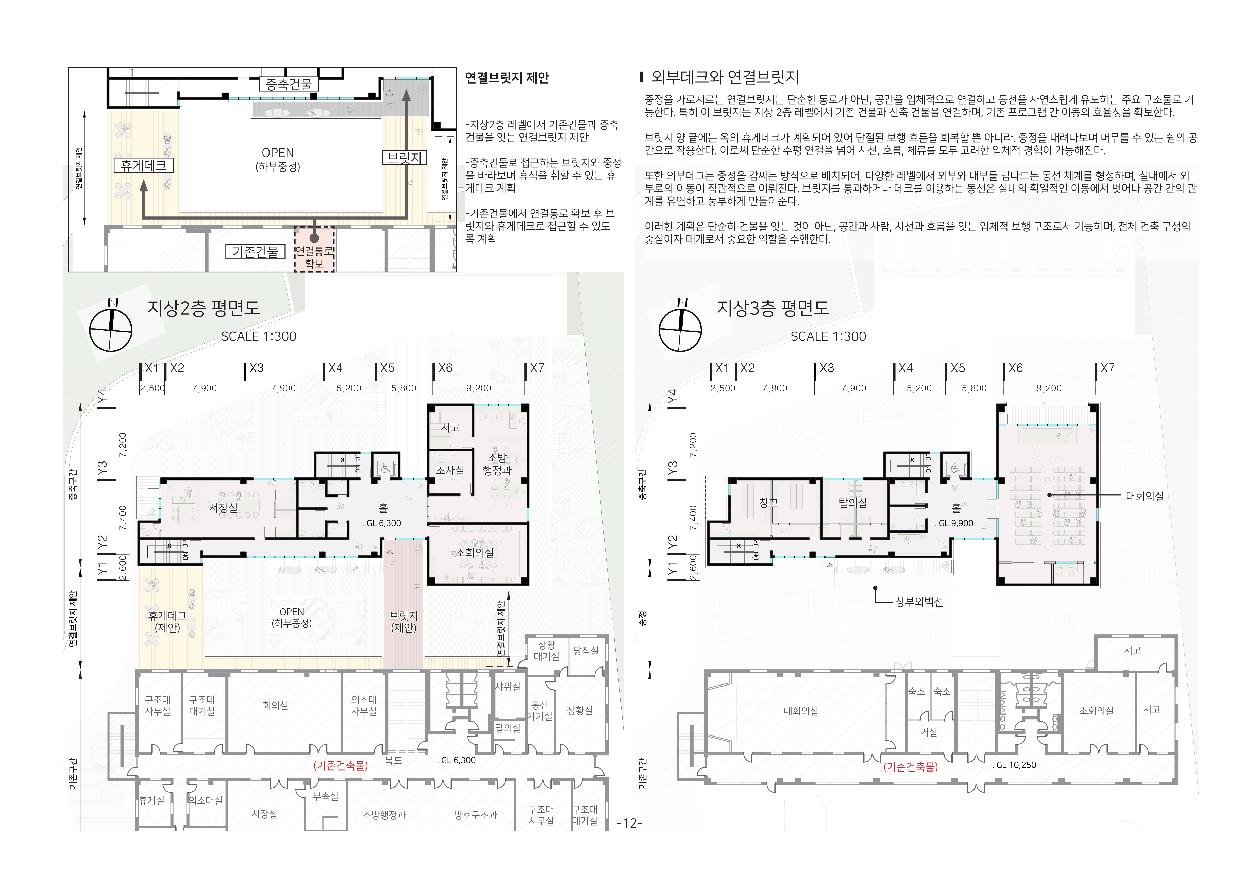 두 건물이 마주하는 공간 사이에는 어쩔 수 없이 여백이 생긴다. 하지만 우리는 이 간격을 ‘단절’이 아니라 ‘틈’으로 해석했으며, 그 틈은 단순한 빈 공간이 아니라, 빛과 공기, 사람의 움직임이 스며드는 장소가 된다. 틈은 두 건물을 분리하는 장벽이 아니라, 관계를 매개하는 통로이며, 서로 다른 조직이 긴장을 풀고 자연스럽게 만날 수 있는 장치가 된다. 이 개념은 이후 중정, 브릿지, 데크라는 구체적 공간 장치로 구현되었다.