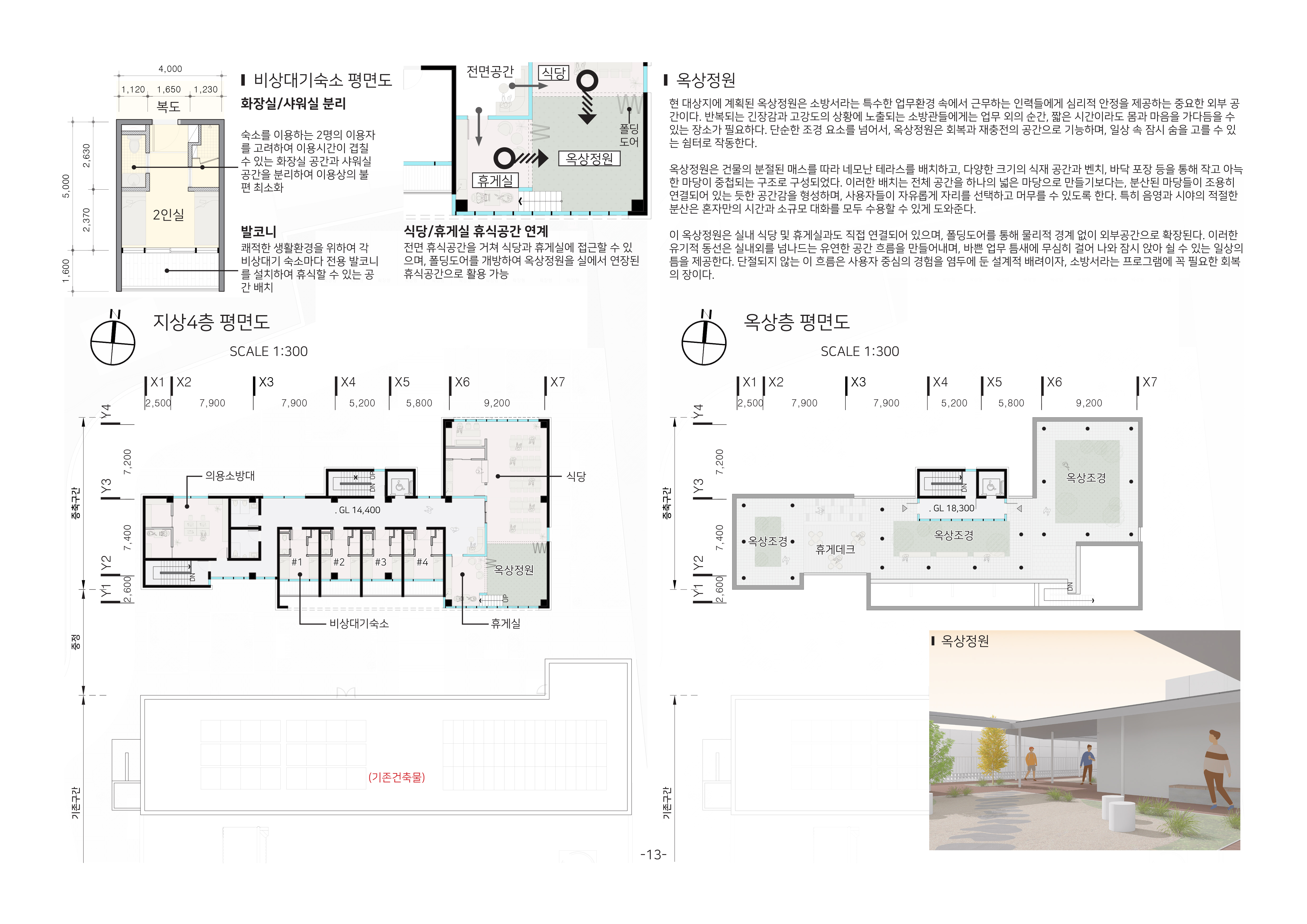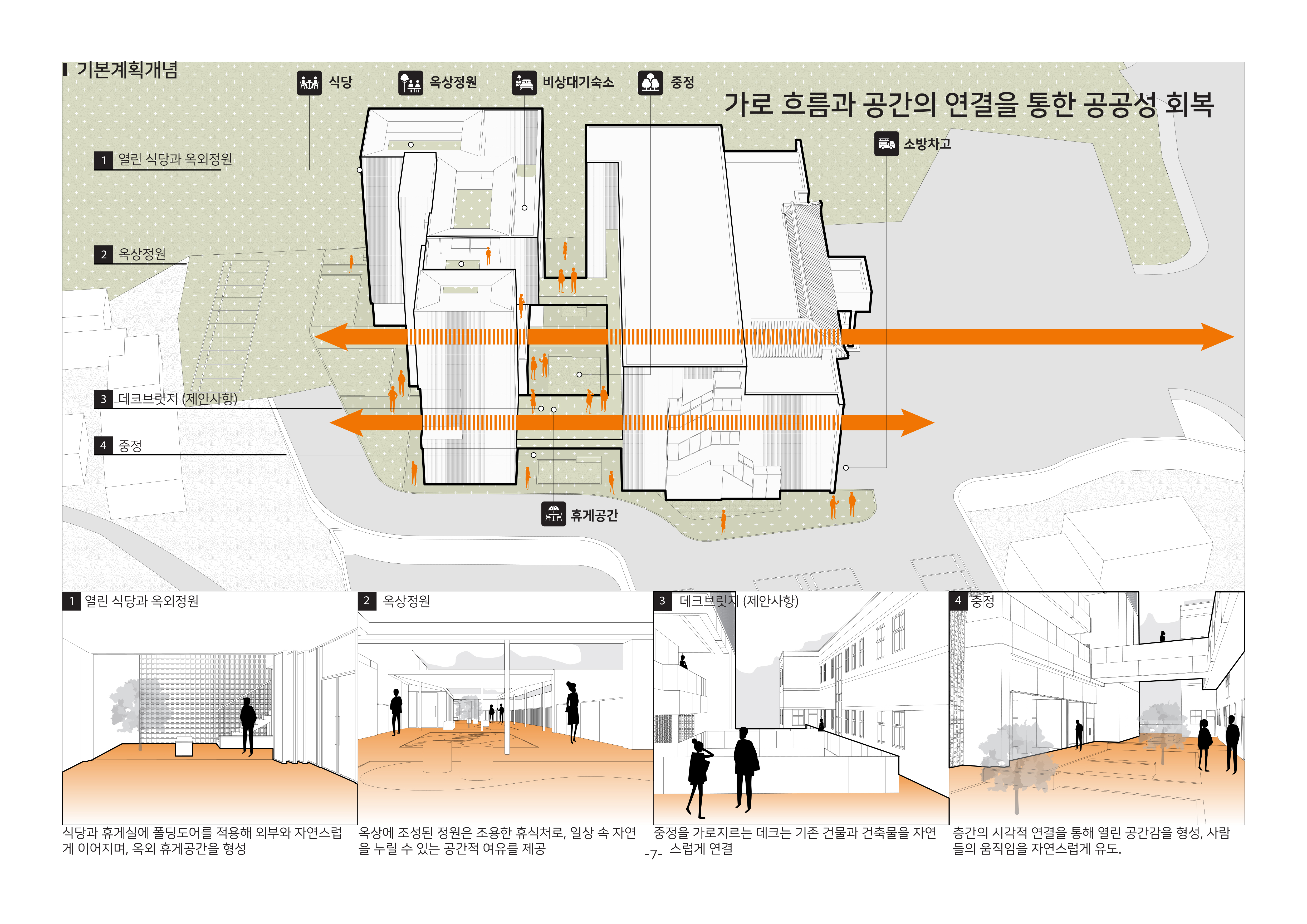 중정은 두 건물 사이의 열린 무대이자 중심 공간이다. 이곳은 소방관의 휴식처이자, 시민과 만나는 열린 장소가 되어 건물의 안과 밖을 하나로 묶는다. 브릿지는 단순히 건물 간 이동을 위한 수평 연결통로를 넘어, 머무르고 교류할 수 있는 장치로 작동했다. 또한 데크와 옥상정원은 고강도의 업무 속에서도 잠시 숨을 고를 수 있는 치유의 공간이 되며, 동시에 도시 풍경과 맞닿아 소방서가 지역사회와 시각적으로 소통하는 무대로 확장되었다.
