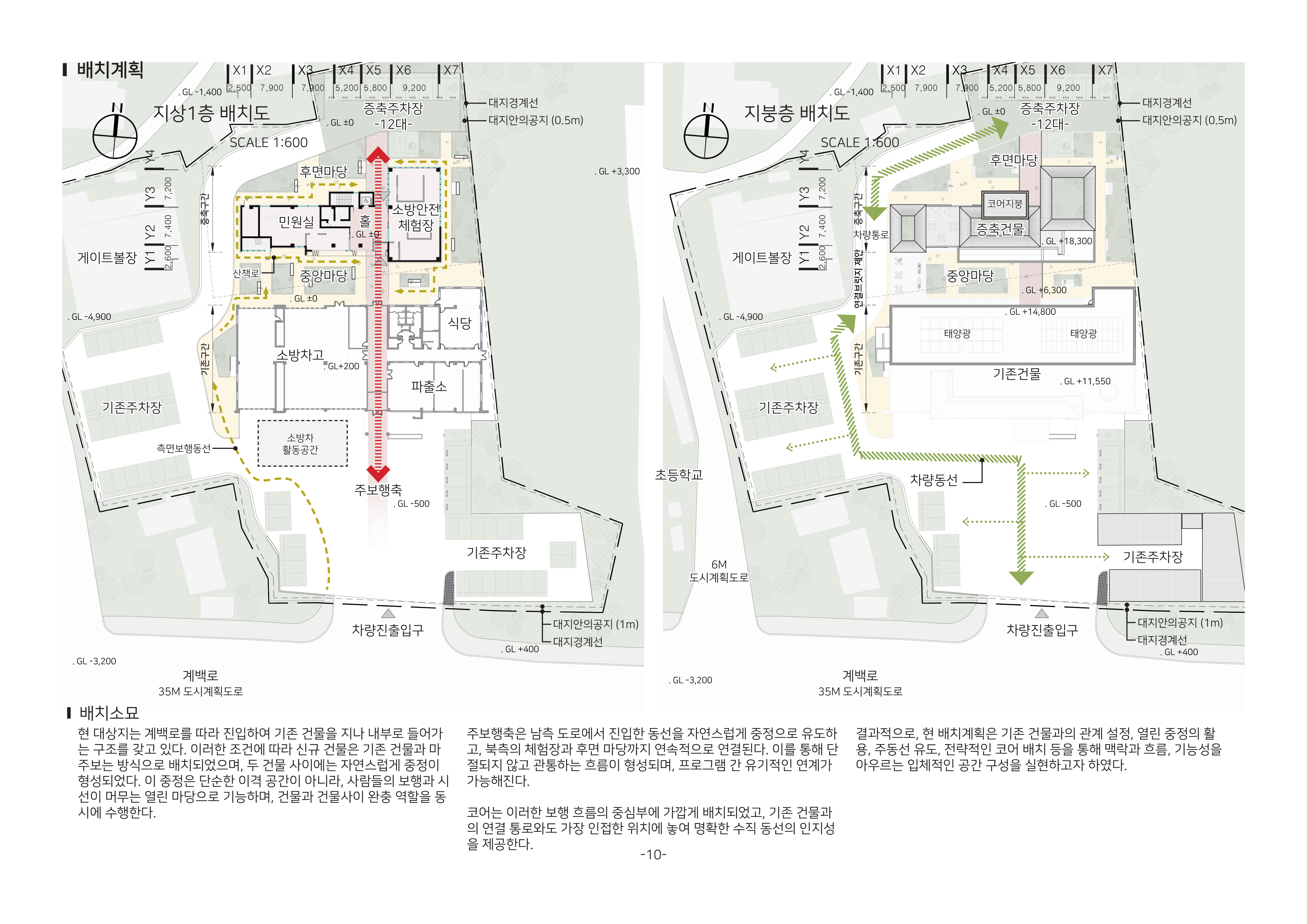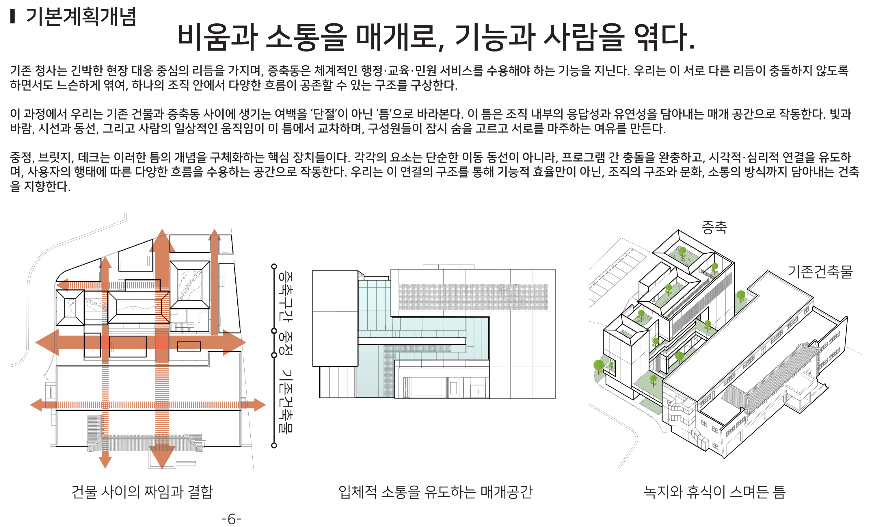증축 부지는 기존 청사 후면의 테니스장 자리로, 접근 과정에서 좁은 통로를 반드시 지나야 한다. 이곳은 차량과 보행자가 얽히는 구조여서 이용자의 동선 인지가 어렵고, 자칫 증축 건물이 고립될 우려가 있었다. 우리는 이 문제를 단순한 진입 동선의 개선으로 보지 않았다. 오히려 출동, 생활, 행정이라는 성격이 다른 세 가지 조직이 어떻게 하나의 유기적 흐름을 공유할 수 있을지를 설계의 중심 과제로 삼았다. 증축은 독립성을 유지하면서도, 기존 청사와 분리되지 않고 긴밀히 호응하는 구조로 나아가야 했다.
