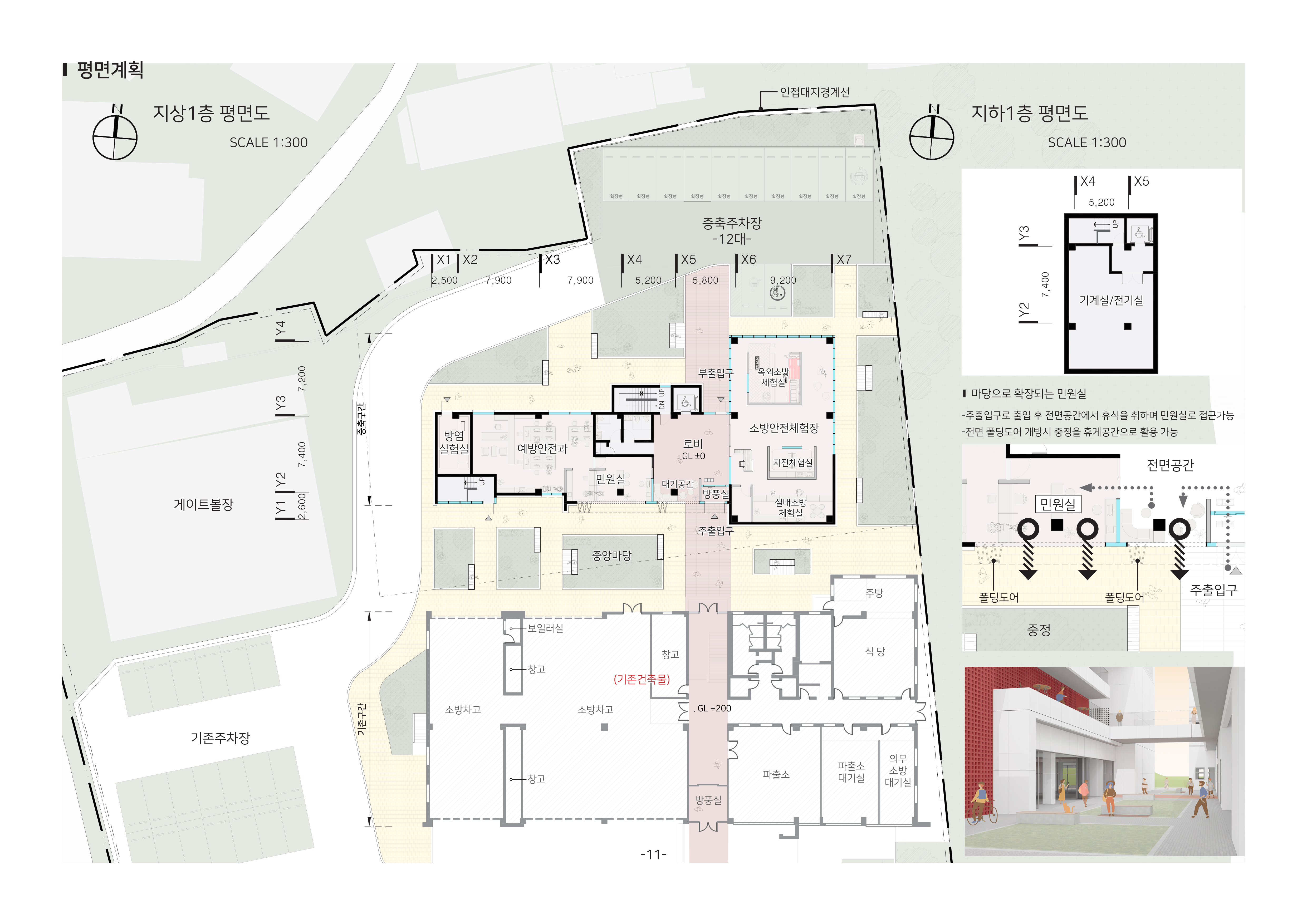 증축 부지는 기존 청사 후면의 테니스장 자리로, 접근 과정에서 좁은 통로를 반드시 지나야 한다. 이곳은 차량과 보행자가 얽히는 구조여서 이용자의 동선 인지가 어렵고, 자칫 증축 건물이 고립될 우려가 있었다. 우리는 이 문제를 단순한 진입 동선의 개선으로 보지 않았다. 오히려 출동, 생활, 행정이라는 성격이 다른 세 가지 조직이 어떻게 하나의 유기적 흐름을 공유할 수 있을지를 설계의 중심 과제로 삼았다. 증축은 독립성을 유지하면서도, 기존 청사와 분리되지 않고 긴밀히 호응하는 구조로 나아가야 했다.