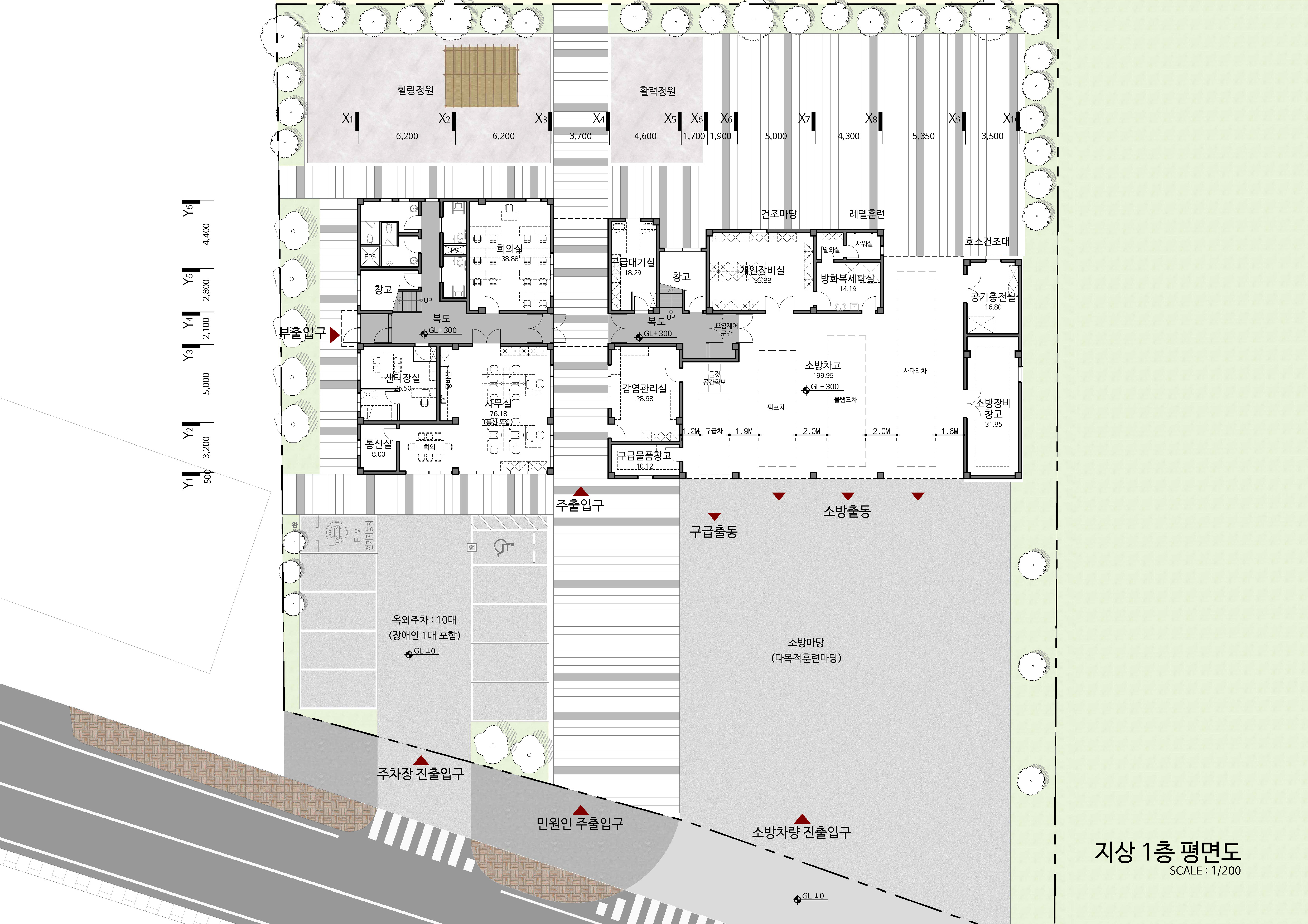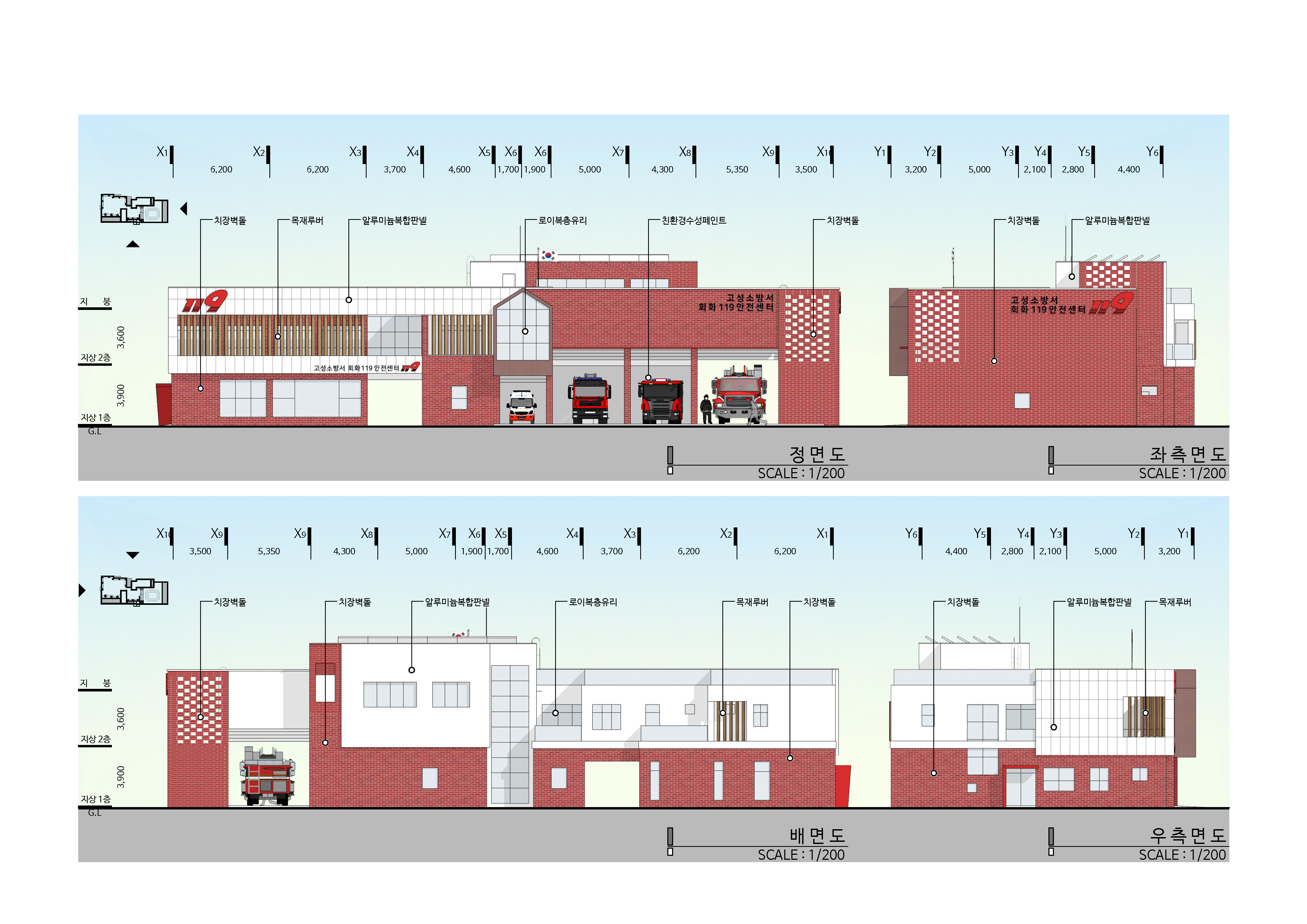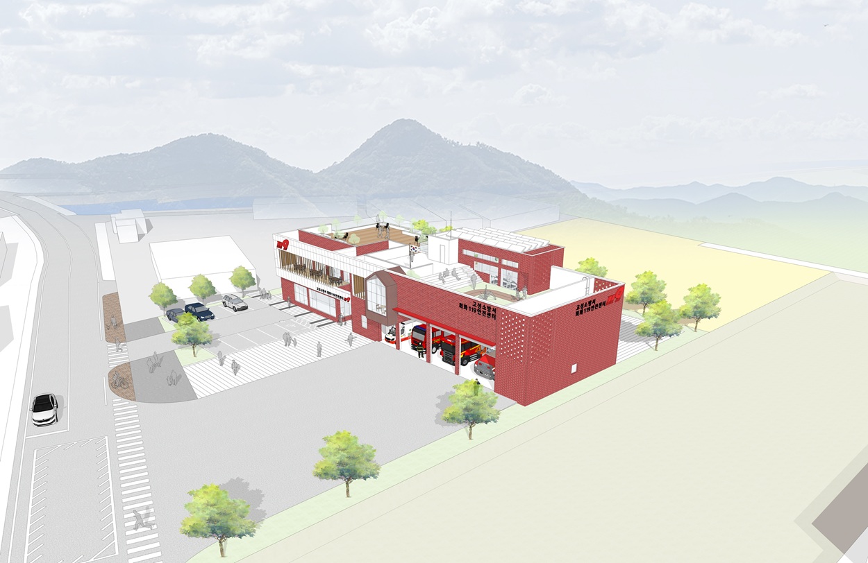 이 소방서는 단순한 업무시설이 아닌, 마을과 함께 호흡하는 ‘열린 안전 거점’입니다. 우리는 ‘24시간 깨어 있는 마을의 등대’라는 개념에서 출발했습니다. 주요 진입부는 누구에게나 열려 있으며, 소방대원들의 동선은 신속성과 효율성을 중심으로 동선을 계획하였습니다. 또한 훈련장은 반개방형으로 설계되어 마을 아이들과 주민들이 일상 속에서 안전을 체험하는 교육의 장이 됩니다. 이처럼, 본 소방서는 기능을 넘어 지역사회와 공감하는 공간이자 상징적 건축물로 자리잡기를 기대합니다.