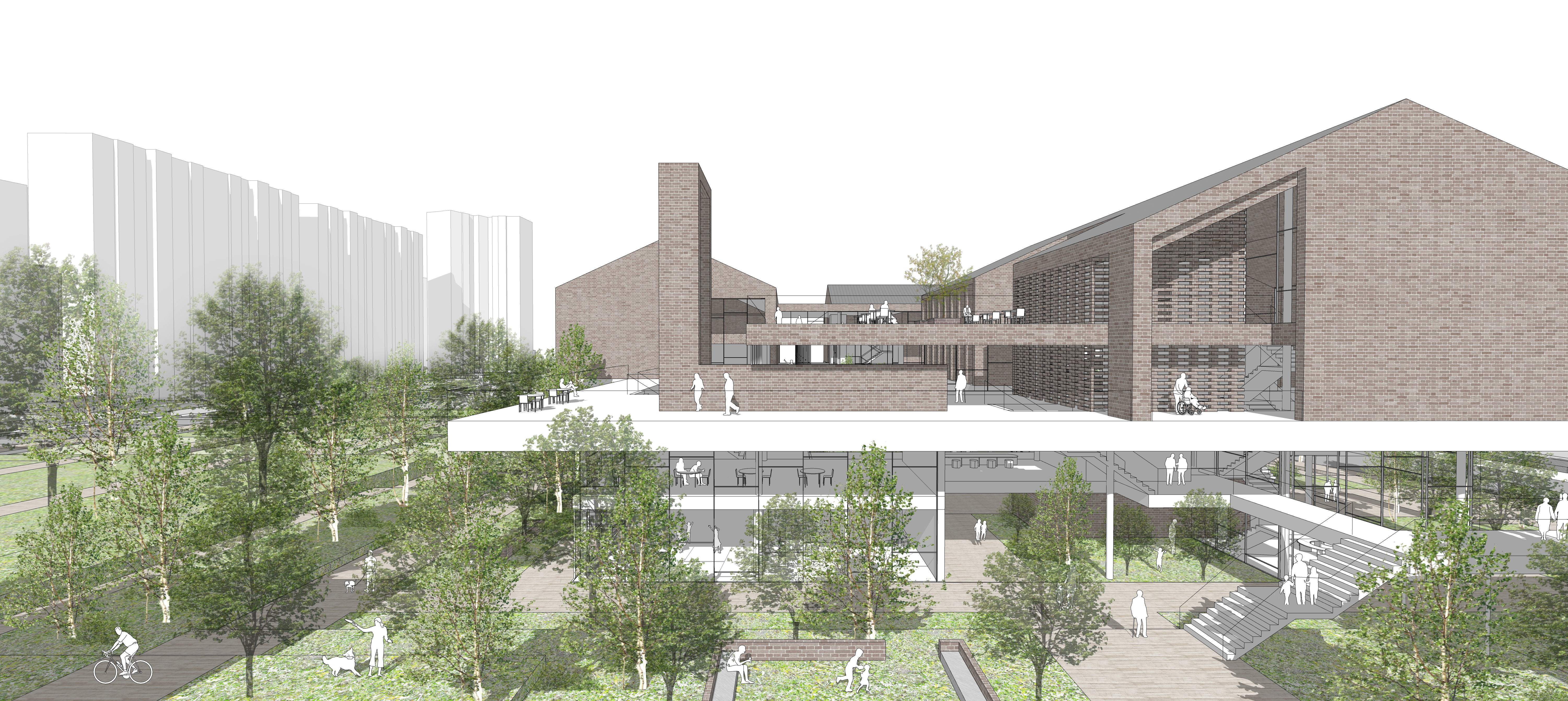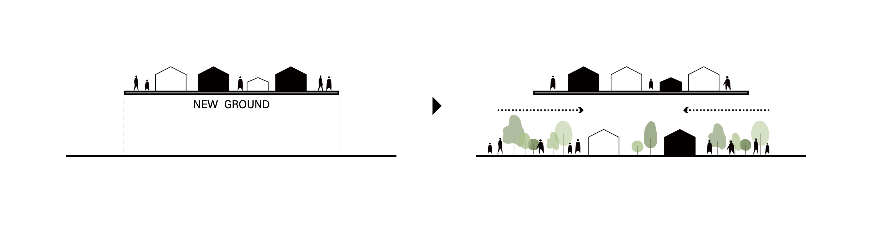 노인복지관을 위한 대지는 공중으로 들어 올려지고, 그 아래 남겨진 대지의 많은 여백은 마주침 공간과 함께 모두가 누릴 수 있는 녹지공원으로 조성된다.