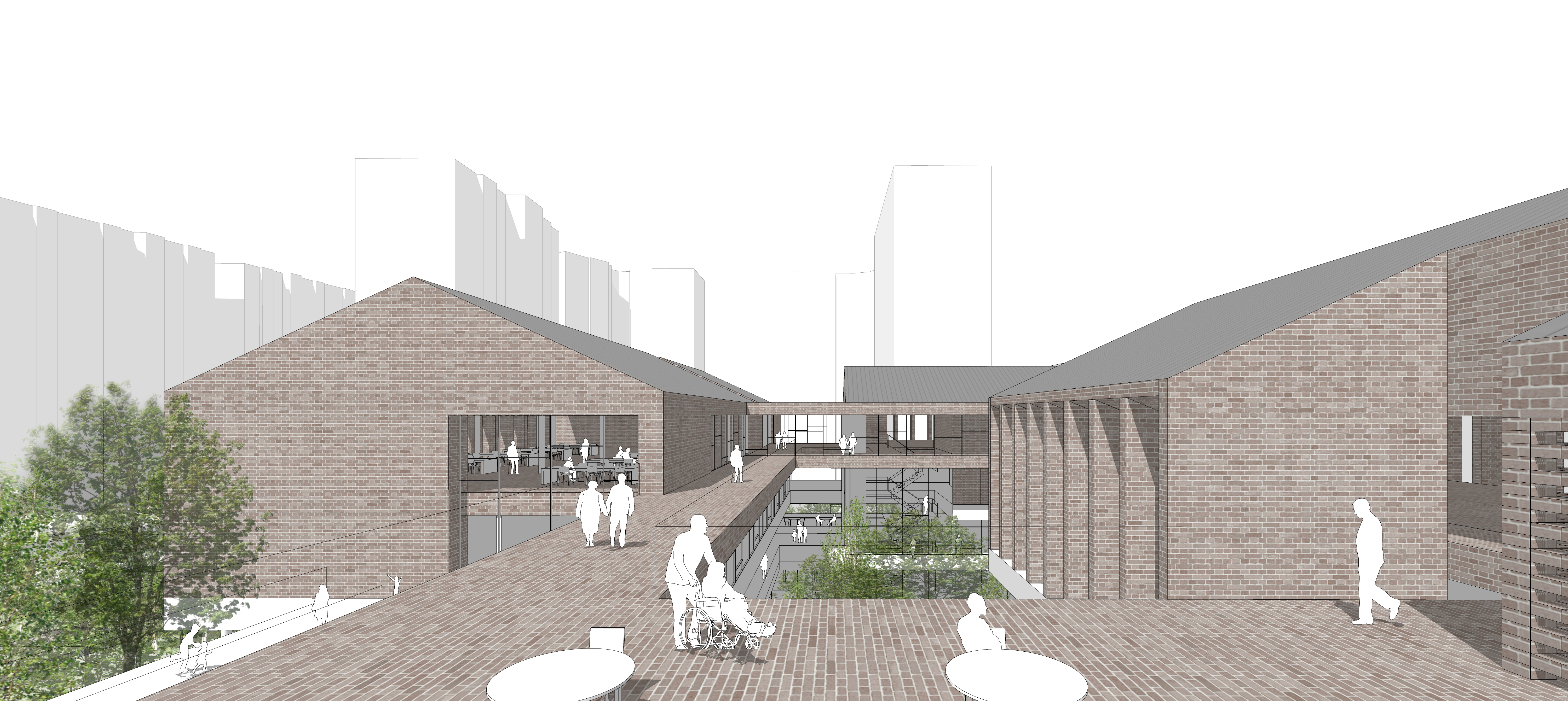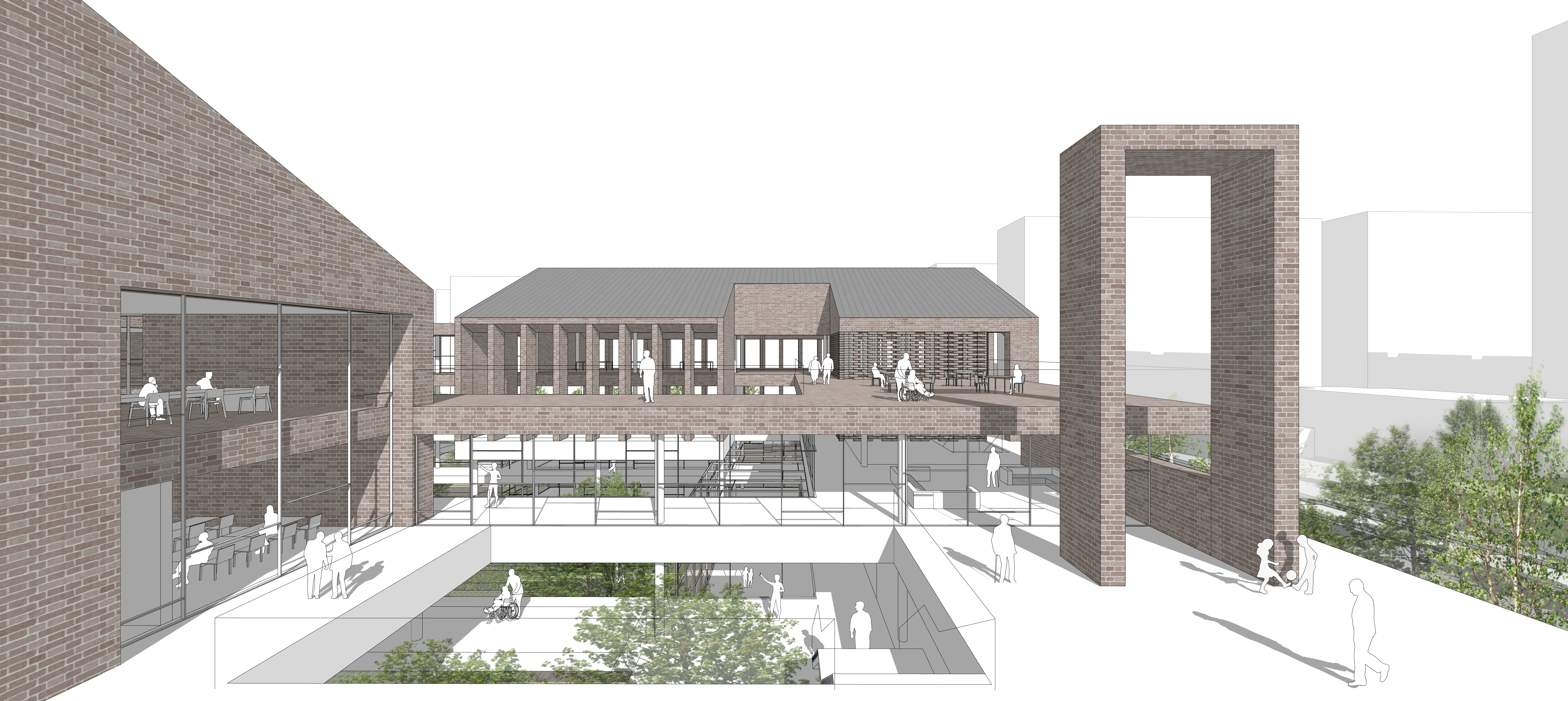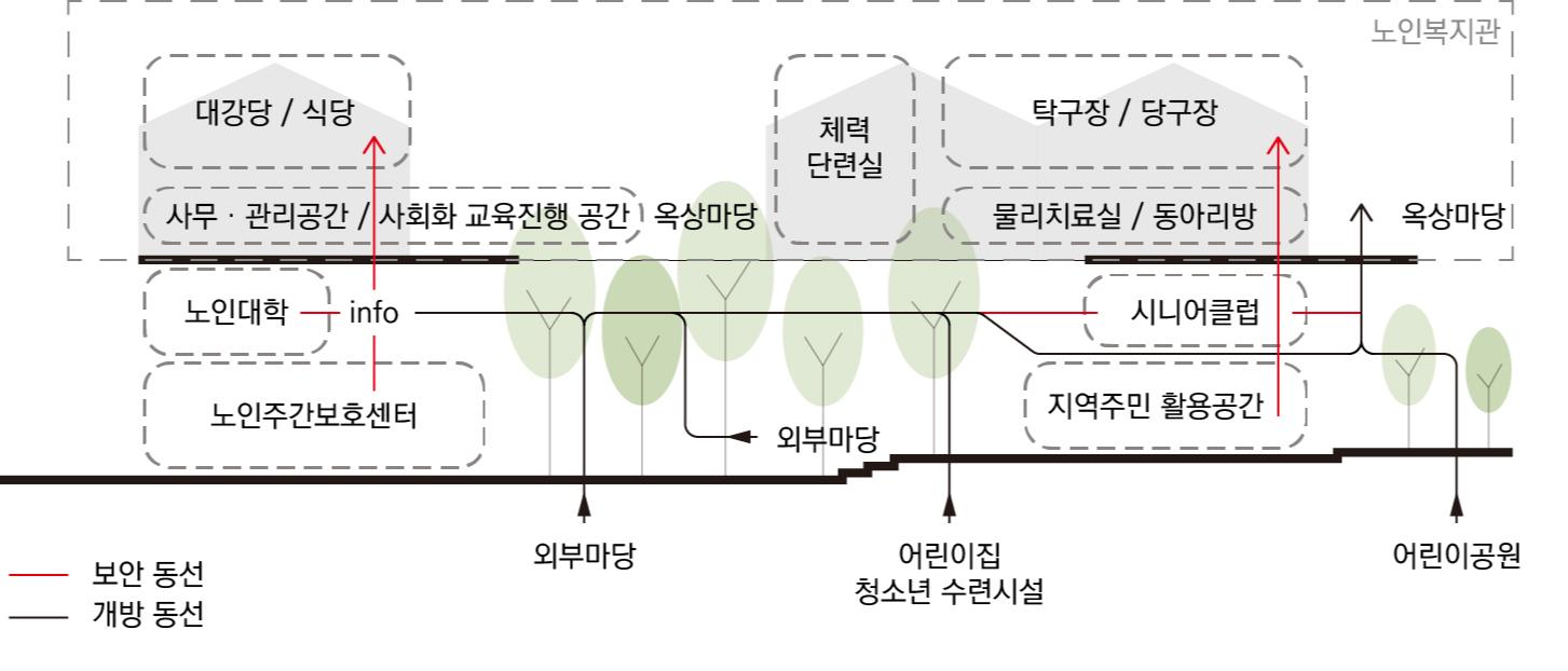 저층부는 지역주민들을 위한 마주침 공간을 품고 있으며, 대지와 연접하여 유치원과 청소년시설이 같은 블록을 함께 공유하고 있다. 다양한 세대 간 교류를 유발할 수 있는 유기적 통합 구성이 필요하다. 중심축을 따라 세 영역을 연결하고 하나의 대지로 인식되게 한다.