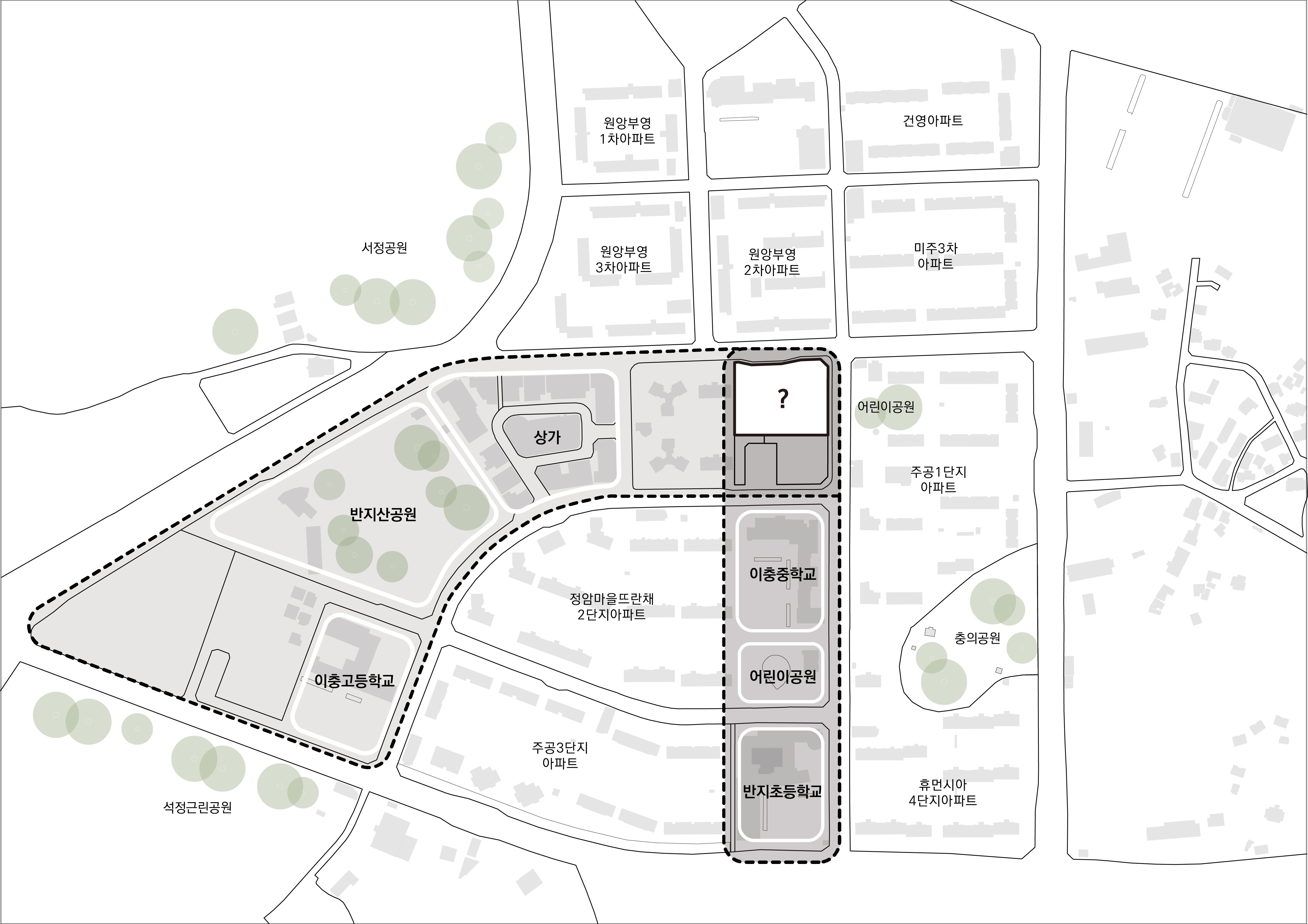 평택 북부노인복지시설이 들어설 부지는 남북축을 따라 어린이공원, 초·중학교, 유치원, 청소년시설이 들어서는 공공부지의 끝단에 위치한다. 또한, 서쪽으로부터 반지산 공원, 상가지역으로 이어지는 중심 생활가로와 면해 있다. 남북과 동서방향의 주요 가로축이 교차하는 지점에 들어서게 될 노인복지관의 대지는 어떤 성격을 가져야 할까? 대지를 둘러싸고 있는 주변영역은 모두 사적인 아파트 단지로 구성되어 있어 노인복지관의 대지는 모두가 향유할 수 있는 열린 공간의 태도가 필연적이다.