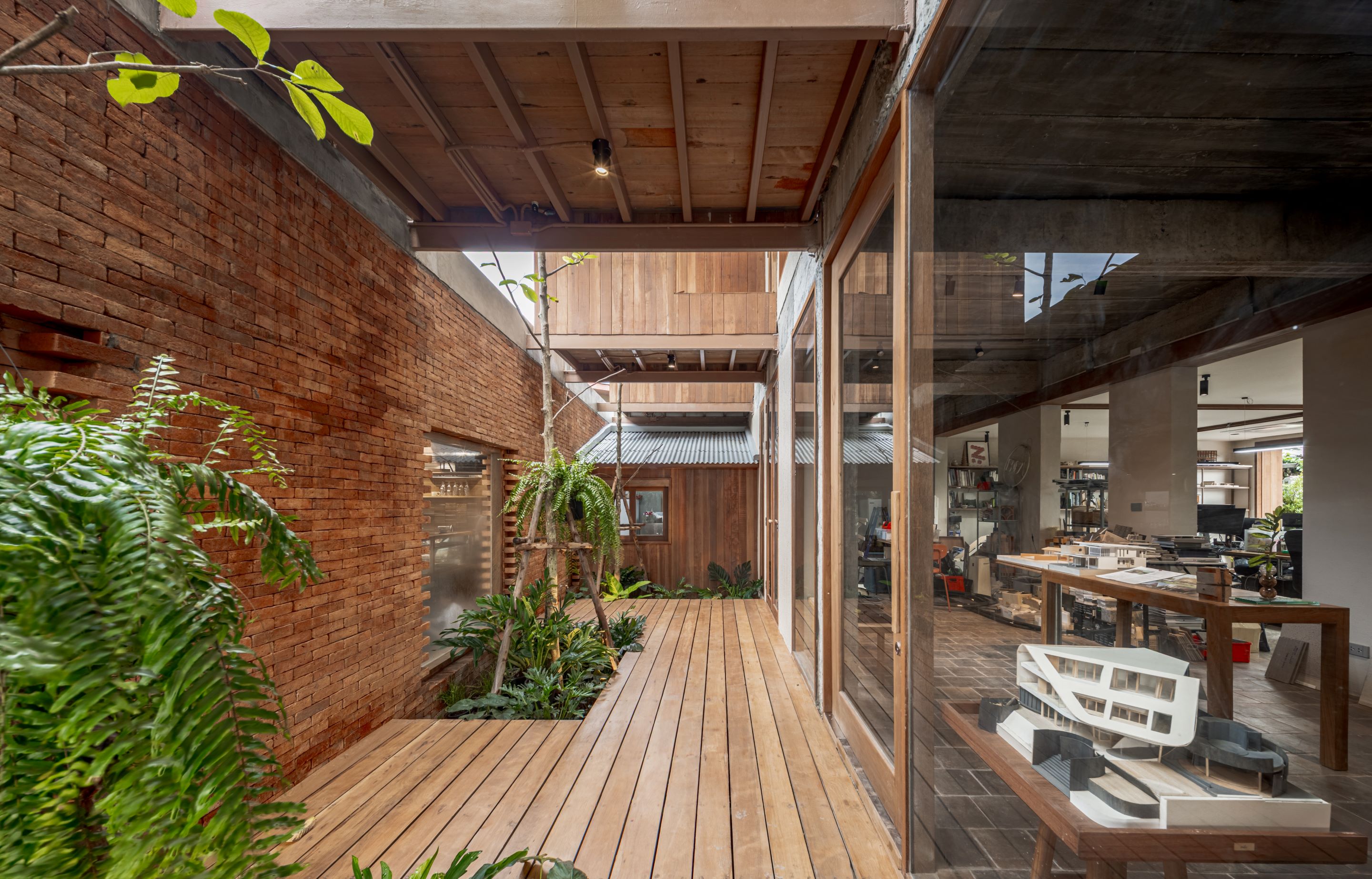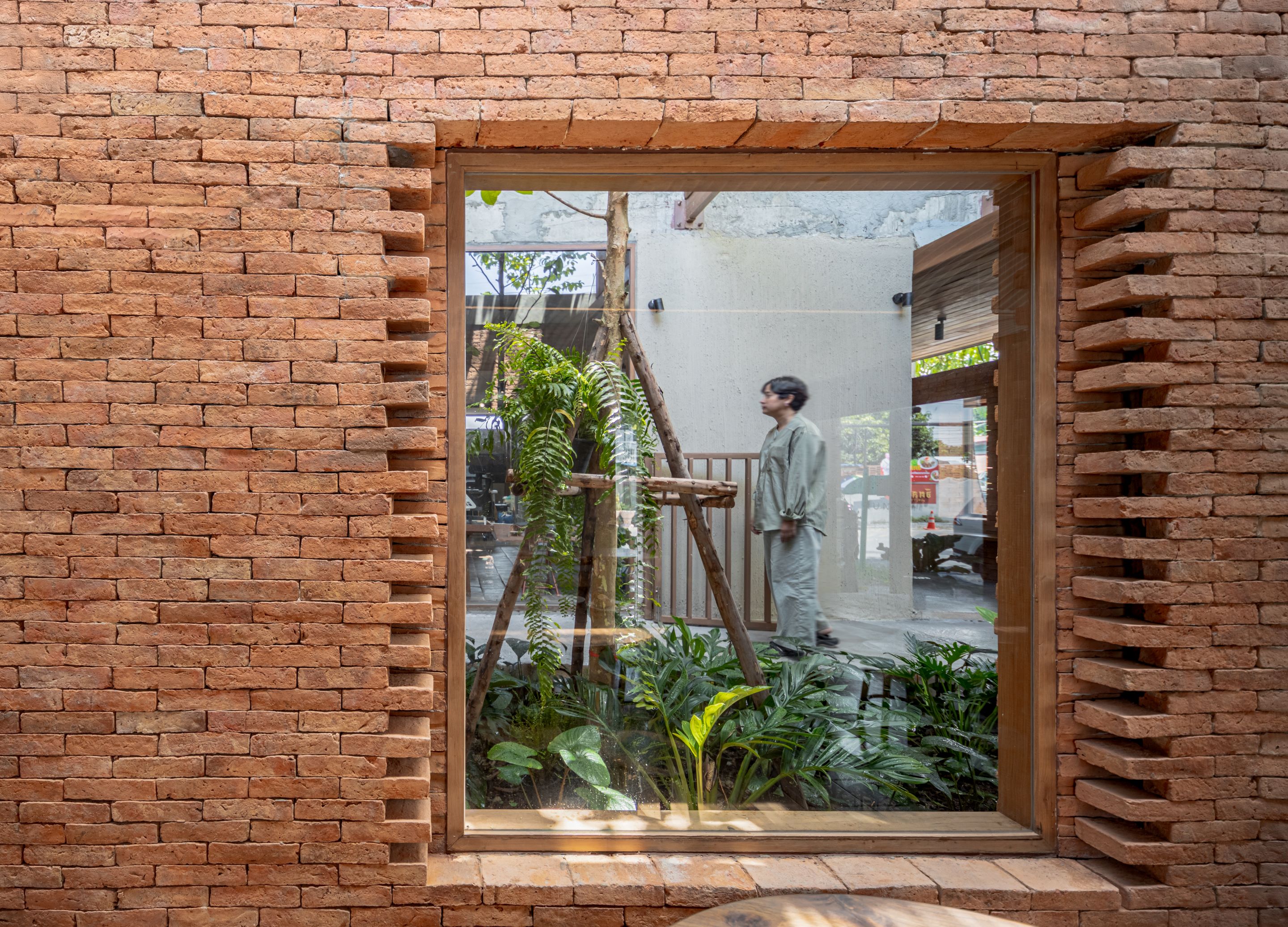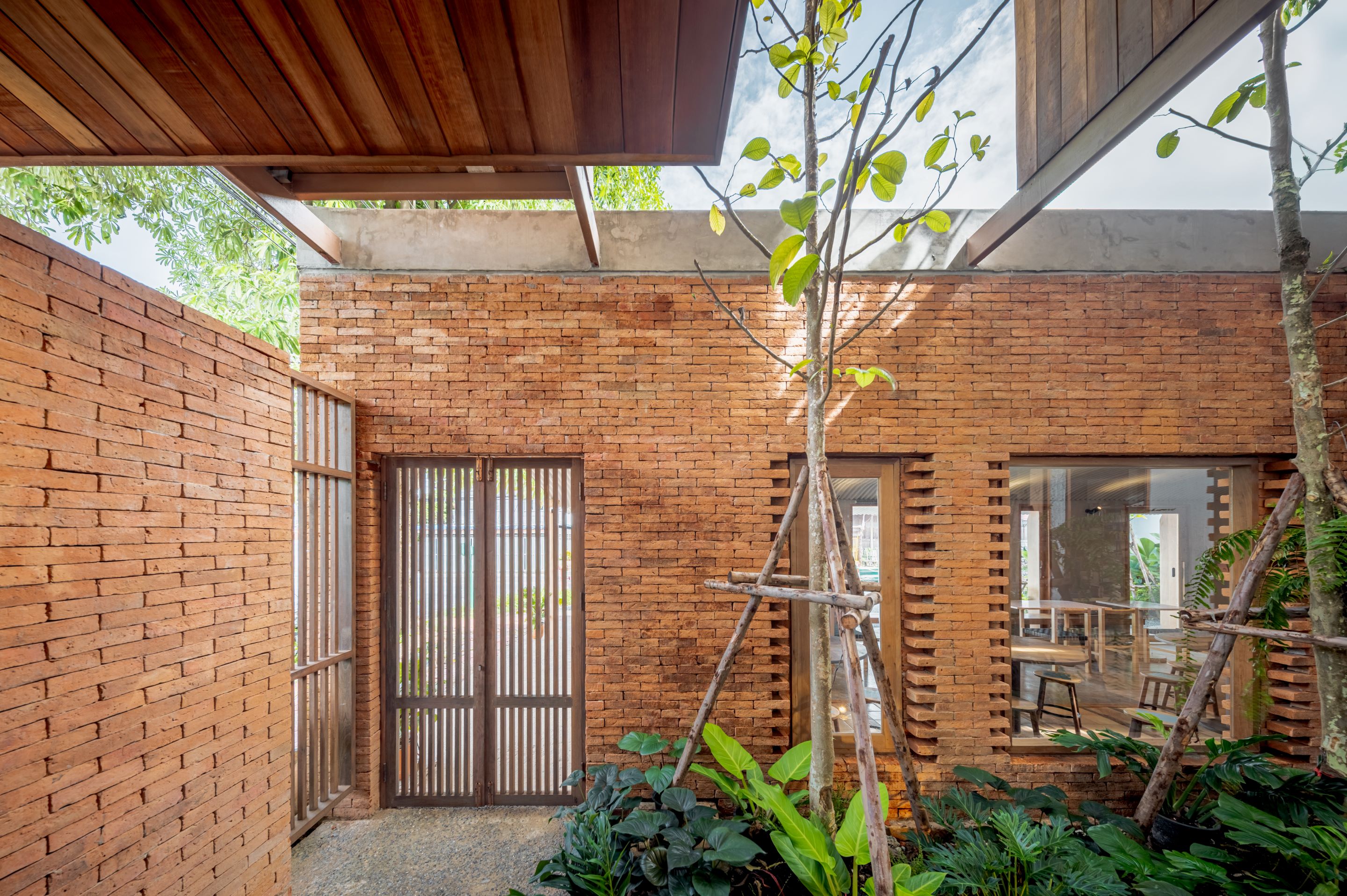 마감은 아유타야의 지역성을 담은 재료로 완성됐다. 현지에서 제작된 벽돌과 목재는 목재 무역로, 벽돌 가마, 장인들의 손길로 대표되는 아유타야의 기억을 환기한다. 이 재료들은 완벽함보다는 진정성을 중시해 선택됐고, 불완전한 흔적조차 인간의 의도와 배움을 드러낸다. 시공 과정 자체가 하나의 이야기로 남으며, 지역 지식과 장인정신을 존중하는 태도를 보여준다.
