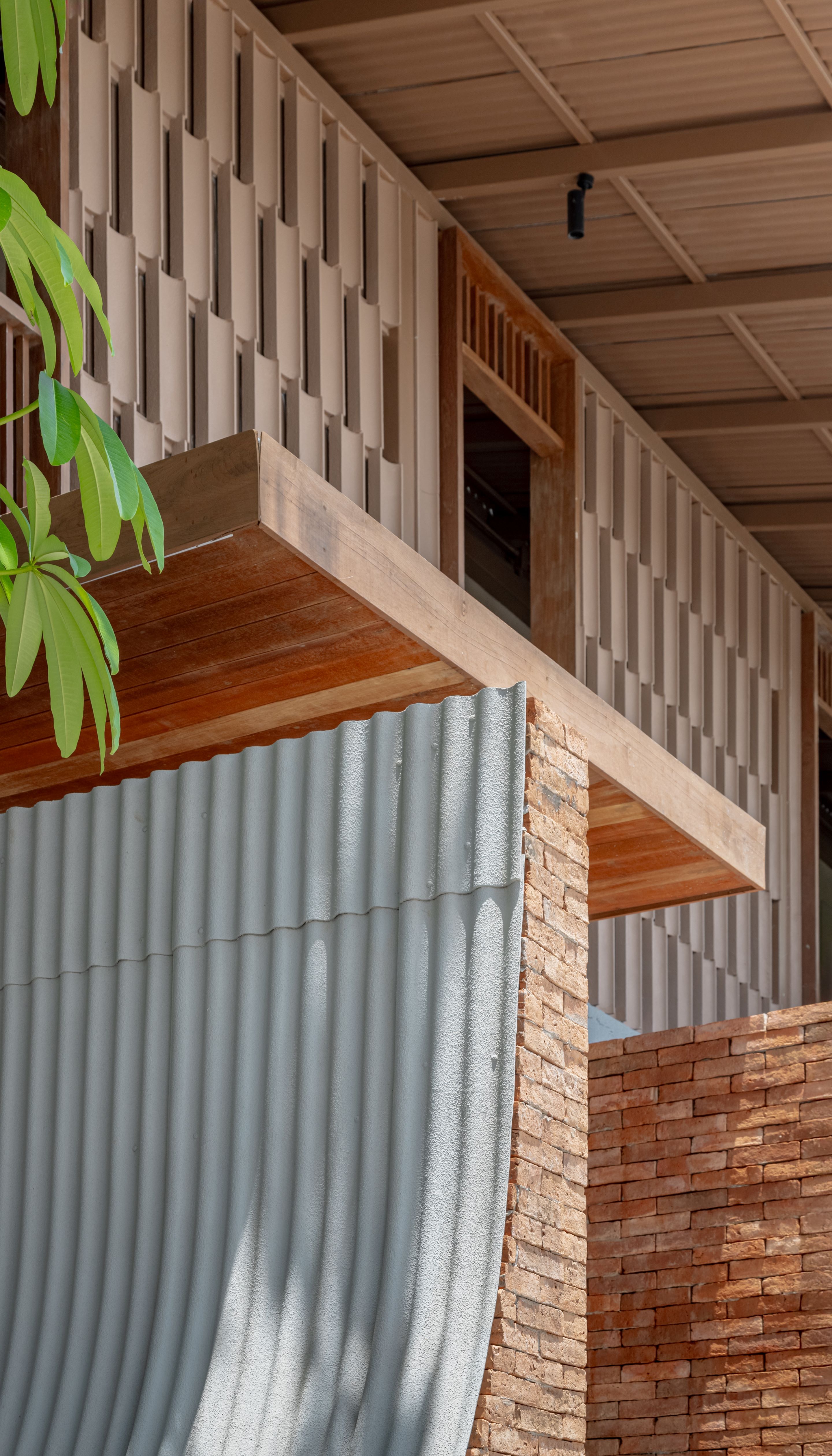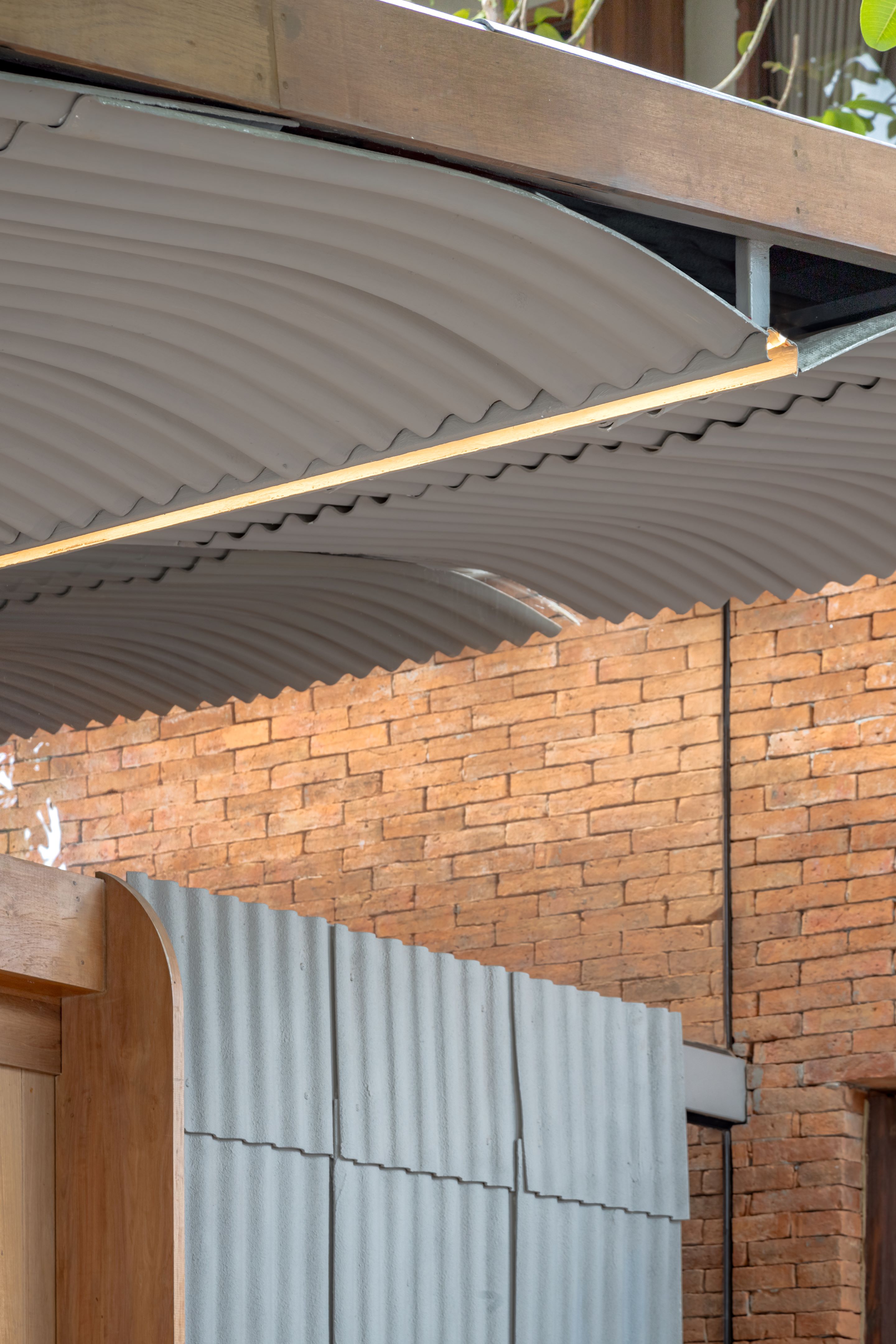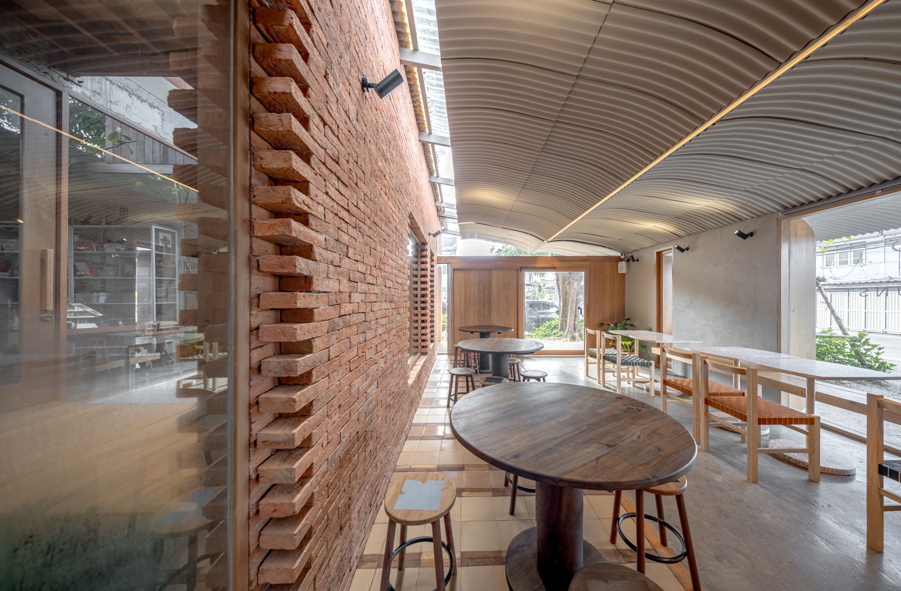 디자인은 아유타야의 일상적 건축에서 차용한 이미지와 재료에서 출발한다. 전통 가옥 처마에서 흔히 볼 수 있는 작은 곡선의 골함석 지붕재가 대표적이다. 이 재료는 지붕이 아닌 파사드, 천장, 경계벽의 마감재로 새롭게 사용되며, 단순한 기능을 넘어 역사와 기억, 의도를 담아내는 서사적 장치로 확장됐다.
